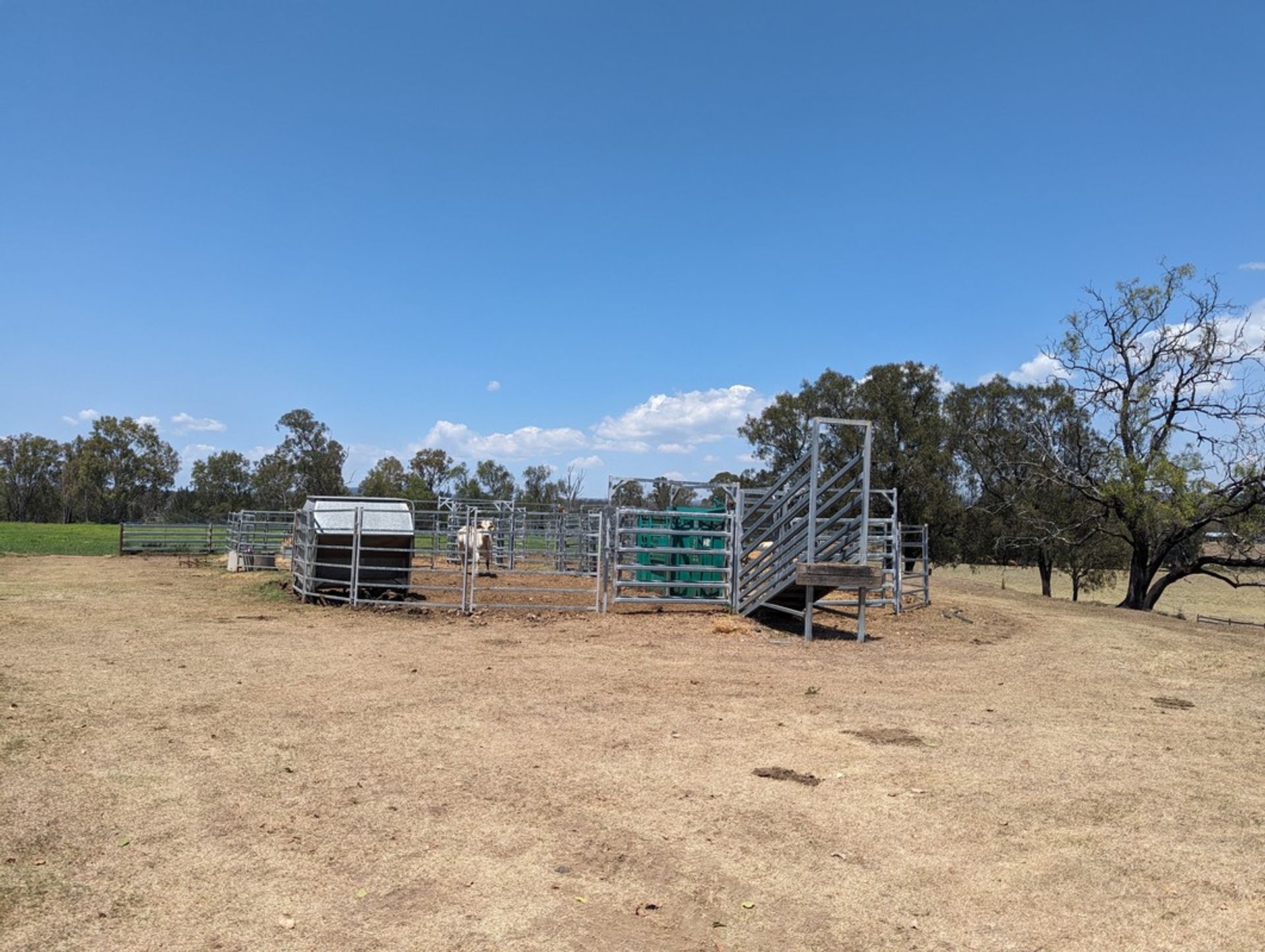 -Steel cattle yards with loading ramp, vet crush, concrete trough.