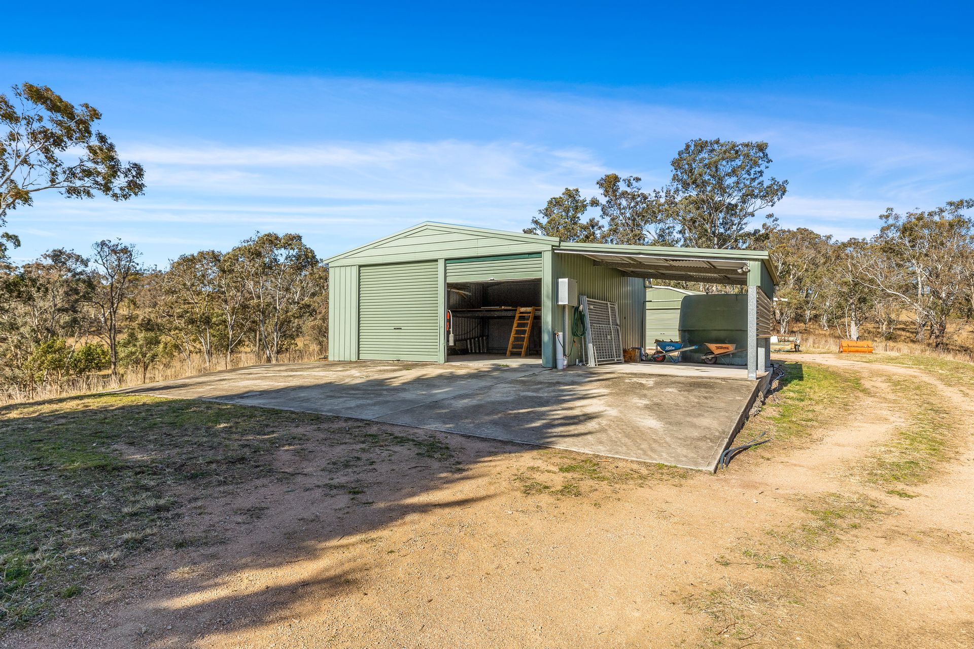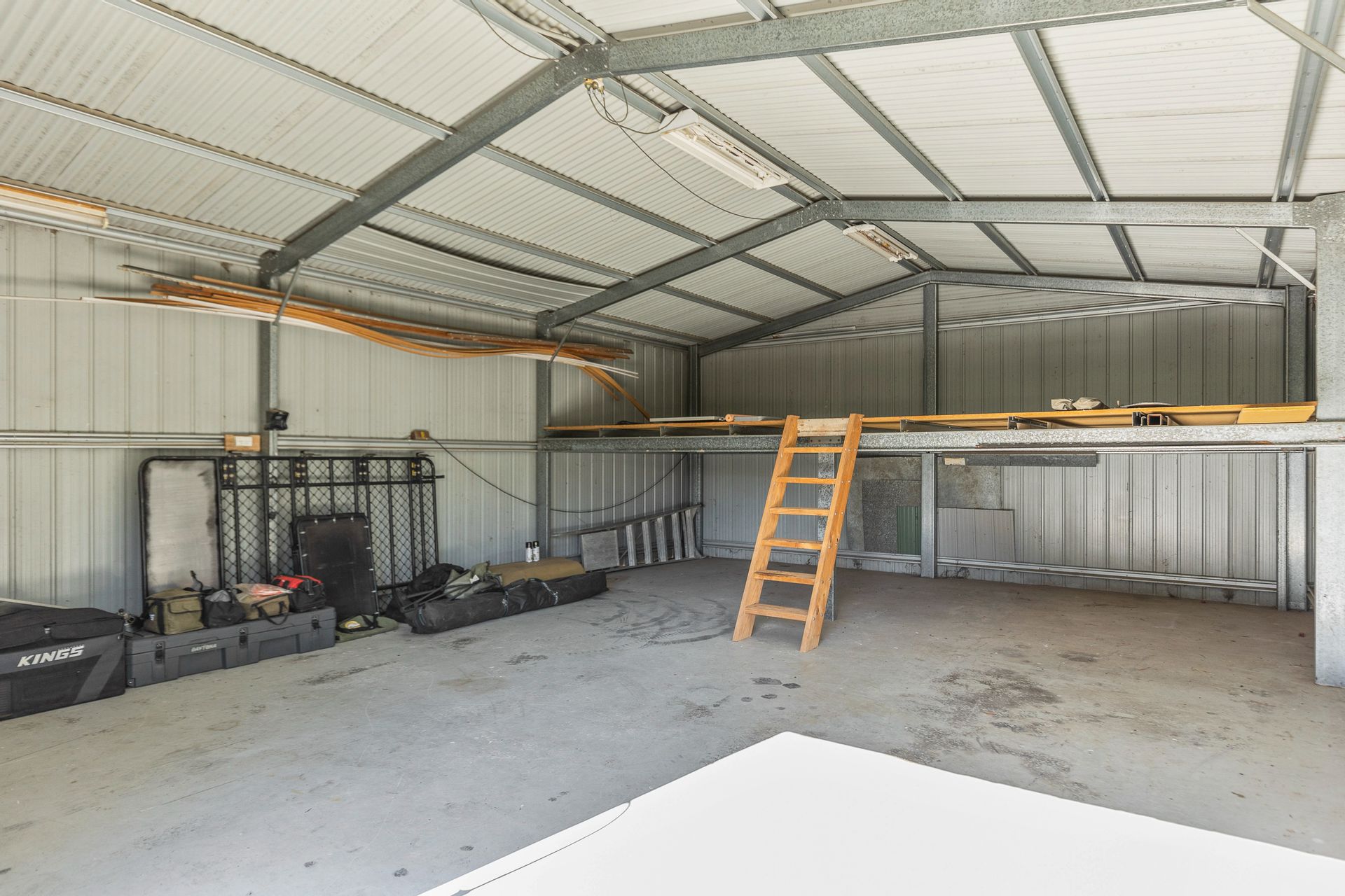 • Two bay lock-up shed, with mezzanine storage, concrete floor & power and open skillion bay attached