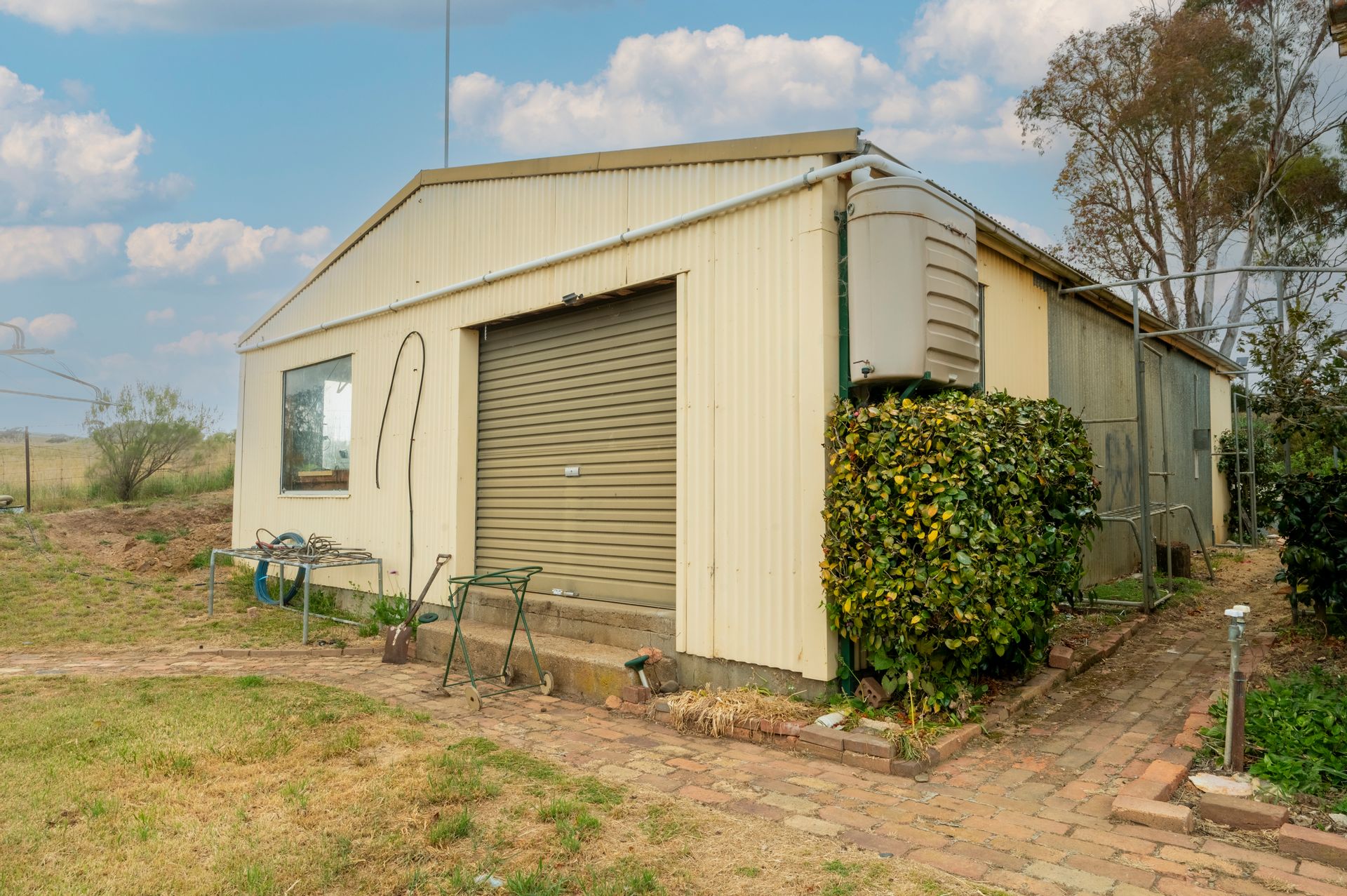• There is also a large work shed 8 metres x 11 metres , could easily accommodate 4 cars, with three roller doors, mezzanine level for storage, workbenches, plenty of shelving and a pot belly heater, the perfect "man" shed