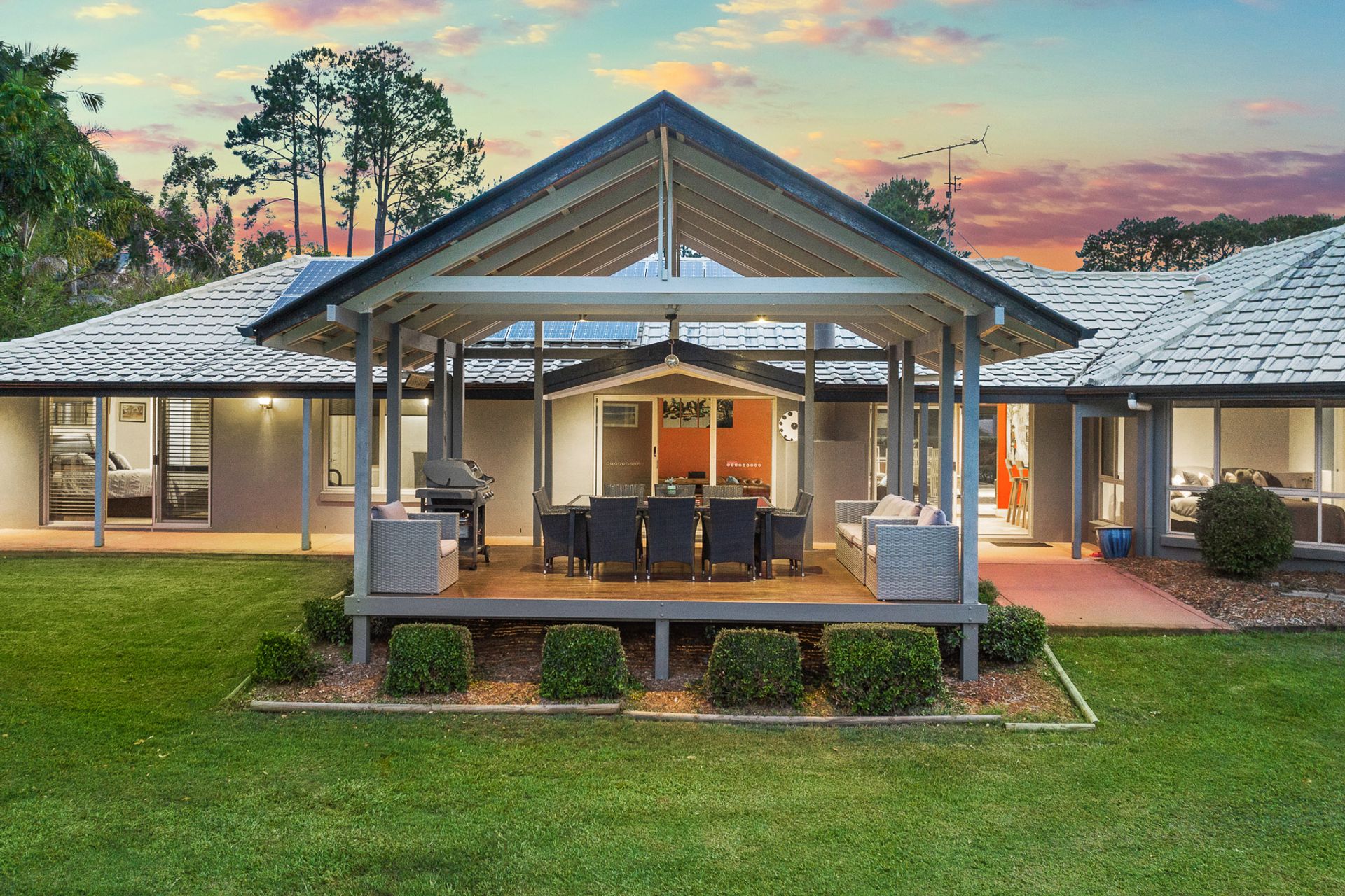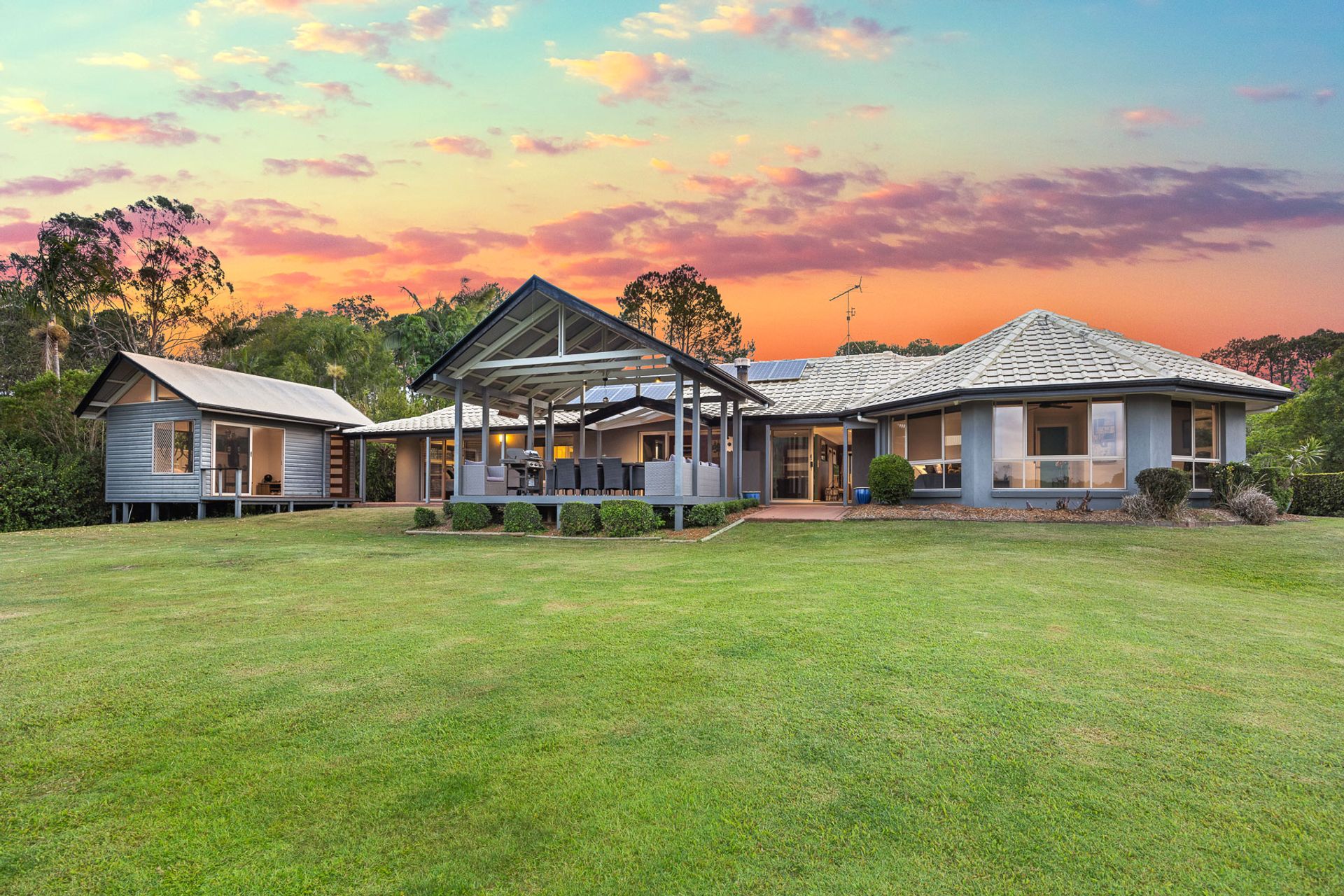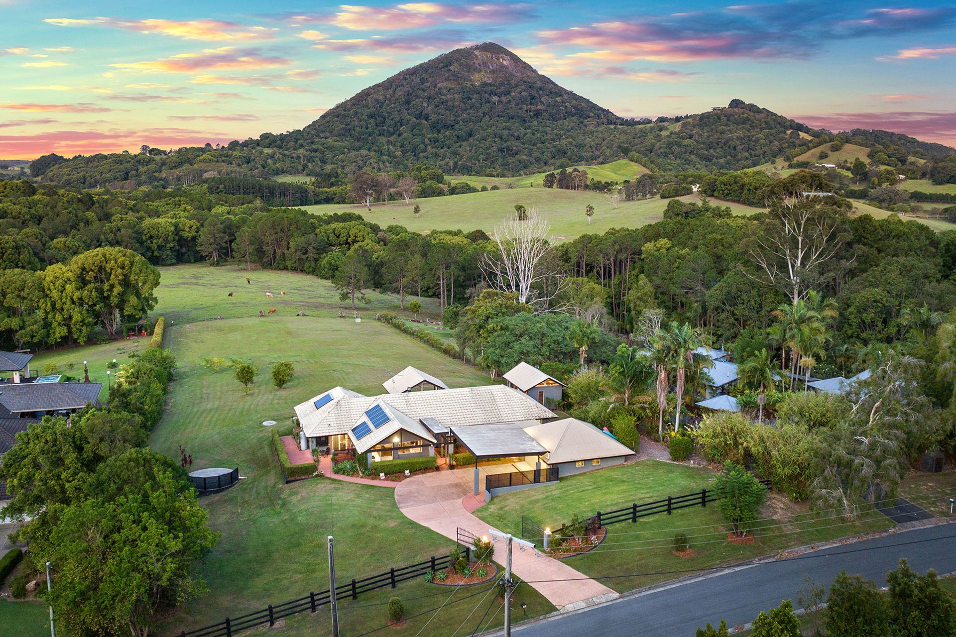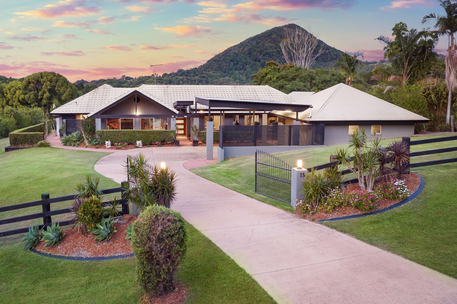 Situated in the foothills of the majestic Mount Cooroy, this exceptional property is a haven of tranquility and natural beauty. Nestled within a quiet sealed cul-de-sac, the property spans an impressive 1.68 acres of meticulously manicured lawns, offering an unparalleled sense of space and privacy. Upon entering the property through the gated driveway, residents and guests are greeted by a breathtaking panorama of Mount Cooroy. The immaculate grounds that embrace the single-story home create an idyllic setting, enhancing the overall allure of this mountain retreat. The residence, thoughtfully designed and positioned, boasts a spacious layout with distinct living areas that seamlessly flow together. The central kitchen serves as the heart of the home, offering a hub for culinary creativity and communal gatherings. Expansive windows throughout the residence frame the stunning mountain backdrop, bringing the outdoors in and allowing natural light to illuminate the interiors. Designed for those who appreciate the beauty of nature, the property boasts seamless indoor-outdoor living spaces. The large entertainment pavilion, strategically placed to capture the panoramic views, provides an ideal venue for al fresco dining, relaxation, and entertaining. Whether enjoying a quiet morning coffee or hosting soirées with friends and family, the outdoor spaces are tailored for a lifestyle of leisure. The home features five well-appointed bedrooms and three bathrooms, providing ample space for both residents and guests. Additionally, a separate studio, currently utilized as a home gym, offers flexibility for various lifestyle needs. For those seeking a property that harmonizes with the natural beauty of the Noosa Hinterland, this residence offers an unparalleled opportunity. The combination of its elevated yet almost level 1.68 acres, coupled with the extraordinary mountain views, makes it a rare gem in this sought-after region.