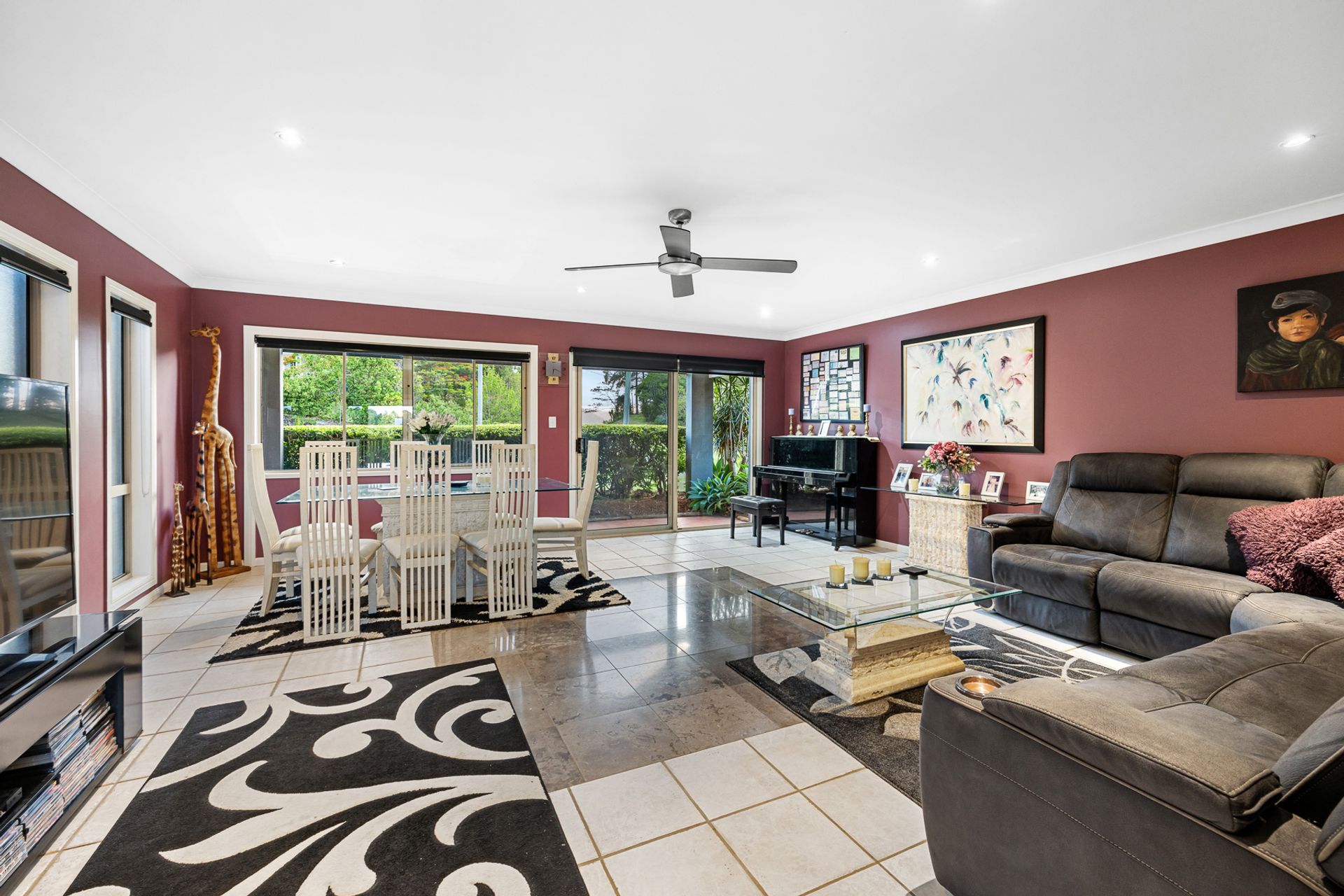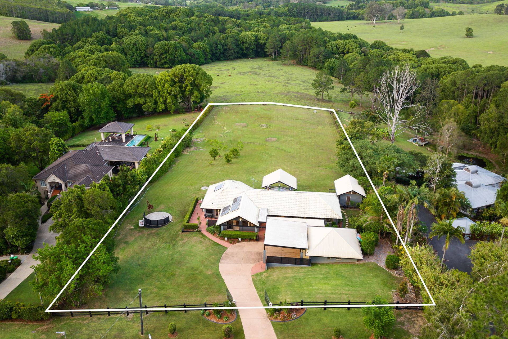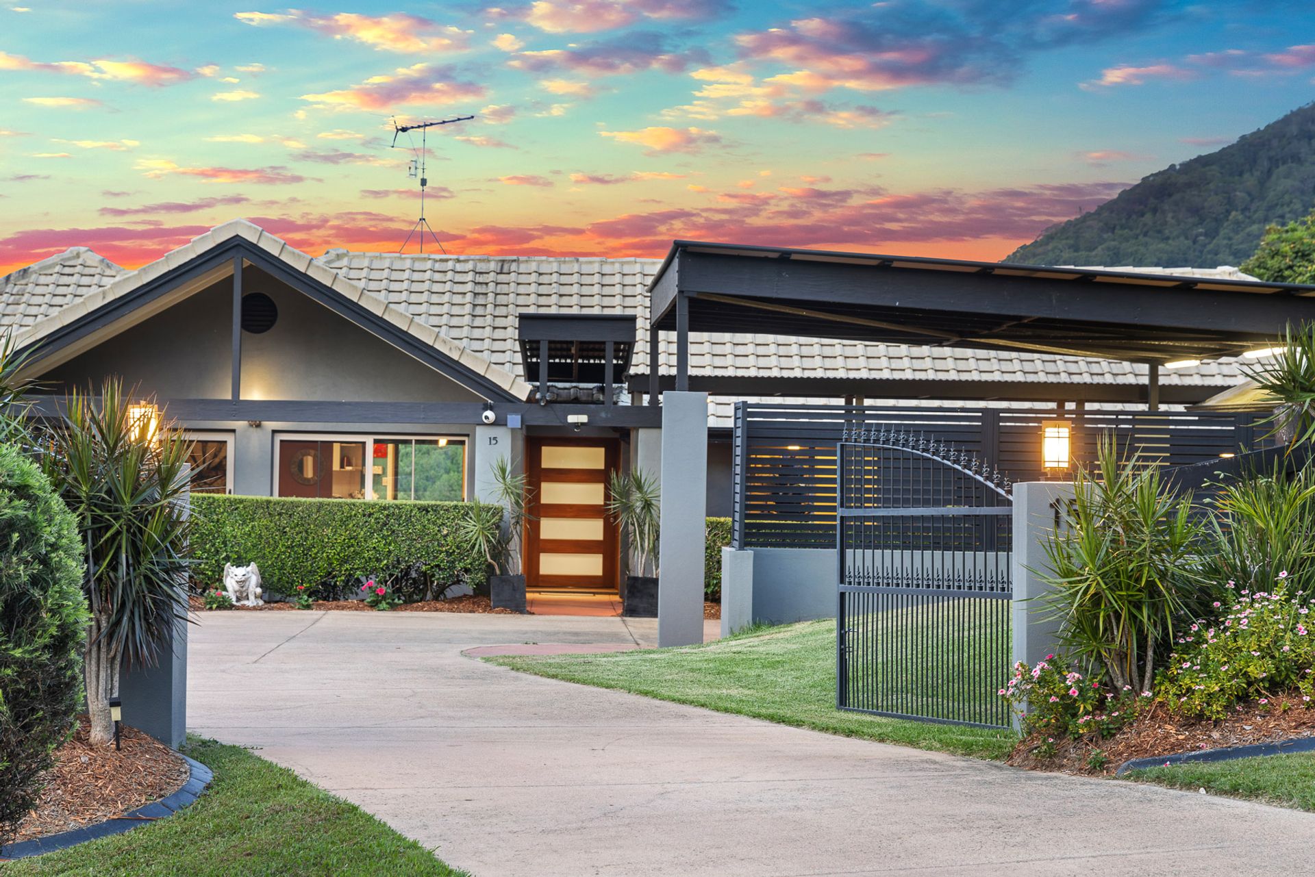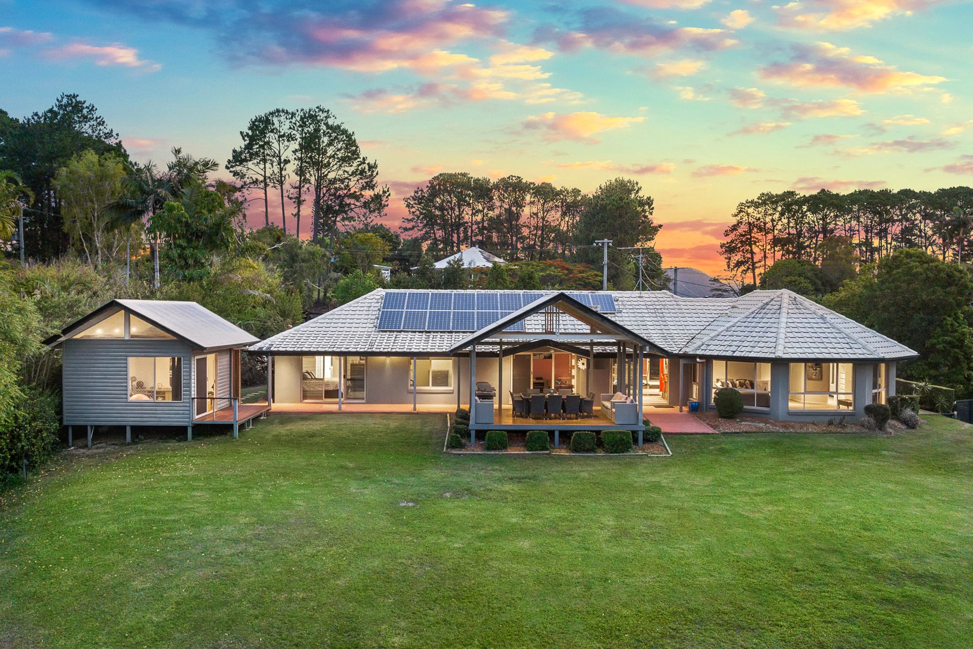 Situated in the foothills of the majestic Mount Cooroy, this exceptional property is a haven of tranquility and natural beauty. Nestled within a quiet sealed cul-de-sac, the property spans an impressive 1.68 acres of meticulously manicured lawns, offering an unparalleled sense of space and privacy. Upon entering the property through the gated driveway, residents and guests are greeted by a breathtaking panorama of Mount Cooroy. The immaculate grounds that embrace the single-story home create an idyllic setting, enhancing the overall allure of this mountain retreat. The residence, thoughtfully designed and positioned, boasts a spacious layout with distinct living areas that seamlessly flow together. The central kitchen serves as the heart of the home, offering a hub for culinary creativity and communal gatherings. Expansive windows throughout the residence frame the stunning mountain backdrop, bringing the outdoors in and allowing natural light to illuminate the interiors. Designed for those who appreciate the beauty of nature, the property boasts seamless indoor-outdoor living spaces. The large entertainment pavilion, strategically placed to capture the panoramic views, provides an ideal venue for al fresco dining, relaxation, and entertaining. Whether enjoying a quiet morning coffee or hosting soirées with friends and family, the outdoor spaces are tailored for a lifestyle of leisure. The home features five well-appointed bedrooms and three bathrooms, providing ample space for both residents and guests. Additionally, a separate studio, currently utilized as a home gym, offers flexibility for various lifestyle needs. For those seeking a property that harmonizes with the natural beauty of the Noosa Hinterland, this residence offers an unparalleled opportunity. The combination of its elevated yet almost level 1.68 acres, coupled with the extraordinary mountain views, makes it a rare gem in this sought-after region.