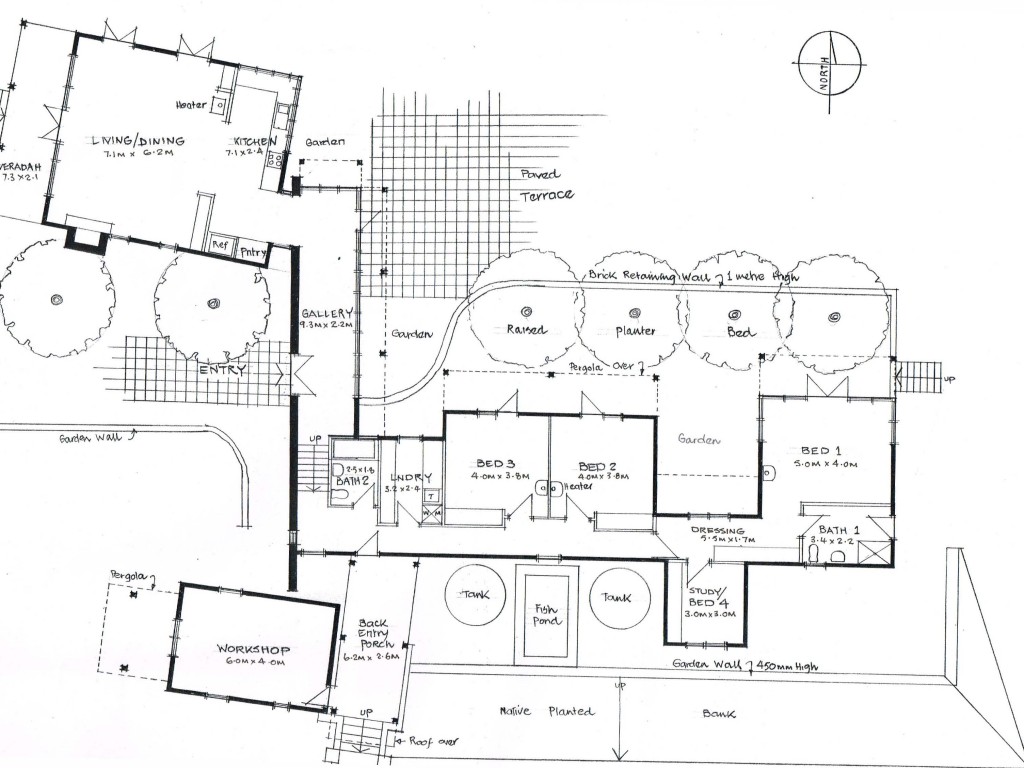A back entry porch connects the house to a 6 X 4 metre workshop. Beyond the garden is shedding for vehicles and machinery and the original shearing shed and yards.