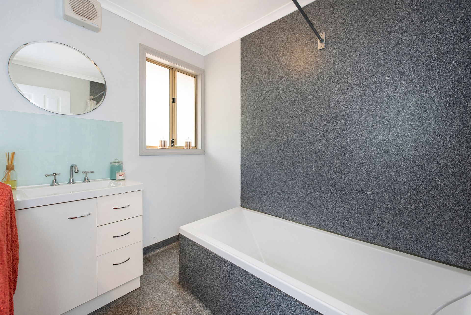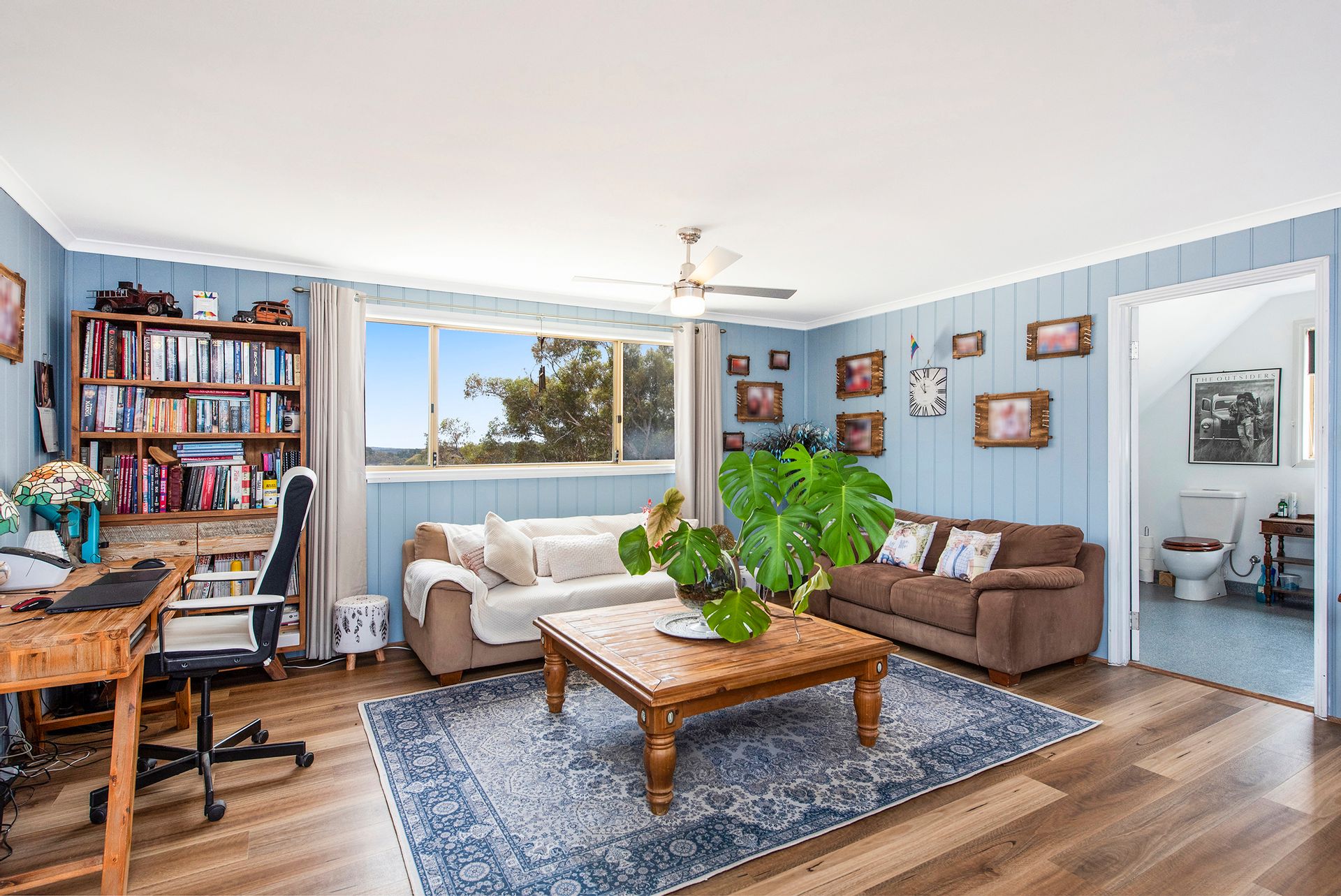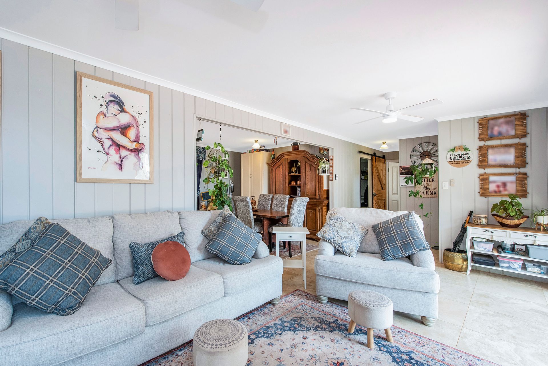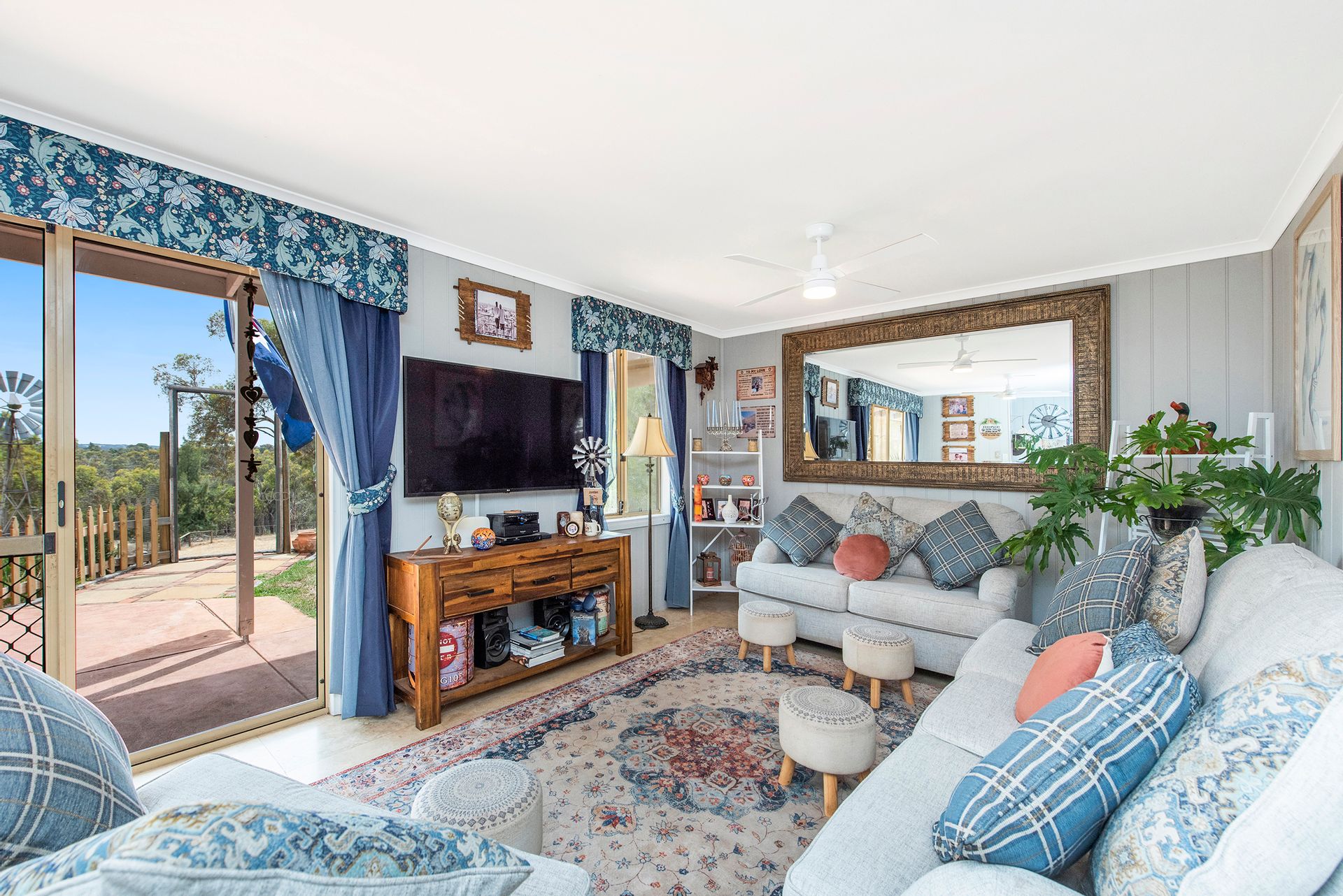 - Downstairs is the living room, with 600x600 tiles, ceiling fans, curtains and pelments, and sliding door leading to the alfresco area (more about that soon)