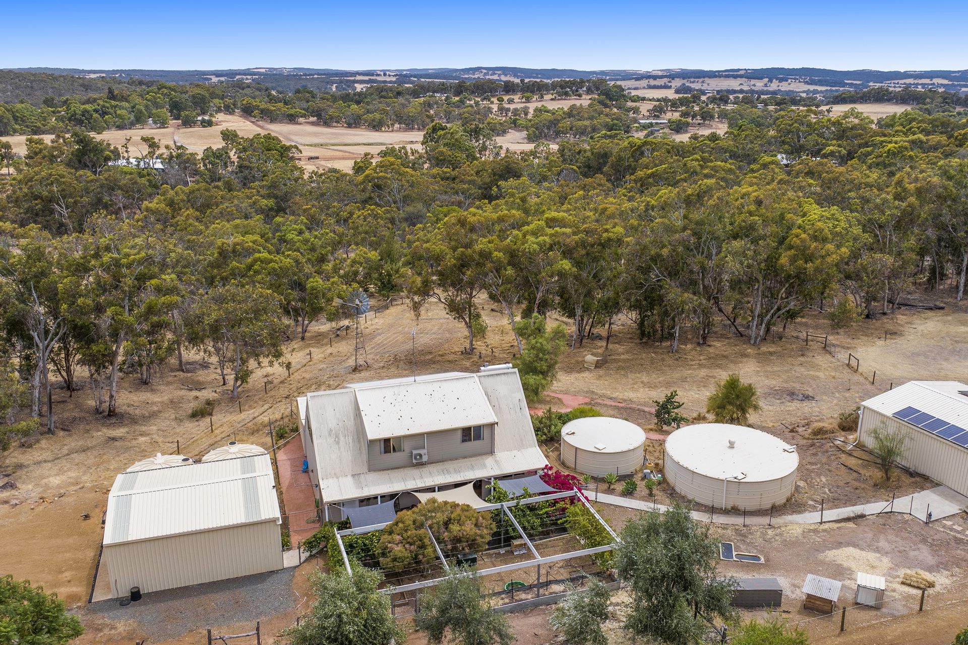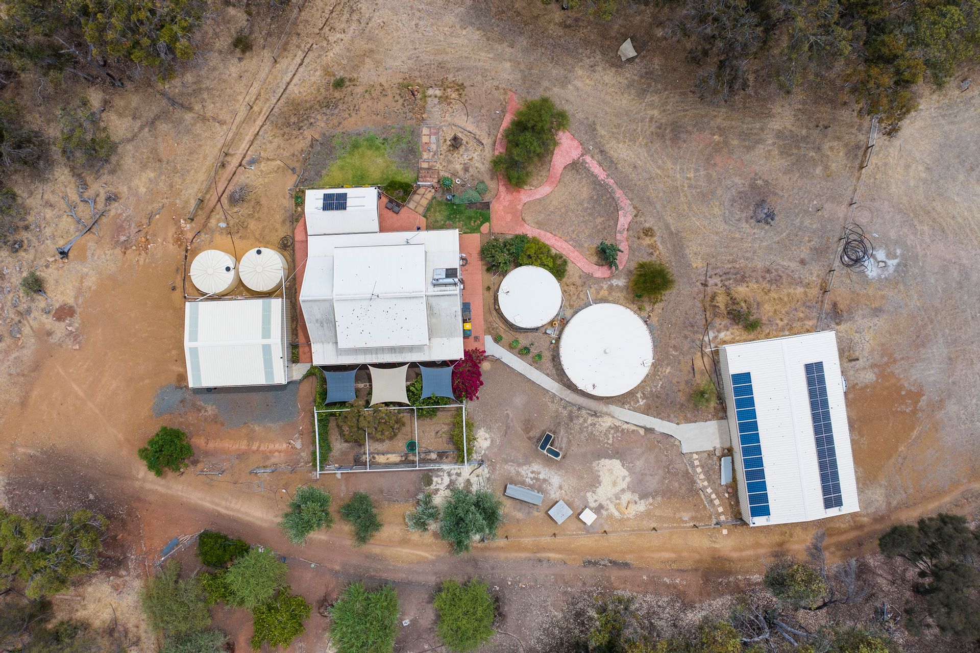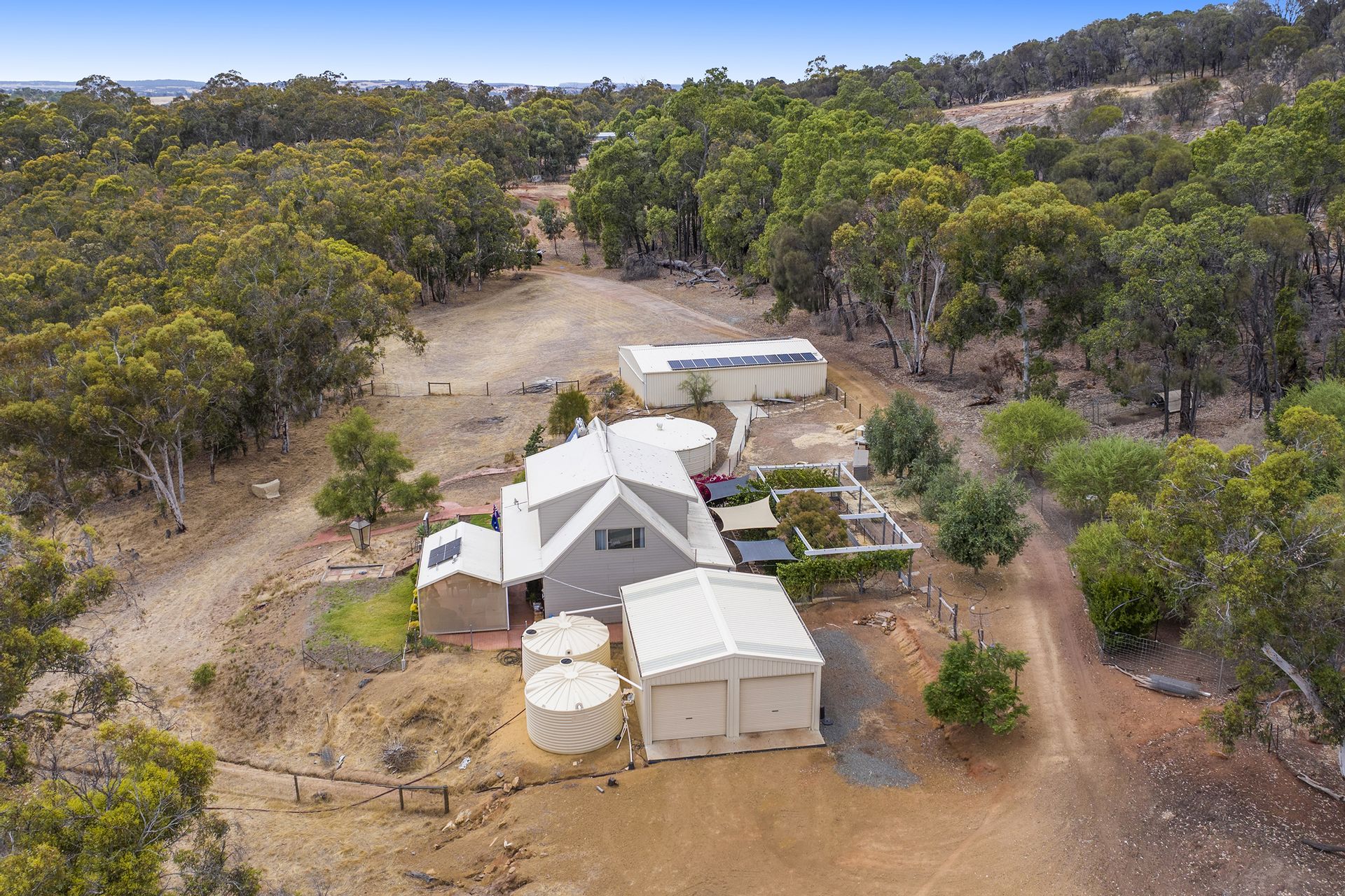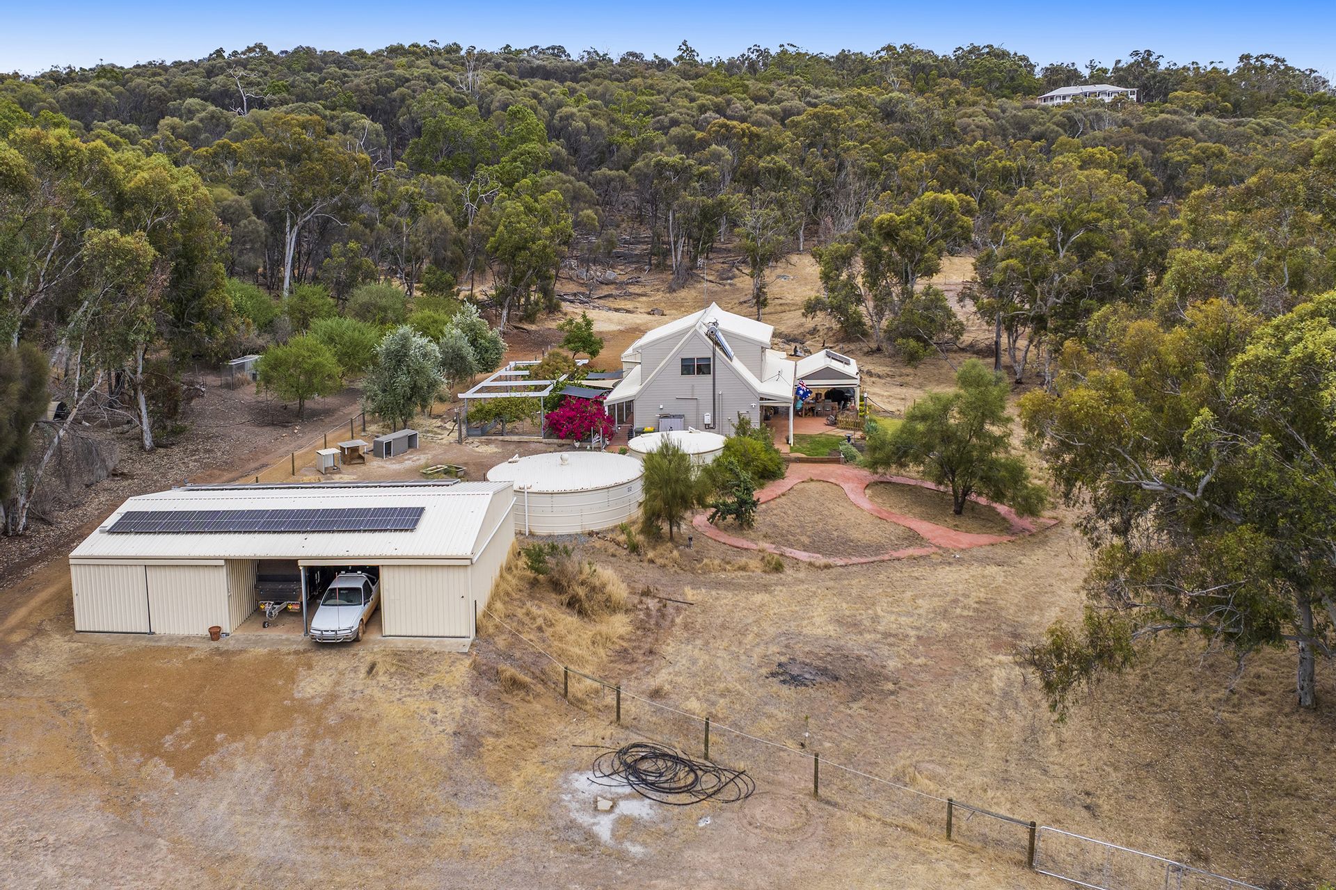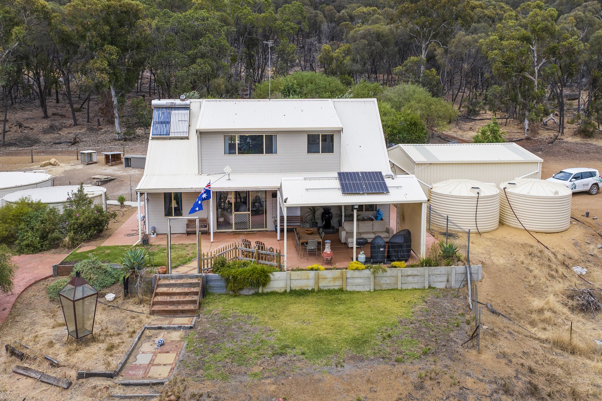 - Solar powered bore that pumps to two tanks off the 2 car garage.