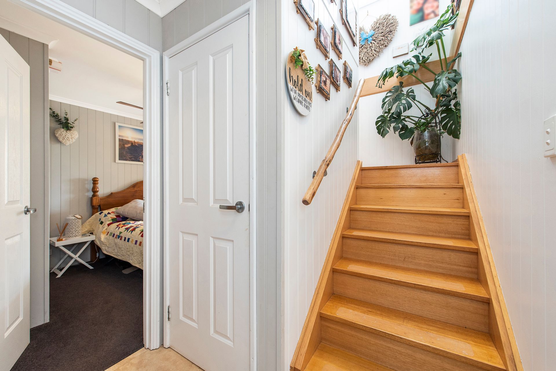 - Stairwell is polished wood flooring and handrail.
