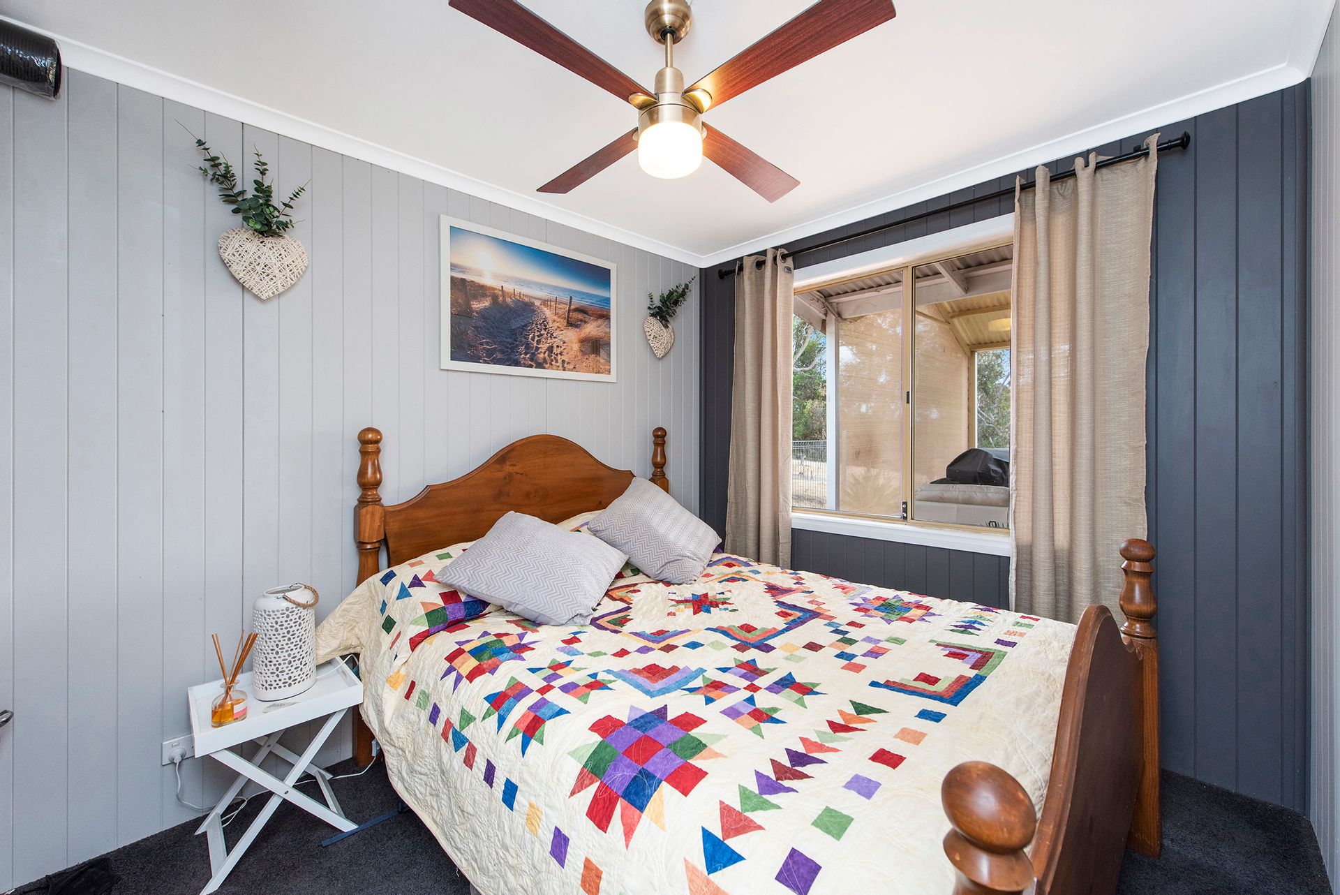 - Downstairs bedroom with carpet, curtains and ceiling fan.