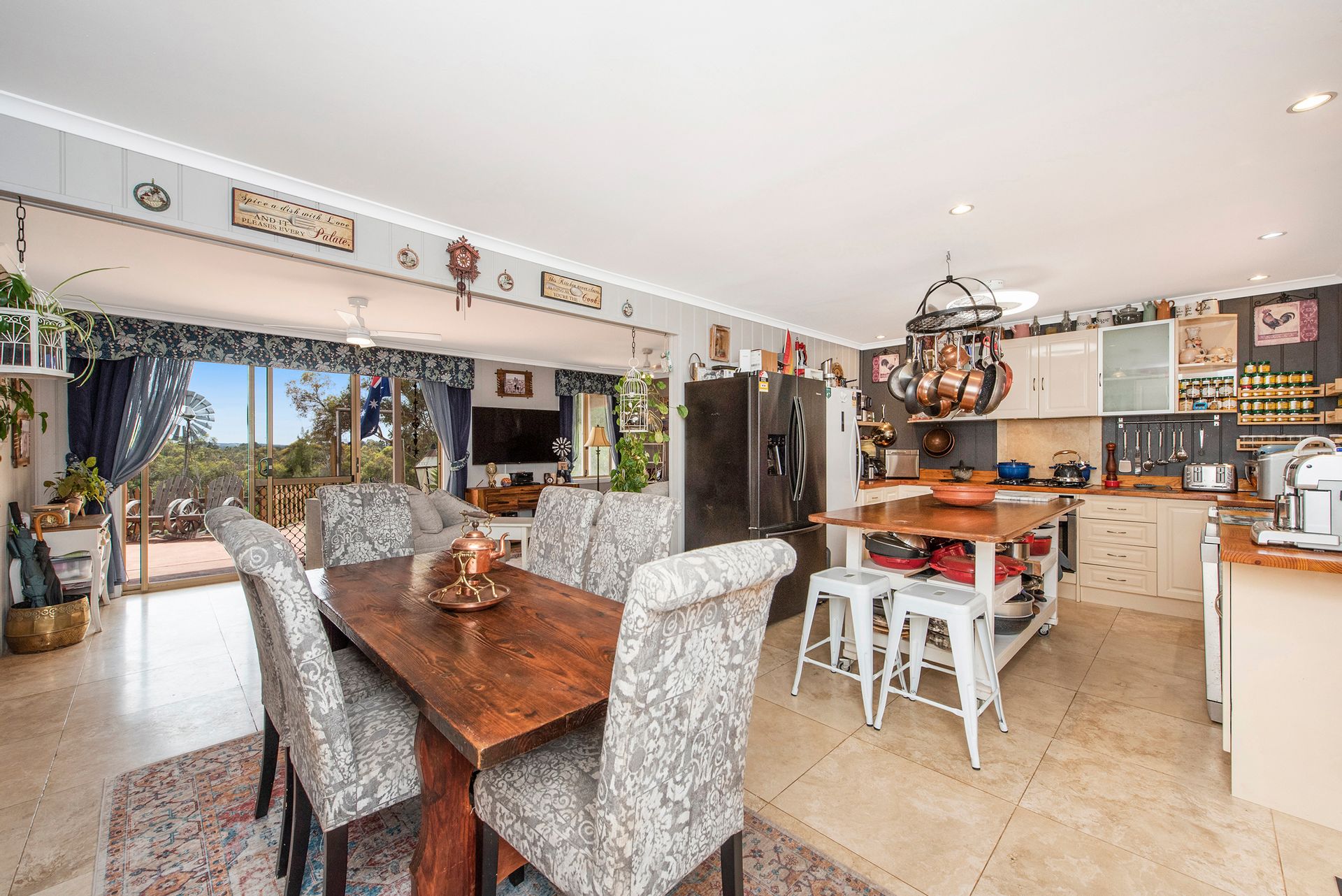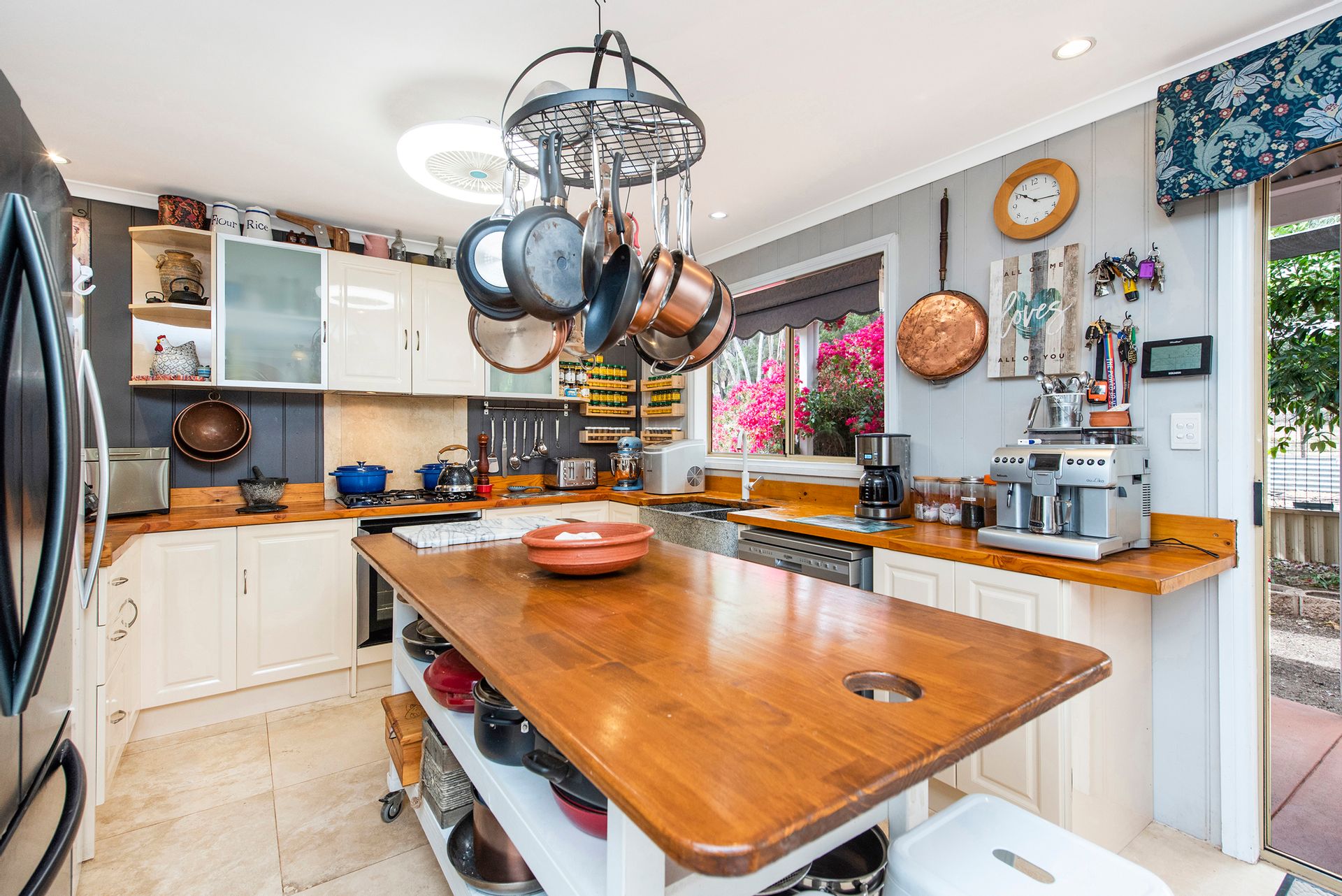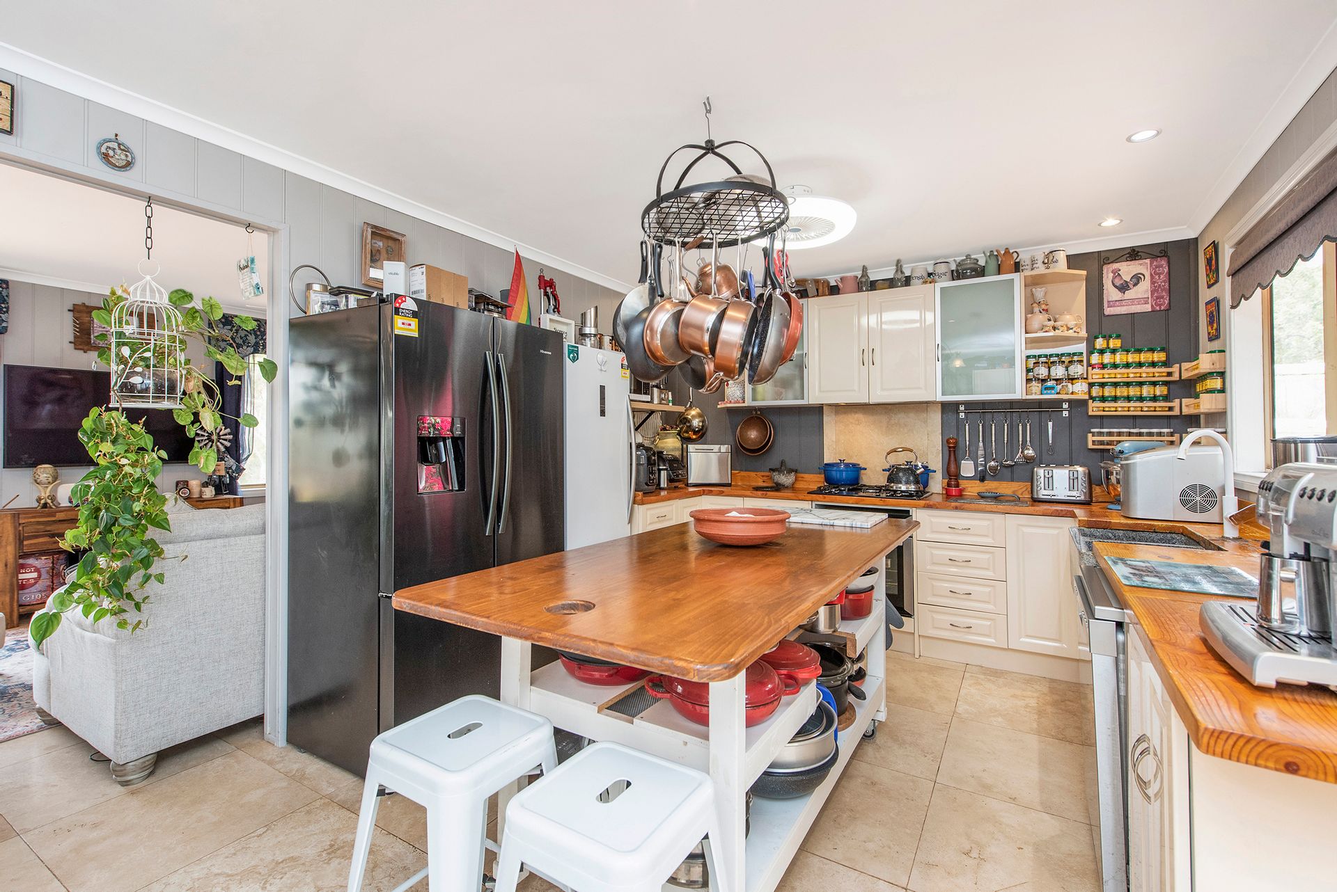 - Kitchen and meals is a great size. Kitchen offers solid wood benchtops, gas cooktop, under bench oven, dishwasher, stone sink, and space for side by side, double or large family fridge. the island bench in the centre of the kitchen is portable and may be included in the sale (if the price is right)