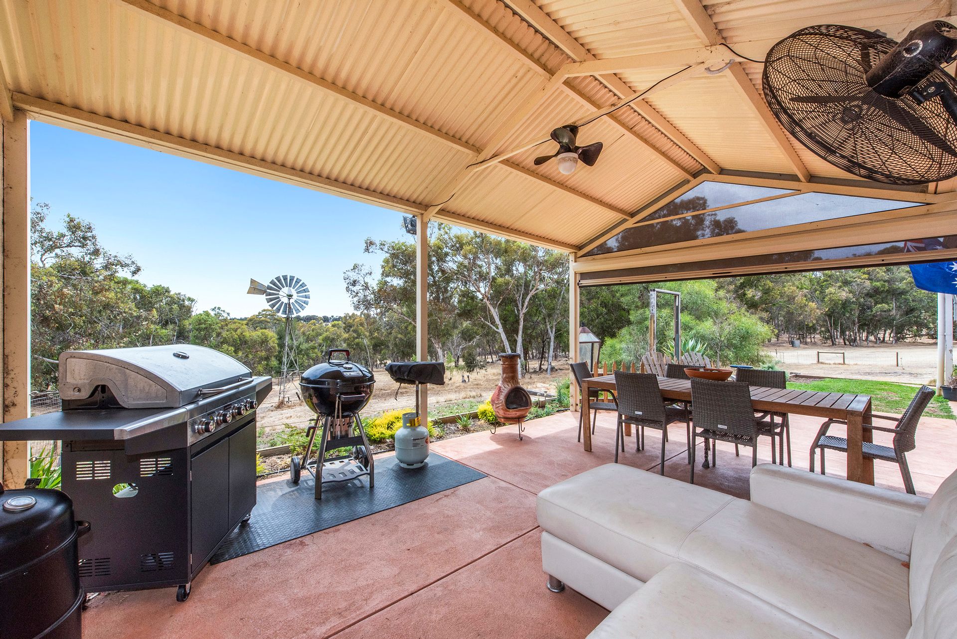 - Covered patio/alfresco area, ceiling fan, wall mounted fan, and café blind to the front , but also a patio to the rear.