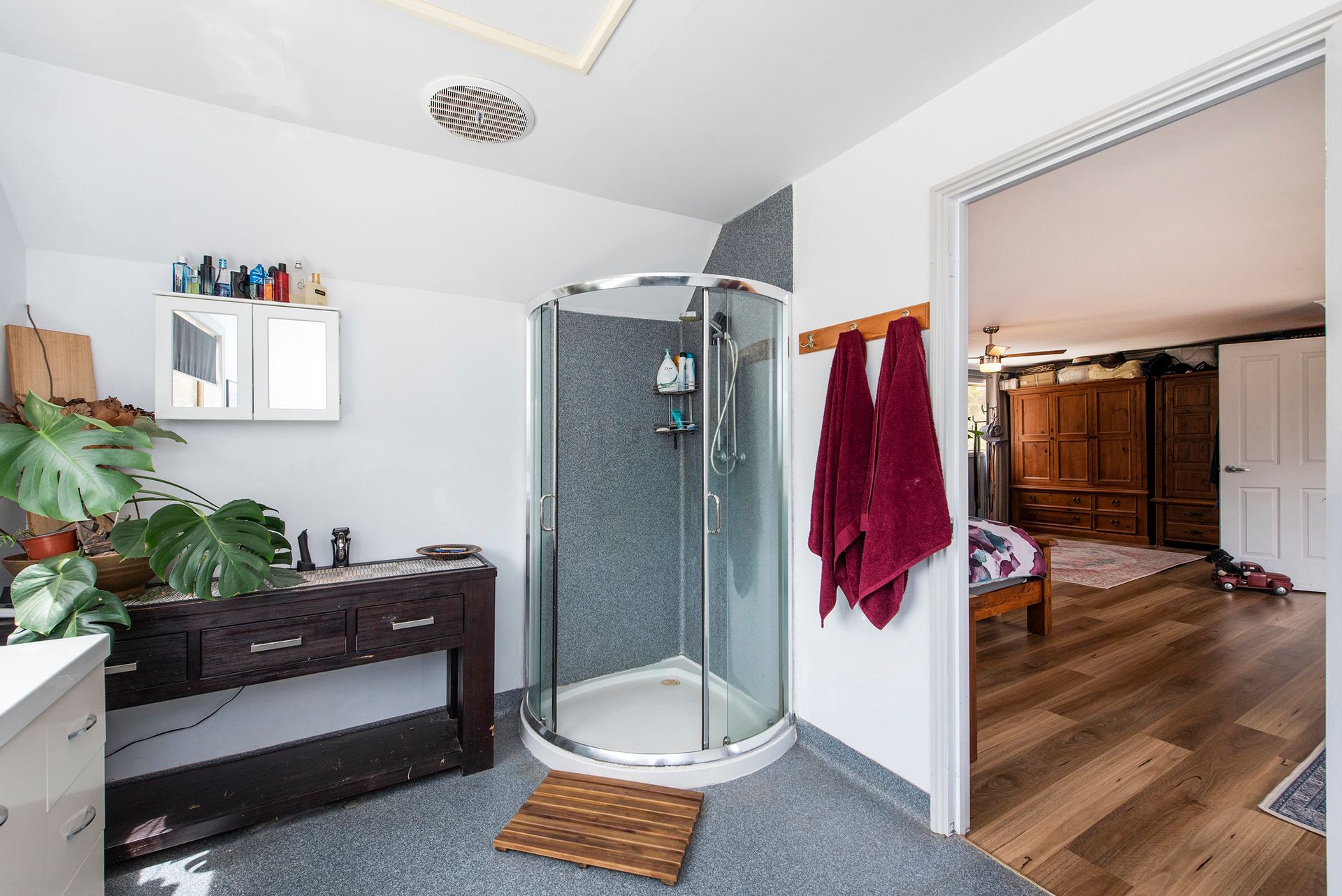 - En-suite features corner shower, vanity and toilet.
