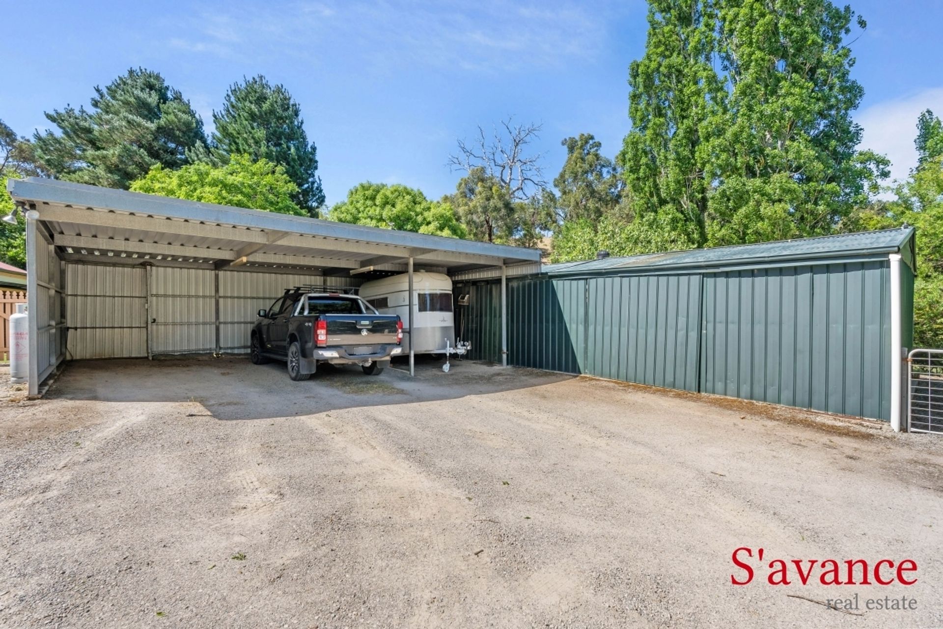 • Carport for 3 vehicles with gravel base.
