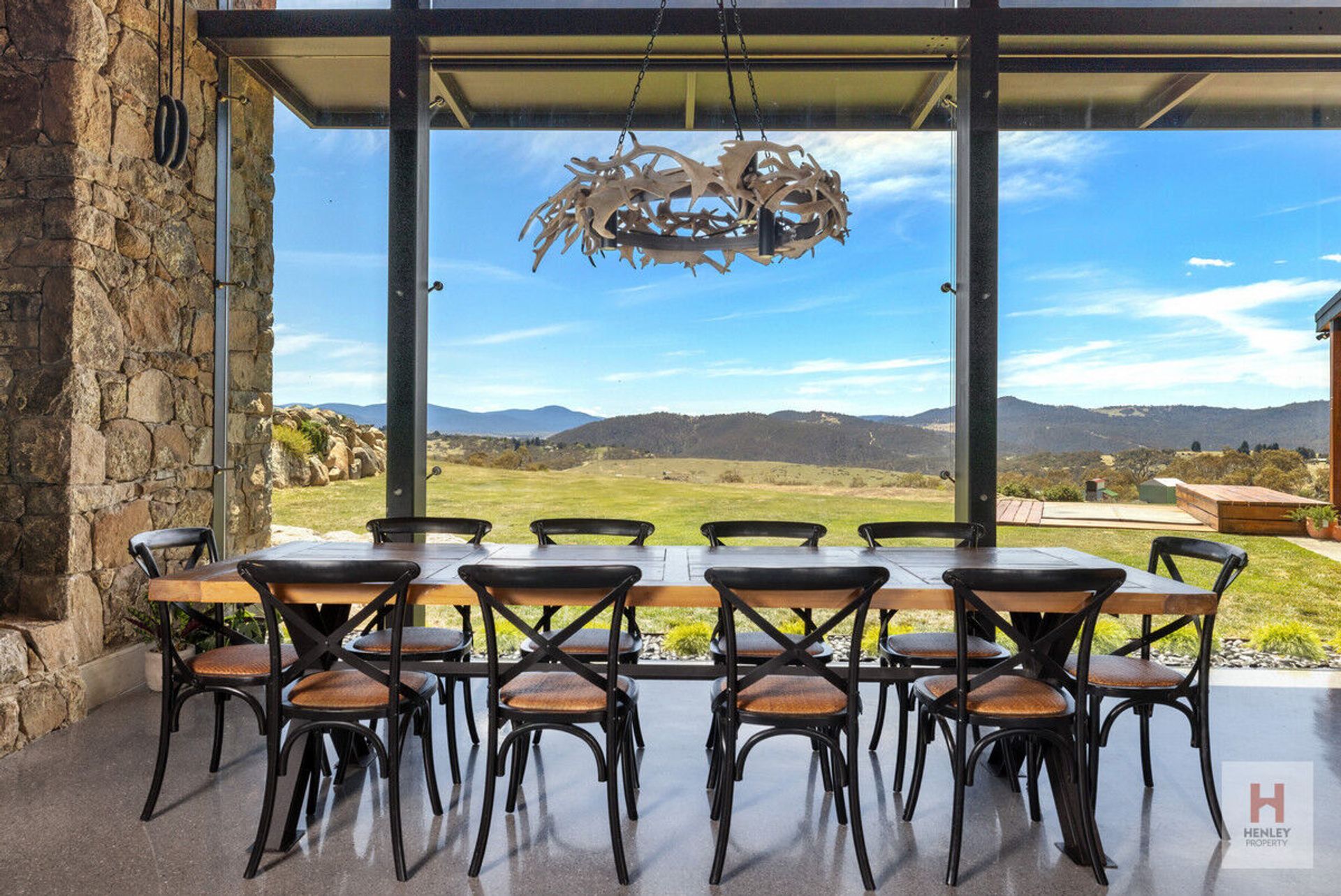 · Dining area with chandelier crafted with antlers found on the property