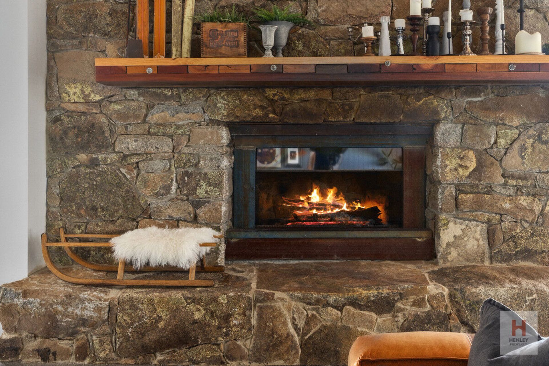 · Feature 2-story fireplace crafted with stones from the property