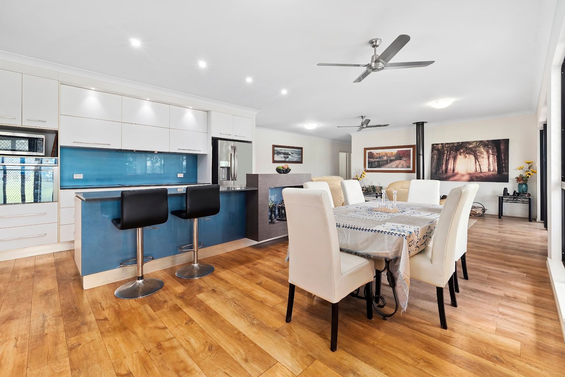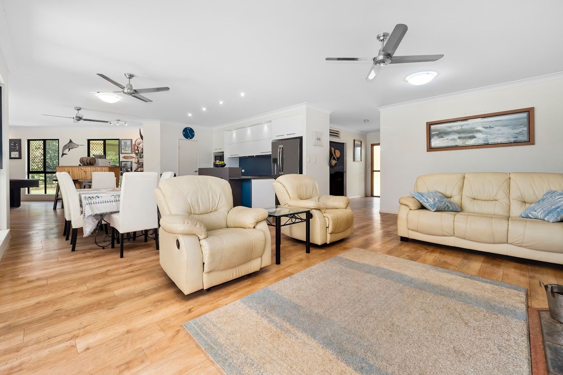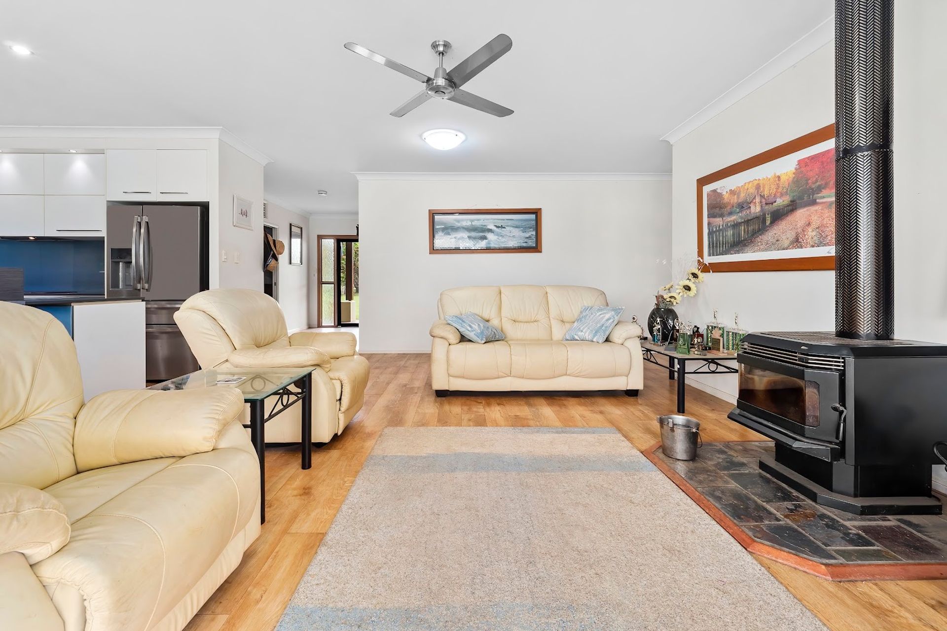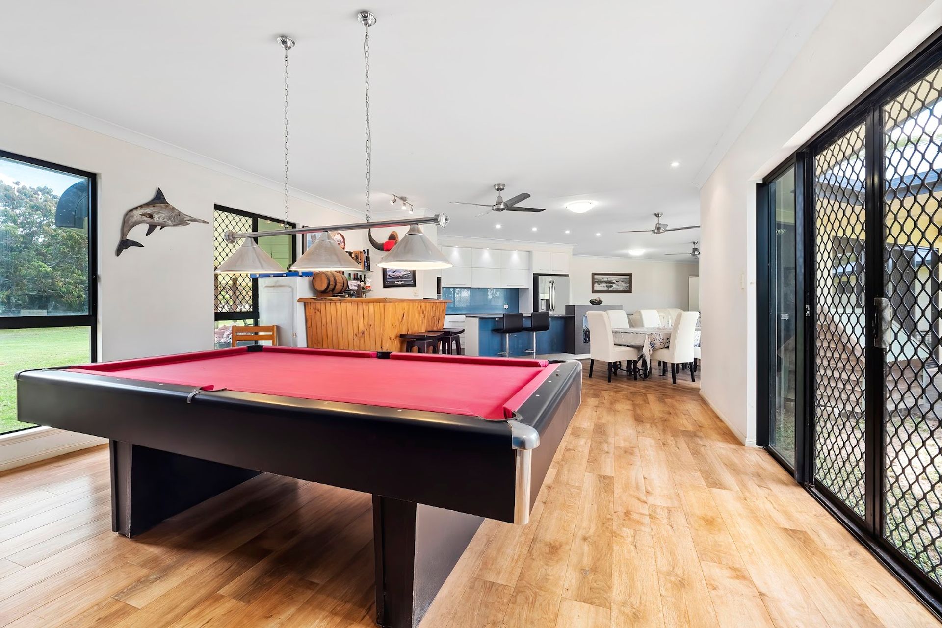 The games room fits a pool table, bar and is adjacent the open plan kitchen, lounge and dining room. A cinema room and then study at the front door. Kitchen is well designed with stone benchtops, ample cupboards and pantry. The lounge room is spacious and has a Pot Belly Stove Heater which is handy on occasions in winter.