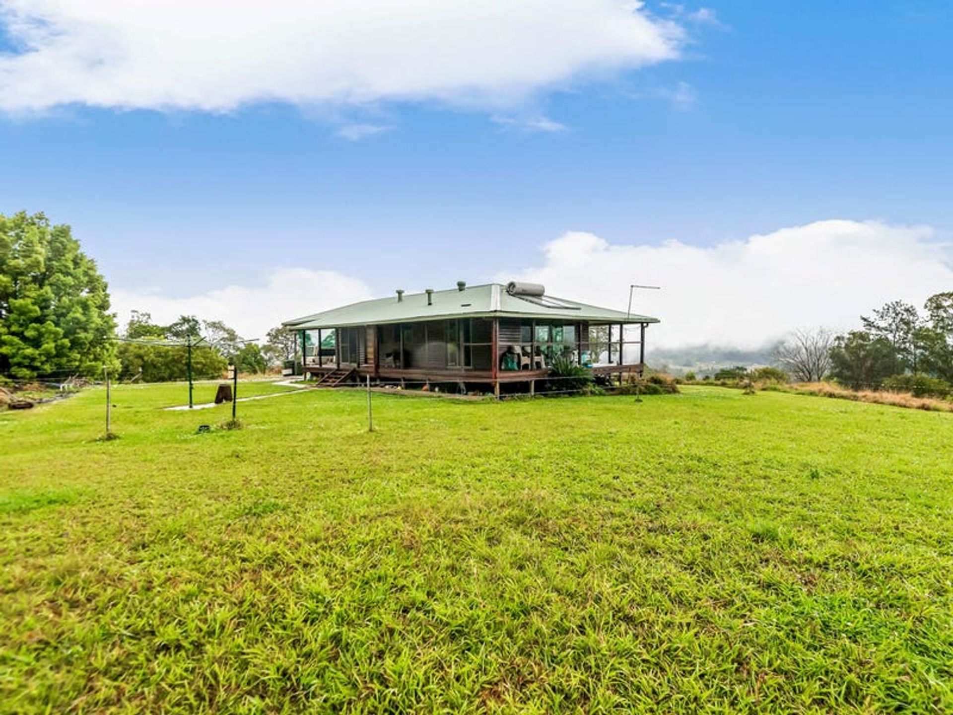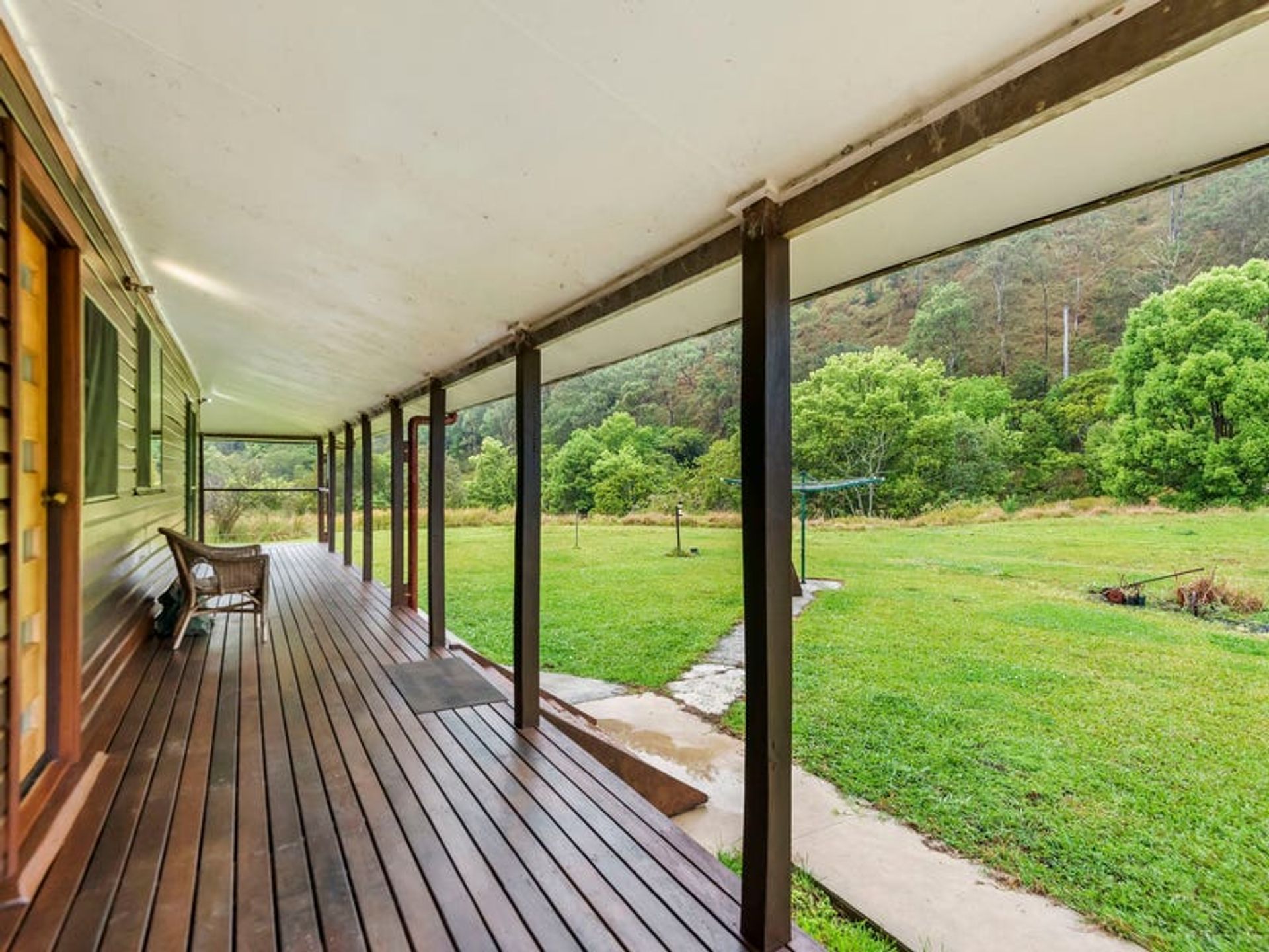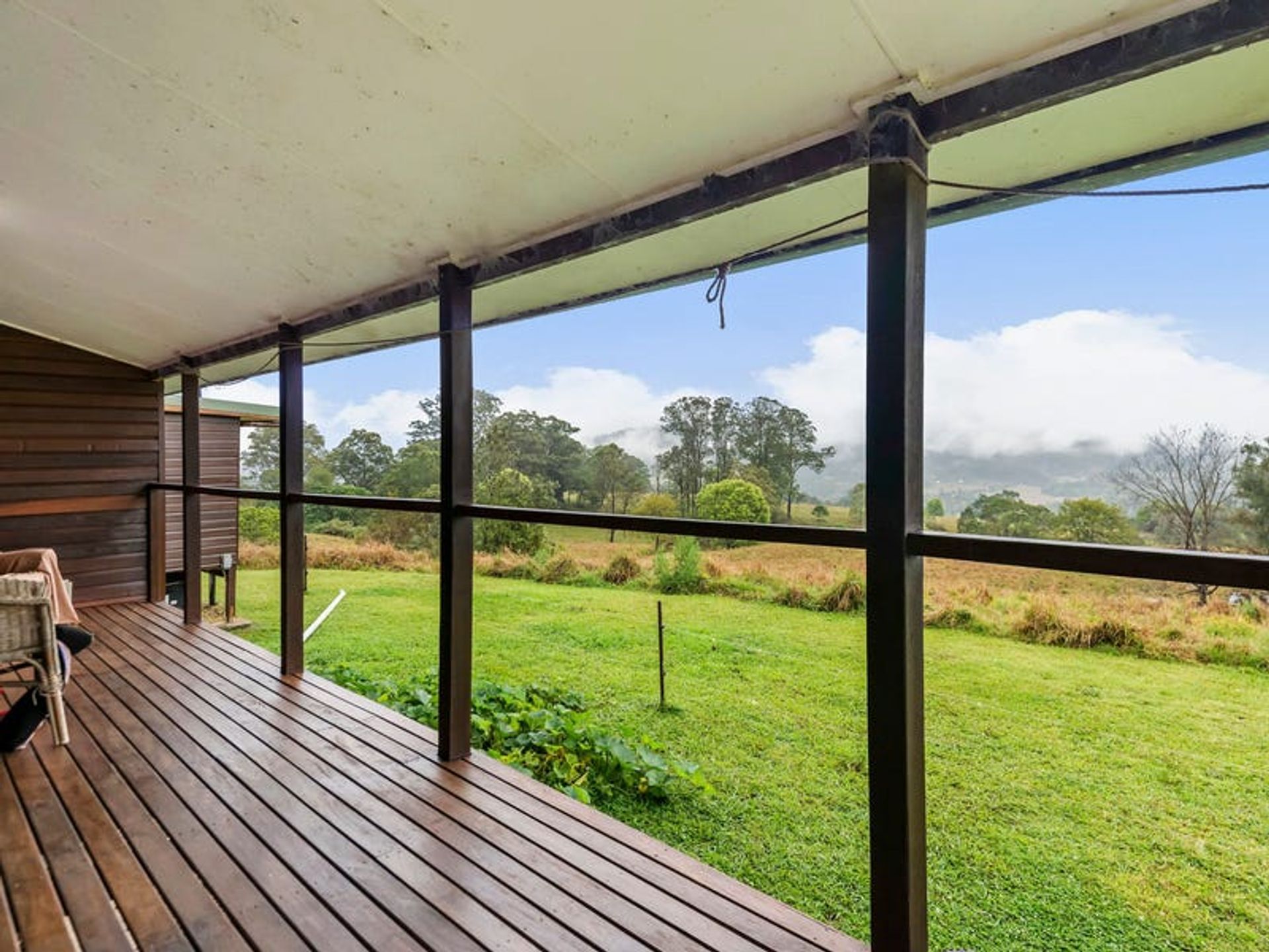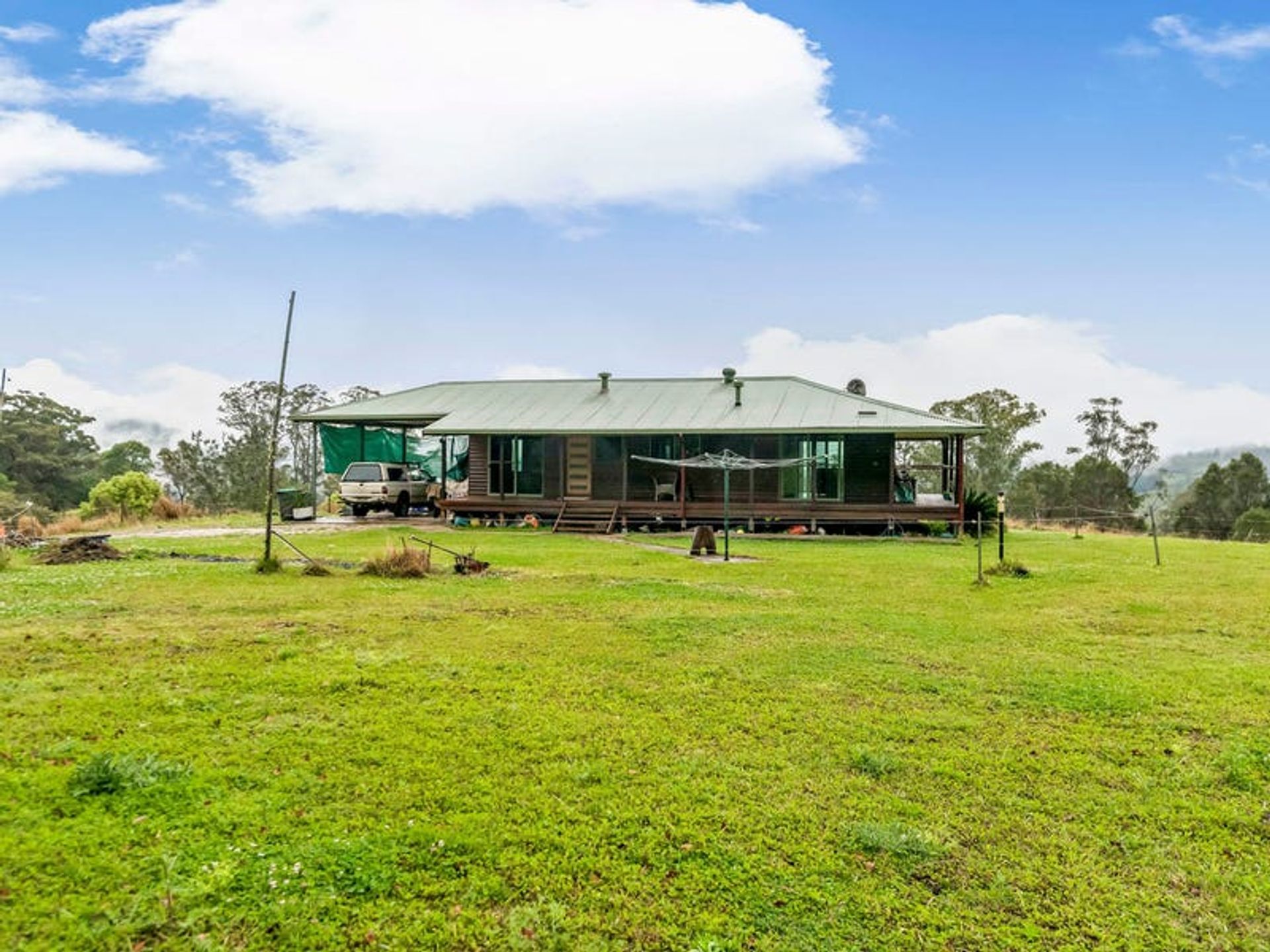 The lovely 2 bedroom home is a very solid structure supported by 100mm galvanised poles. The chunky supporting hardwood timbers were locally sourced from a 1970's building, and the cladding is hardwood chamfer boards. The timbers have all been lacquered to maintain the warmth of a country build, with hardwoods featuring inside and out. The three verandahs and internal flooring are also hardwood...all very solid indeed. The three sides of wraparound-style verandahs are a feature of the build, since country living is all about the great outdoors. From here you will enjoy wide, open views over the lawns to gorgeous forested hills. The carport is under the main roof-line and has a very high 3.3m ceiling which is big enough for a 4wd with a 'tinny' on top. Being under the roof-line allows the next owner to create a lock-up garage in the future OR to extend the living area of the home if they desire. Mains underground power is available at the house as well as the shipping container, which is situated 100 metres from the dwelling.There's solar hot water with an electric booster, cooking is gas supplied by dual gas bottles, and there's ceiling fans throughout. Inside has been finished with the warm ambiance of timber, but with contemporary features and fittings for modern living. It has solid kitchen cabinetry, and great bathroom/laundry, and he new owner will have everything they need for comfortable living as is, or they can also tackle a few small projects to complete the home to their own taste.