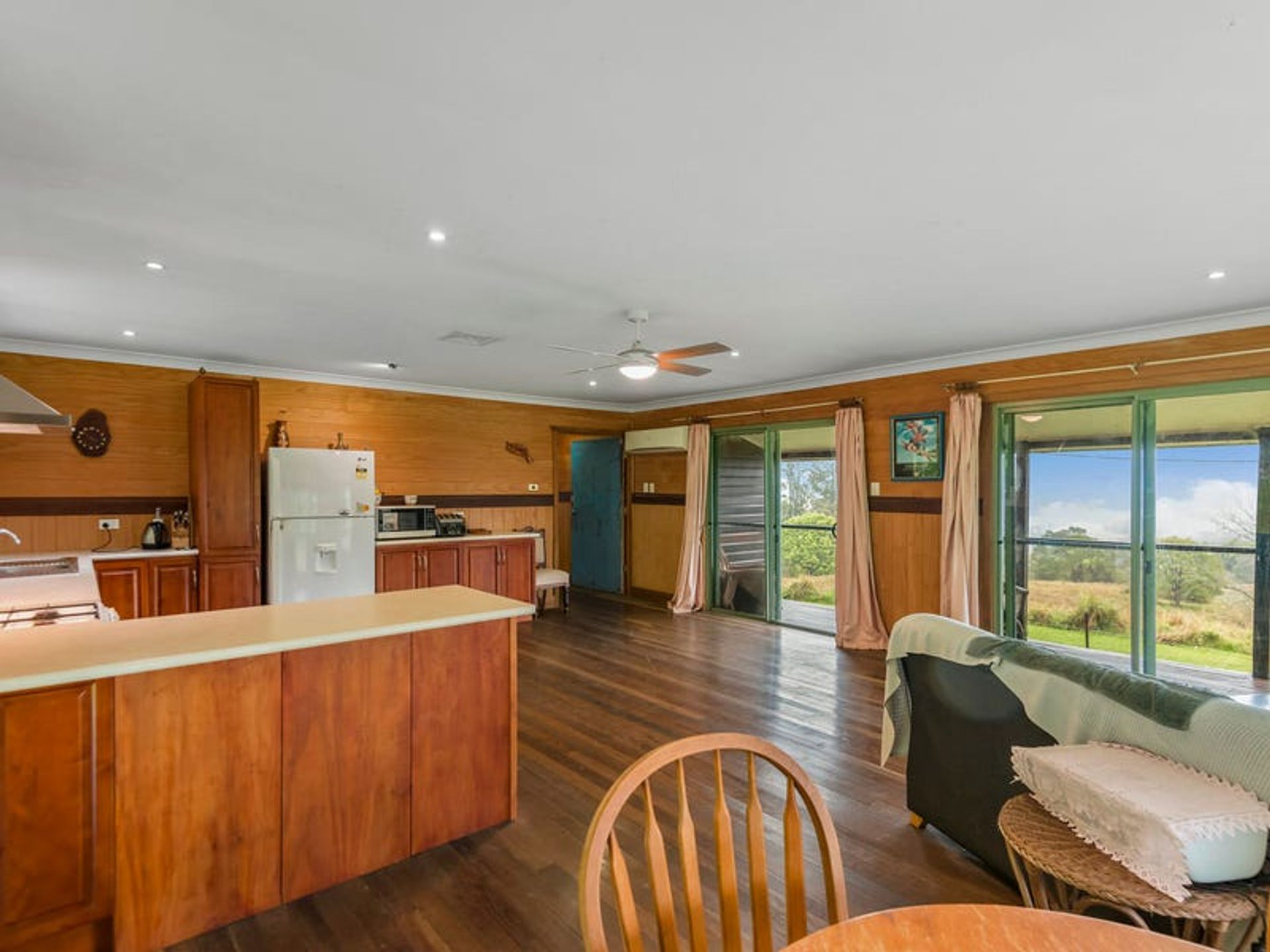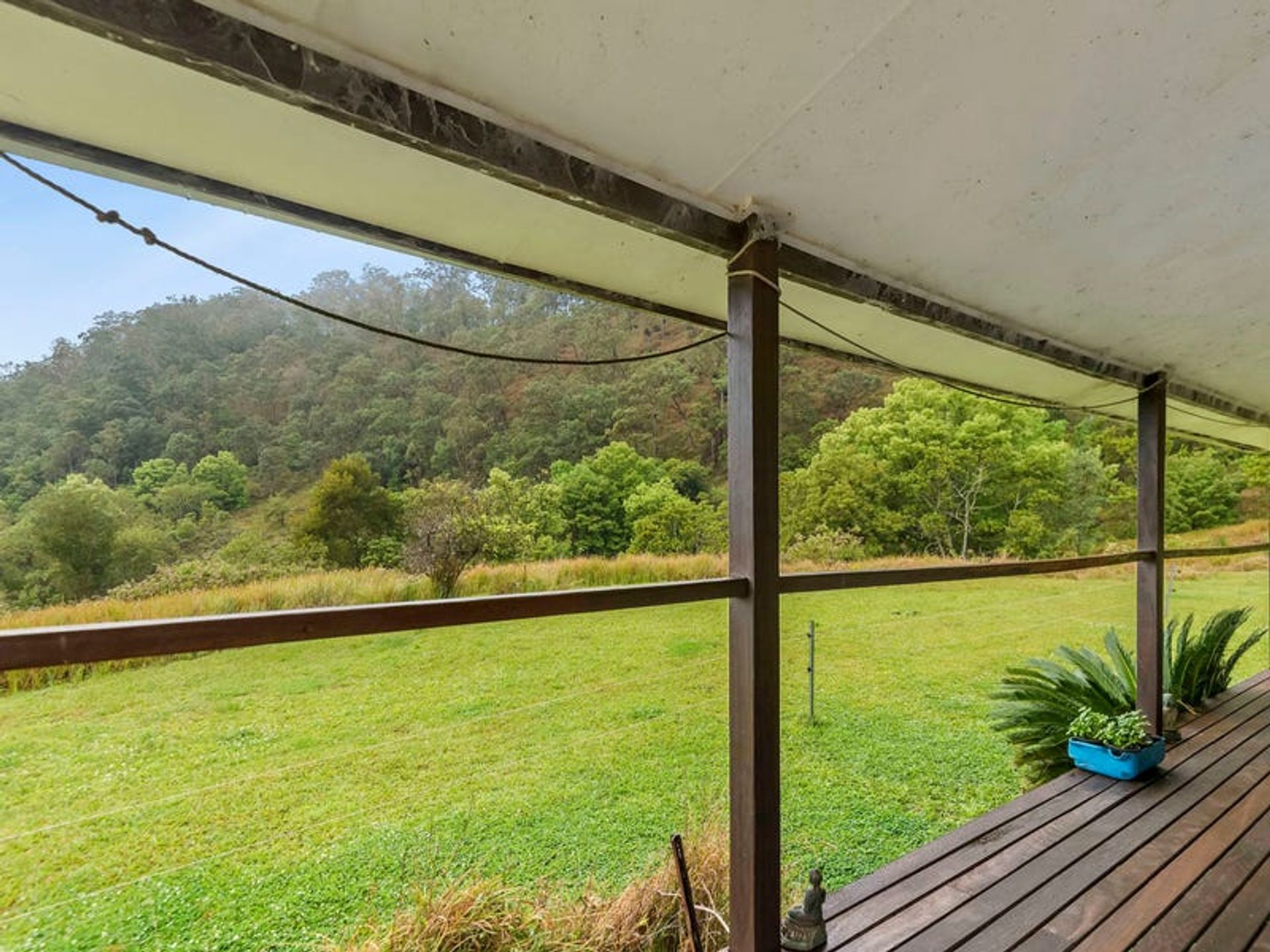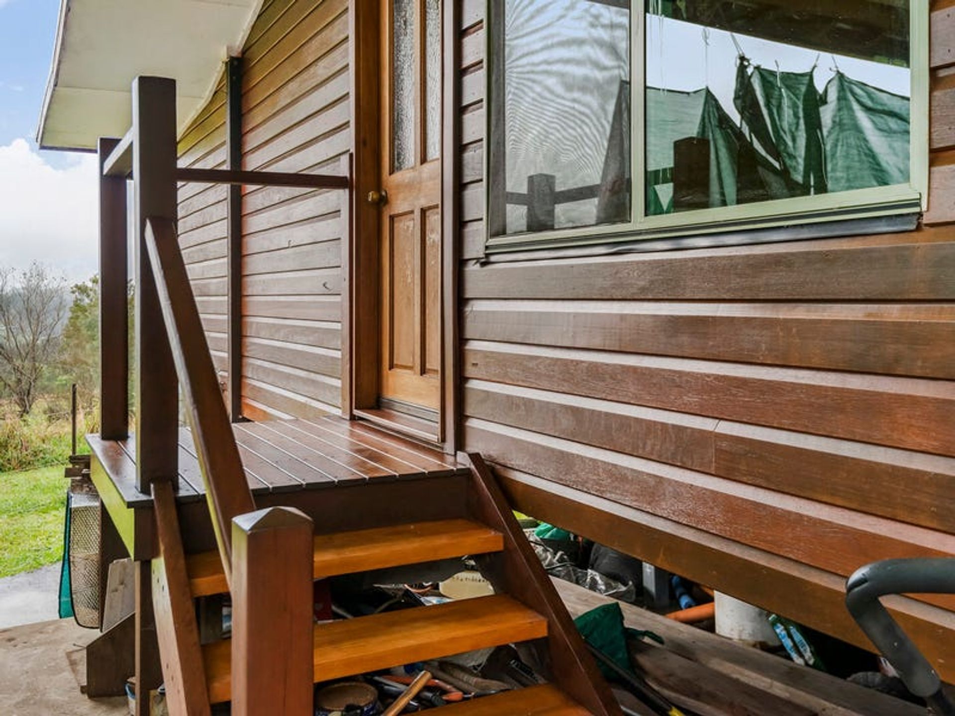 The lovely 2 bedroom home is a very solid structure supported by 100mm galvanised poles. The chunky supporting hardwood timbers were locally sourced from a 1970's building, and the cladding is hardwood chamfer boards. The timbers have all been lacquered to maintain the warmth of a country build, with hardwoods featuring inside and out. The three verandahs and internal flooring are also hardwood...all very solid indeed. The three sides of wraparound-style verandahs are a feature of the build, since country living is all about the great outdoors. From here you will enjoy wide, open views over the lawns to gorgeous forested hills. The carport is under the main roof-line and has a very high 3.3m ceiling which is big enough for a 4wd with a 'tinny' on top. Being under the roof-line allows the next owner to create a lock-up garage in the future OR to extend the living area of the home if they desire. Mains underground power is available at the house as well as the shipping container, which is situated 100 metres from the dwelling.There's solar hot water with an electric booster, cooking is gas supplied by dual gas bottles, and there's ceiling fans throughout. Inside has been finished with the warm ambiance of timber, but with contemporary features and fittings for modern living. It has solid kitchen cabinetry, and great bathroom/laundry, and he new owner will have everything they need for comfortable living as is, or they can also tackle a few small projects to complete the home to their own taste.