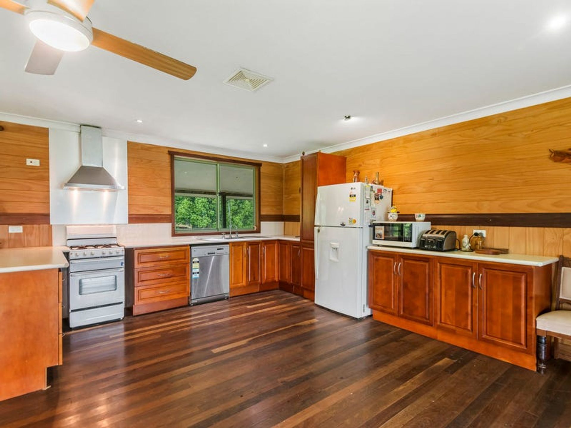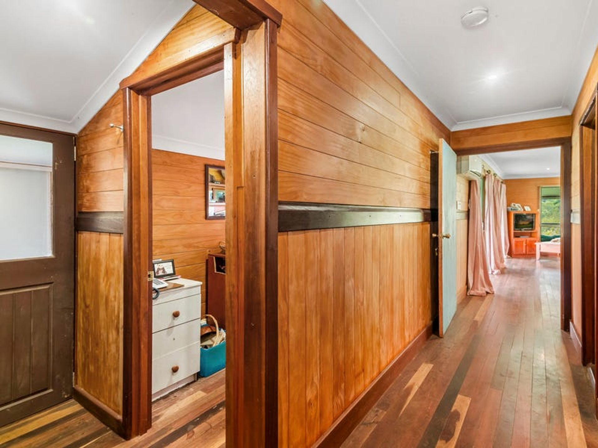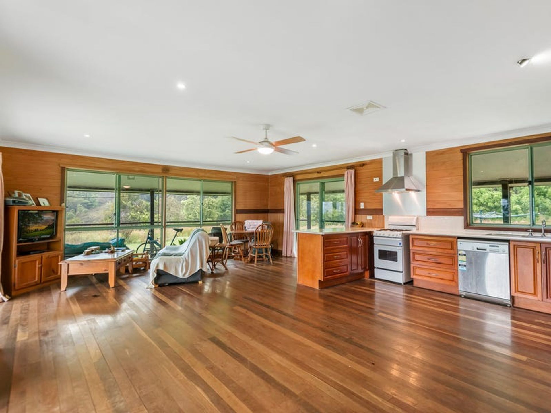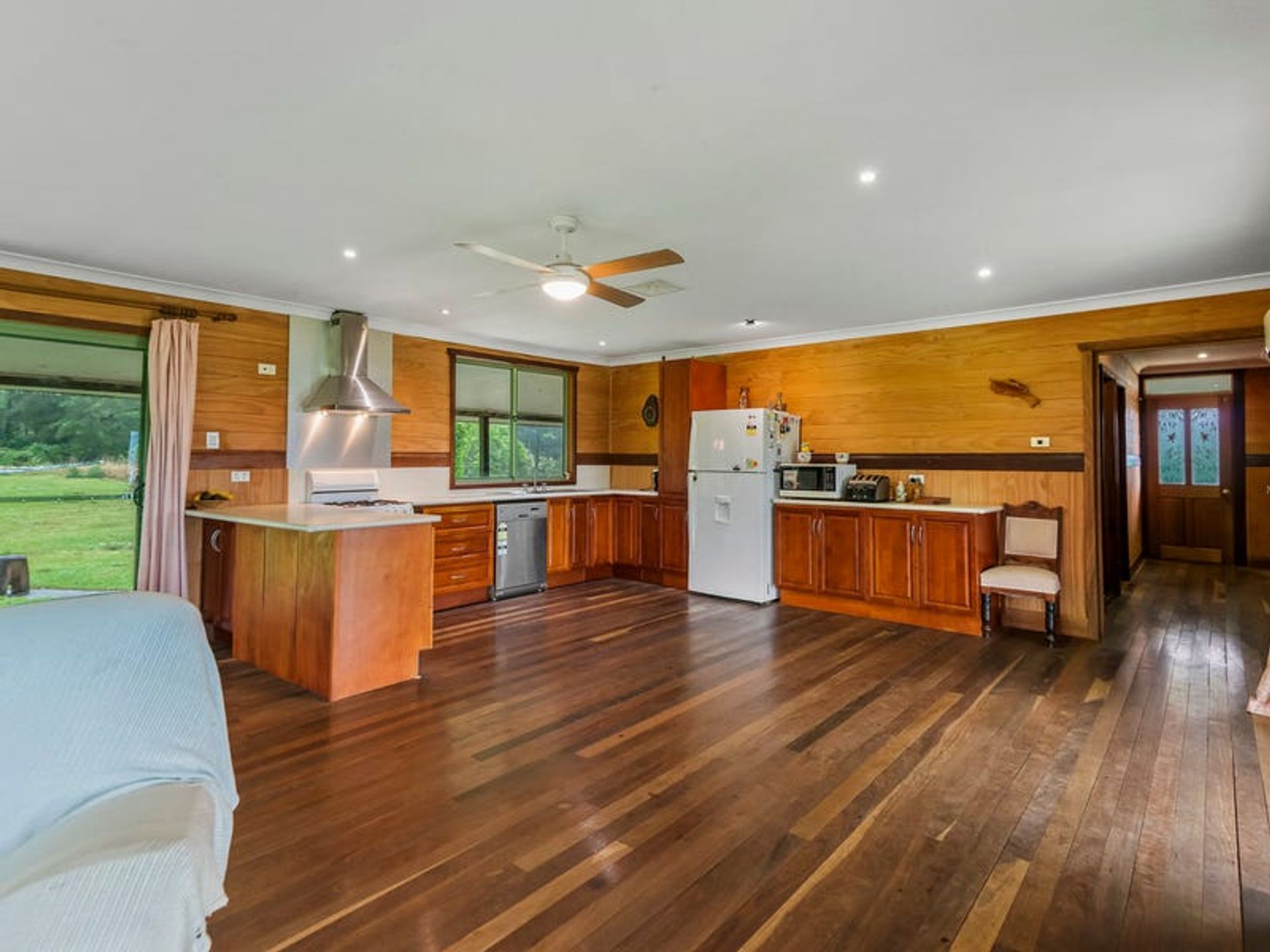 The lovely 2 bedroom home is a very solid structure supported by 100mm galvanised poles. The chunky supporting hardwood timbers were locally sourced from a 1970's building, and the cladding is hardwood chamfer boards. The timbers have all been lacquered to maintain the warmth of a country build, with hardwoods featuring inside and out. The three verandahs and internal flooring are also hardwood...all very solid indeed. The three sides of wraparound-style verandahs are a feature of the build, since country living is all about the great outdoors. From here you will enjoy wide, open views over the lawns to gorgeous forested hills. The carport is under the main roof-line and has a very high 3.3m ceiling which is big enough for a 4wd with a 'tinny' on top. Being under the roof-line allows the next owner to create a lock-up garage in the future OR to extend the living area of the home if they desire. Mains underground power is available at the house as well as the shipping container, which is situated 100 metres from the dwelling.There's solar hot water with an electric booster, cooking is gas supplied by dual gas bottles, and there's ceiling fans throughout. Inside has been finished with the warm ambiance of timber, but with contemporary features and fittings for modern living. It has solid kitchen cabinetry, and great bathroom/laundry, and he new owner will have everything they need for comfortable living as is, or they can also tackle a few small projects to complete the home to their own taste.