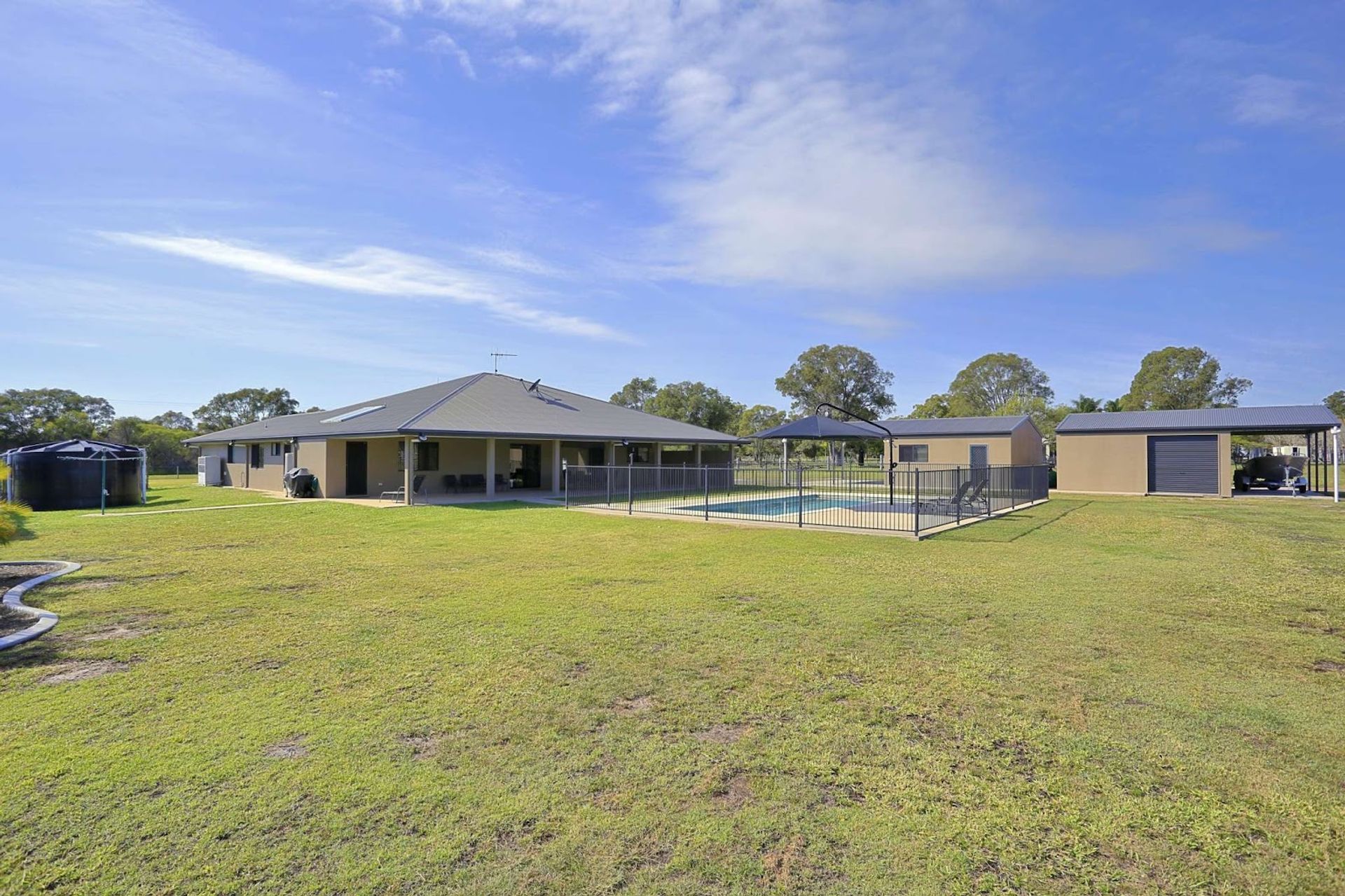There is a remote-control panel lift door on the extended double garage with attached double carport and single high clearance carport, plus extra sheds and carport at the rear, providing space for 7 plus vehicles and convenient entry to the property is through an automatic front gate.