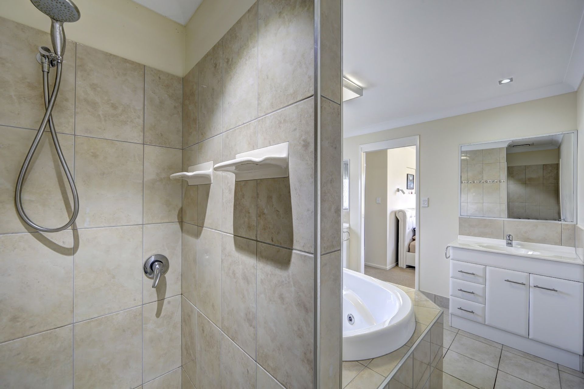 There are his and her vanities, shower, toilet and luxurious spa bath in the ensuite. The main bathroom offers double vanity, shower and a deep bath with a separate toilet.