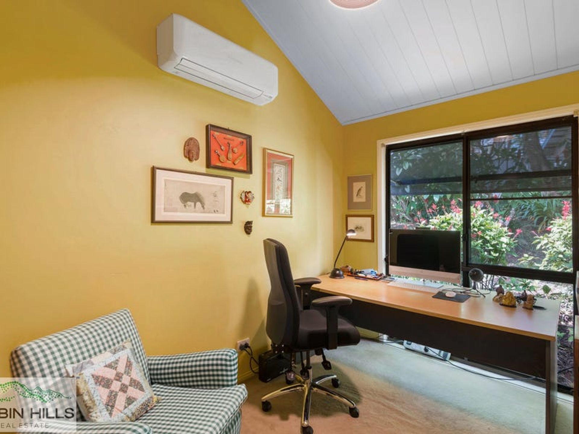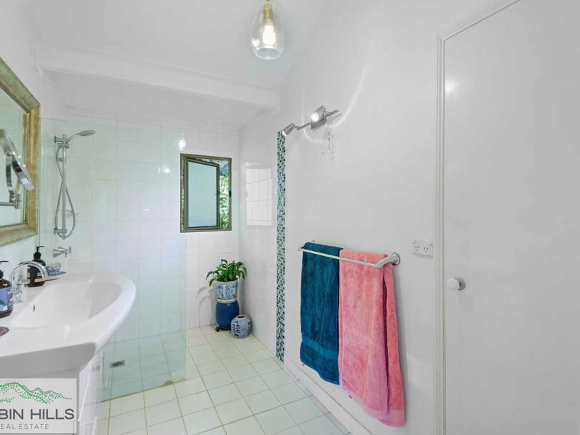 The 3 bedrooms are all carpeted, all have built-ins and two with ceiling fans and air con. The primary bedroom has both of the latter and direct access to entertainment deck. The contemporary bathroom is minimalist in crisp white with strips of feature tiling and a frameless glass shower.