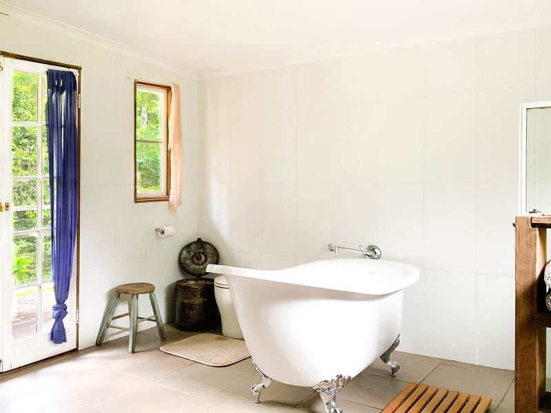 The bathroom is especially beautiful, with timber trim, a claw foot bath and views out to the surrounding forest through French doors. A Clivus Multrum composting toilet saves on water usage.