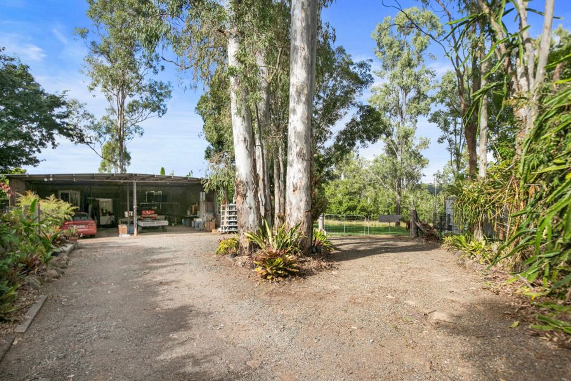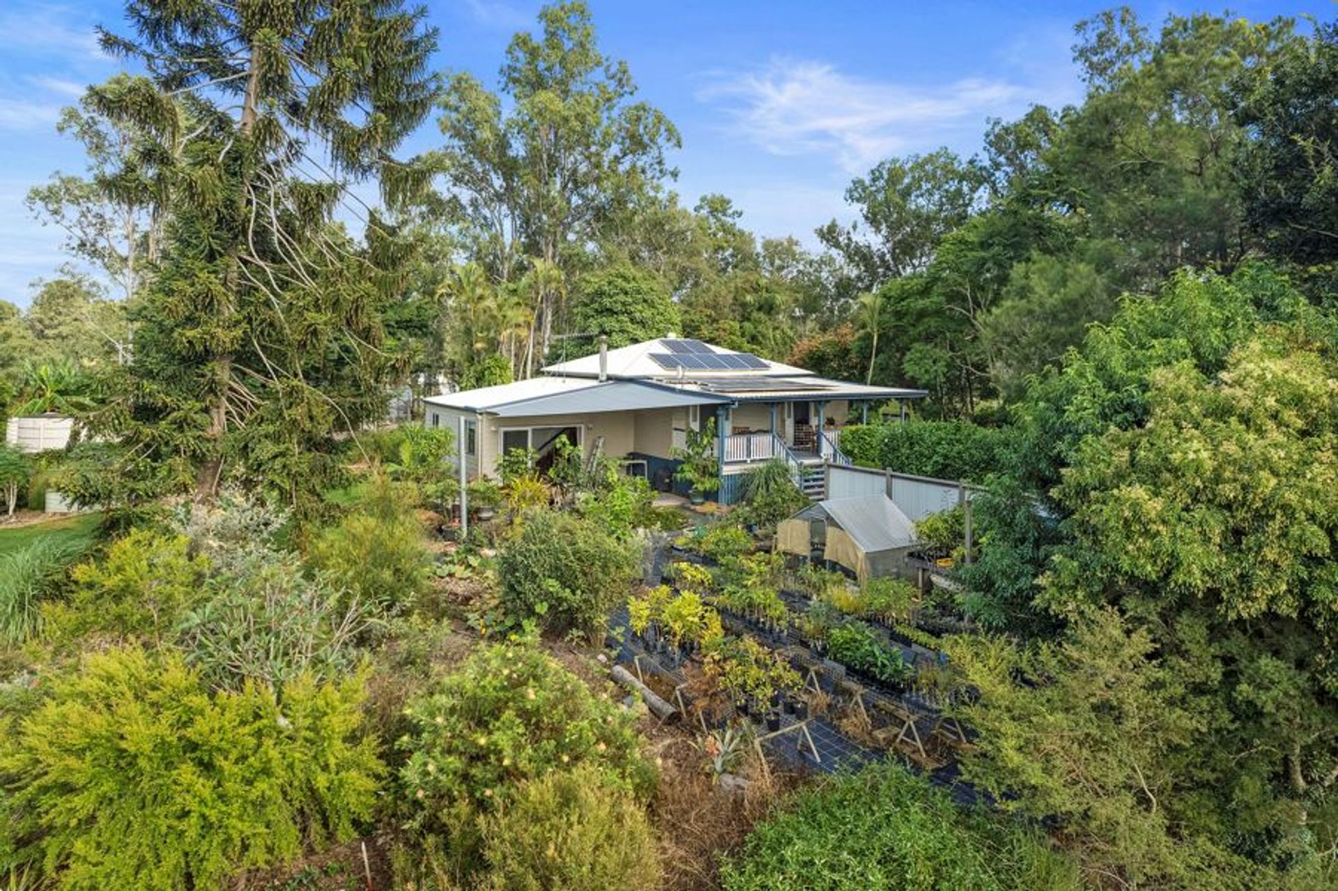 The scene is completed by a scattering of sheds, including a spacious 10x9m powered shed with a partly concreted floor, a 2-bay open high-clearance shed, and a 7.5x2.5m powered, lockable shed with an attached 7.5x3.5m gravel carport. A 6x4m open potting shed and a small garden shed round out the functional layout.