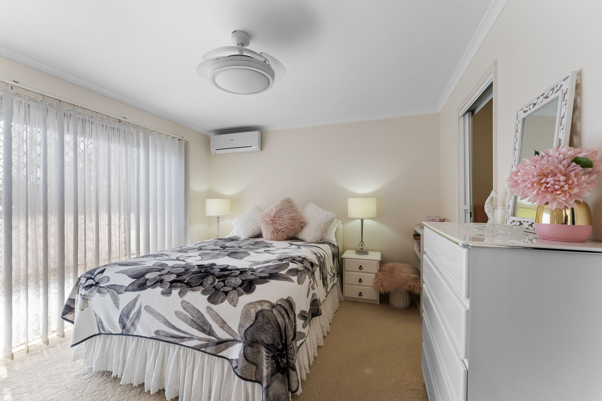 • Master Bedroom: A private haven featuring a walk-in robe, ensuite, ceiling fans, and air conditioning, offering picturesque views of the gardens and tranquil waters.