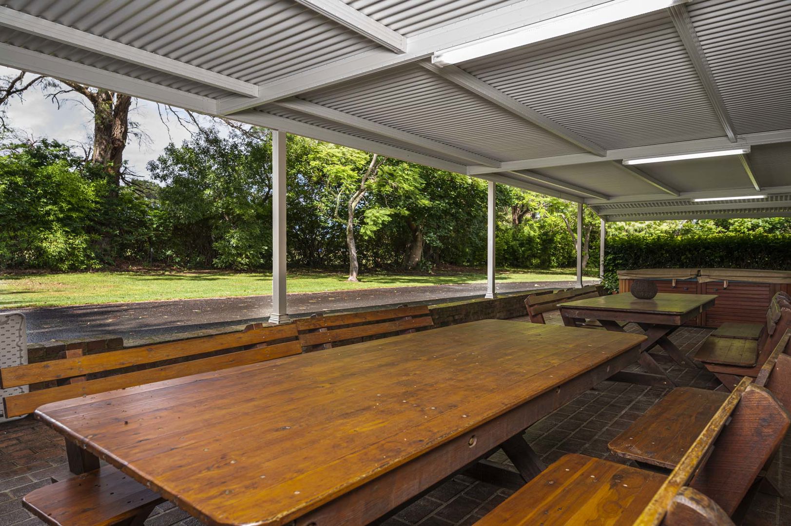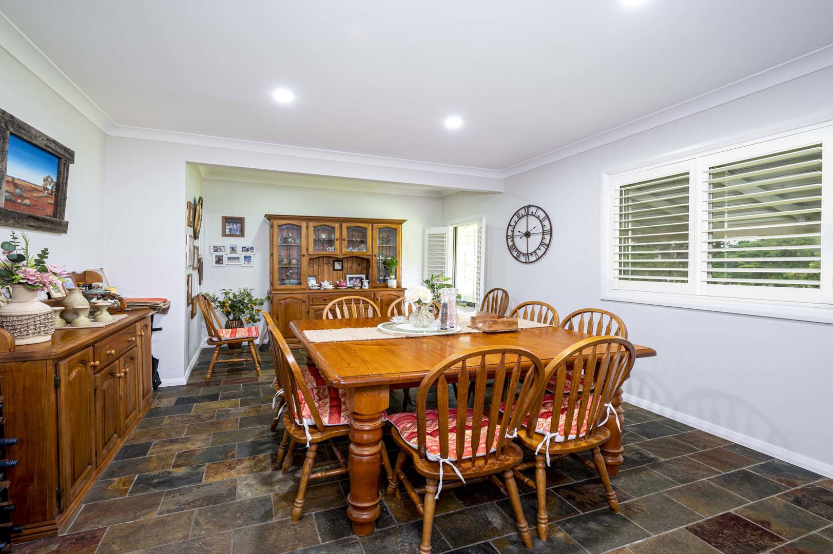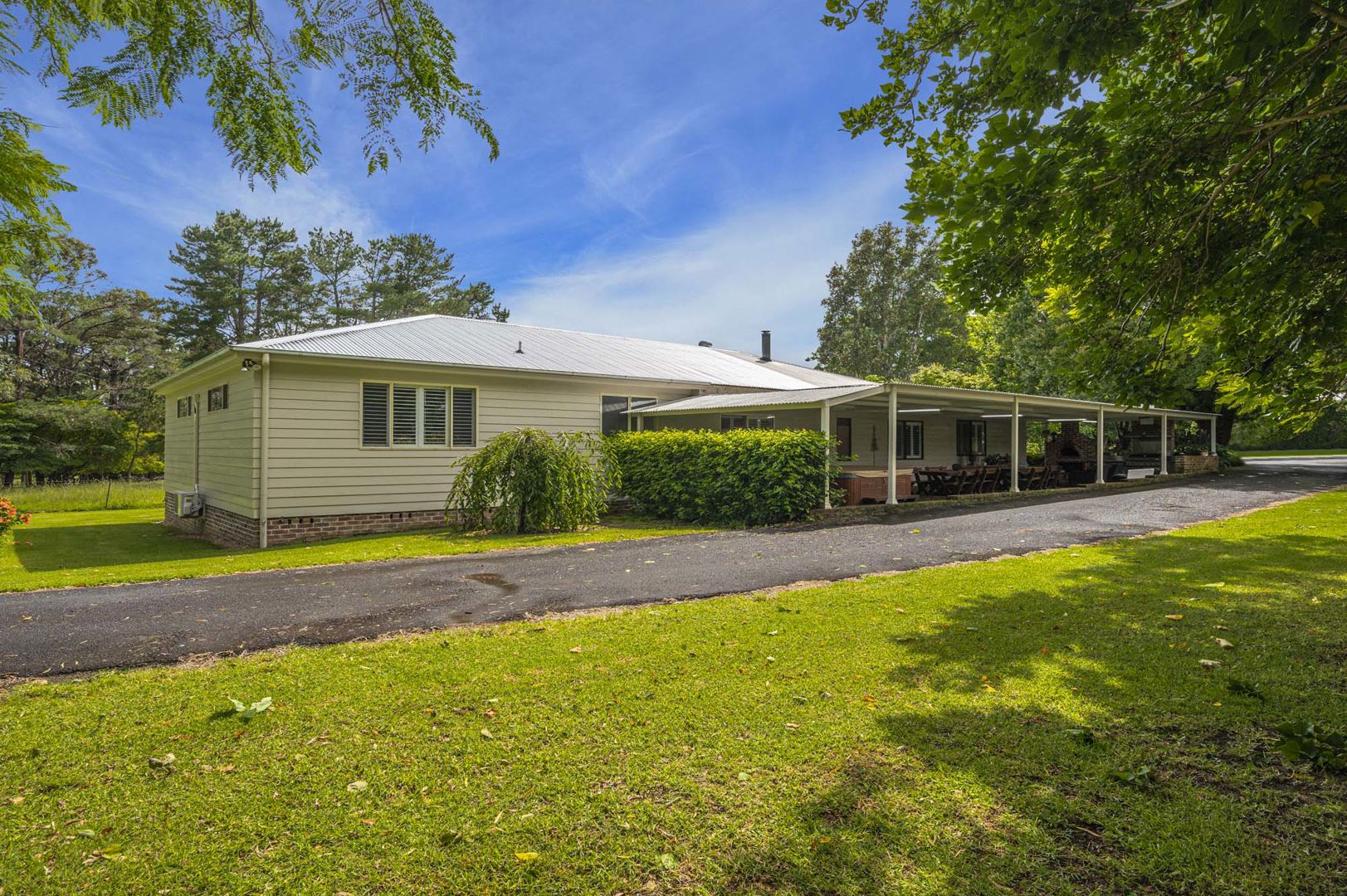 The property features a substantial five-bedroom family residence with multiple living areas, air conditioning, fireplace, quality finishes, and excellent outdoor entertaining, including built-in BBQ facilities, pizza oven, and spa. Perfect for family living or a peaceful country retreat.