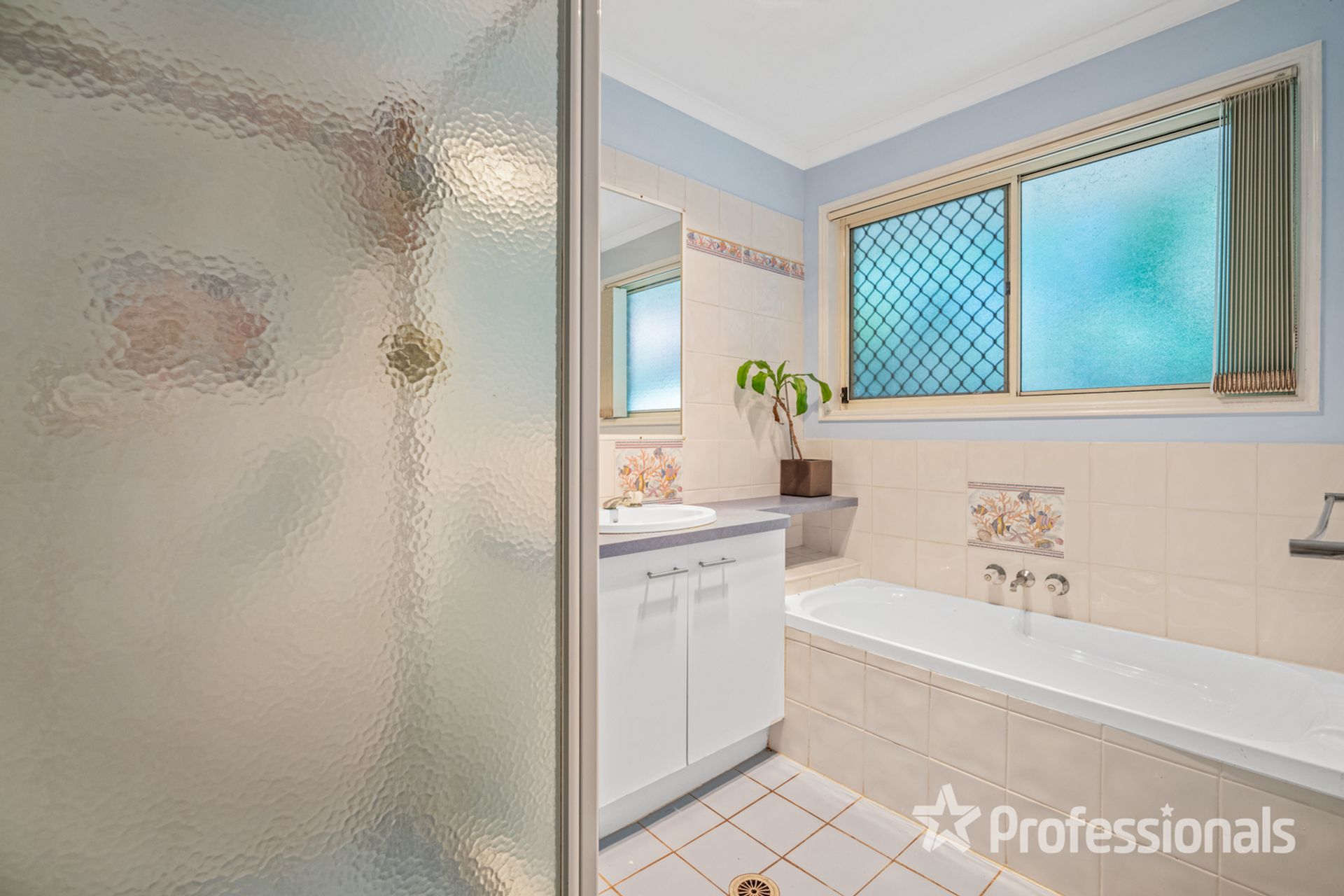 • Main bathroom with bath, vanity, and corner shower, separate toilet, linen cupboard, laundry area