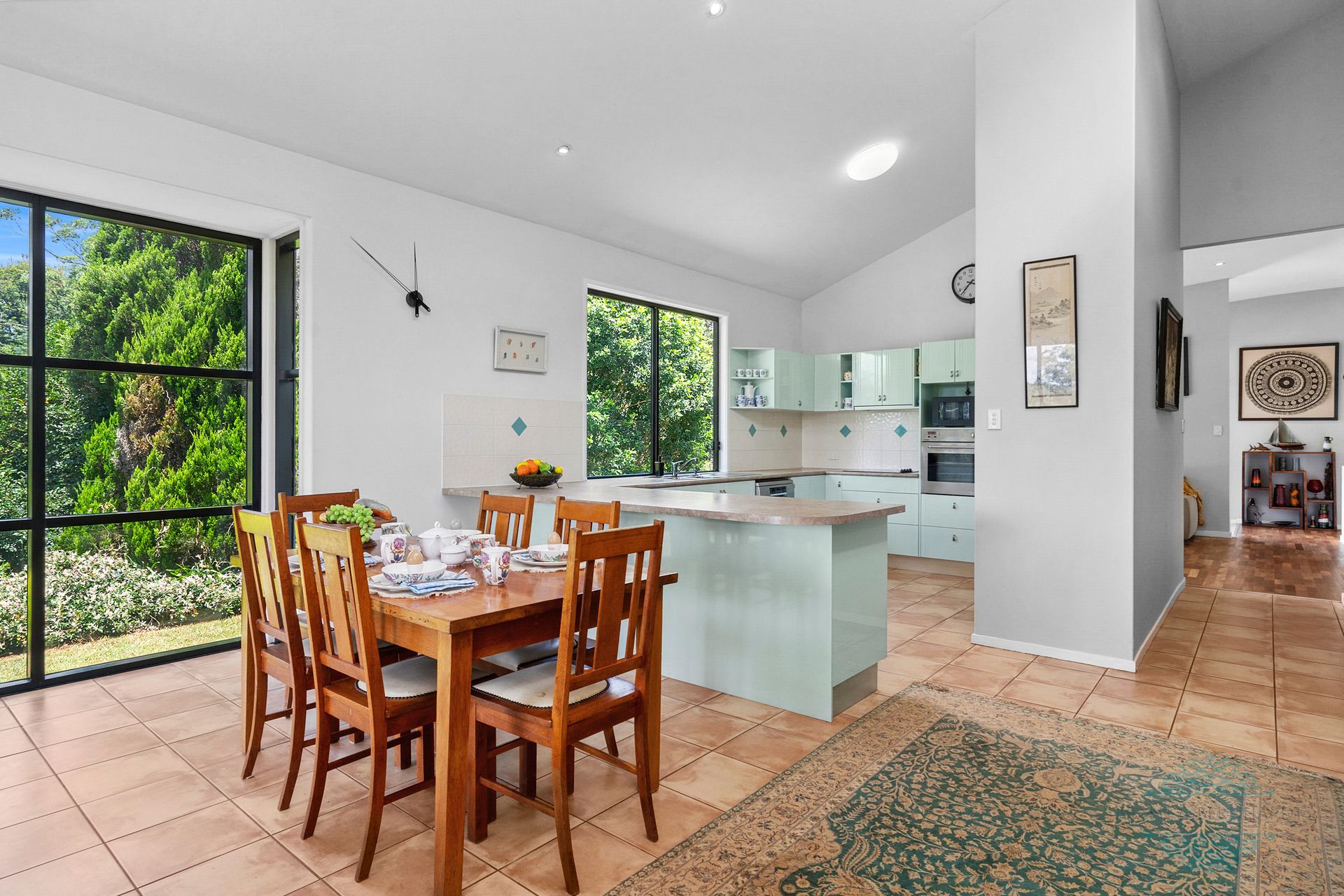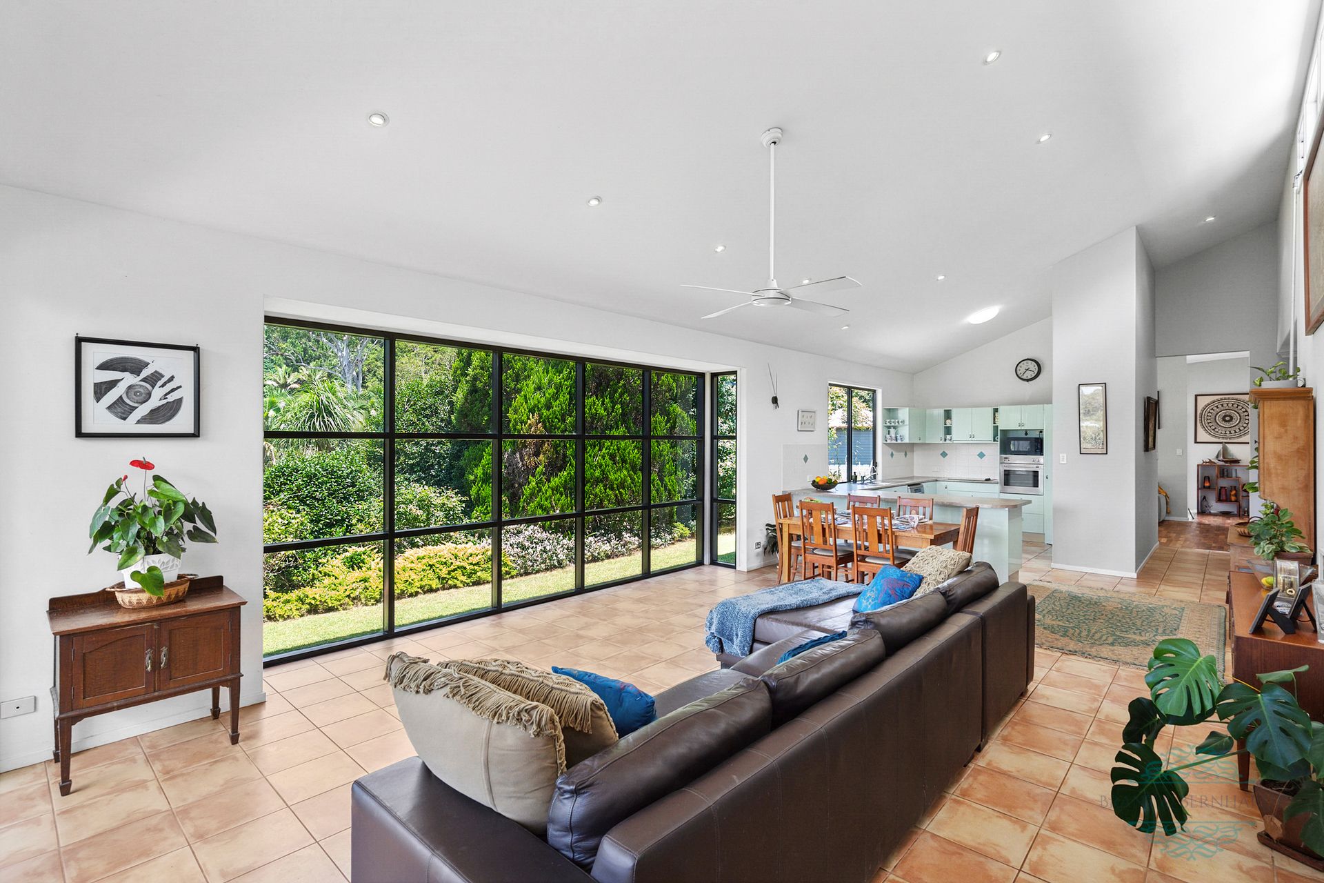 - Open plan kitchen, dining and lounge with 3.2m high ceilings and a full wall of feature windows inviting ample natural light and airflow. The interior exudes a spacious and airy ambiance encompassing peaceful views over the garden and lawns