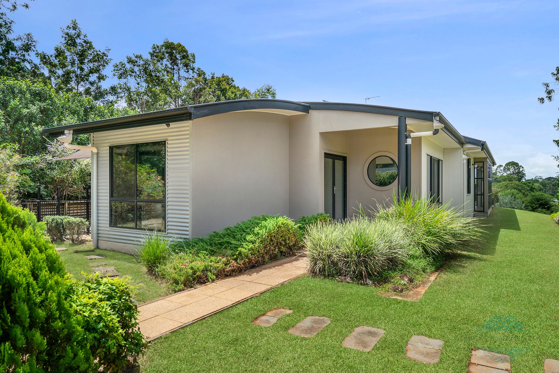 This contemporary, eco-friendly home sits proudly at the top of the 7039m2 block with serene views over parklike grounds. The unusual roof line is a mixture of curved and vaulted ceilings creating a stylish feel throughout the home.