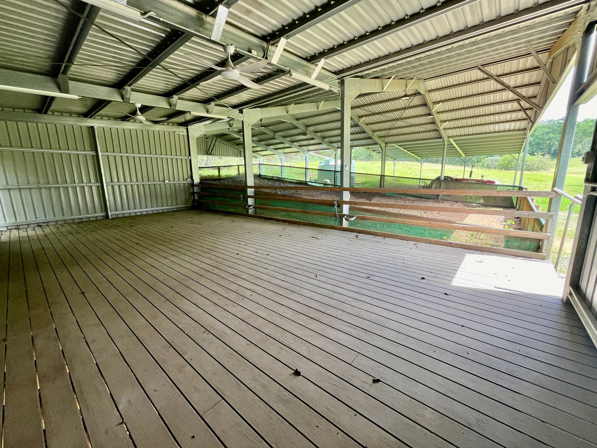 • 20 x 12m arena with 11 x 6m enclosed viewing platform, 10 x 10m skillion roof for round yard, lights, power, ceiling fans