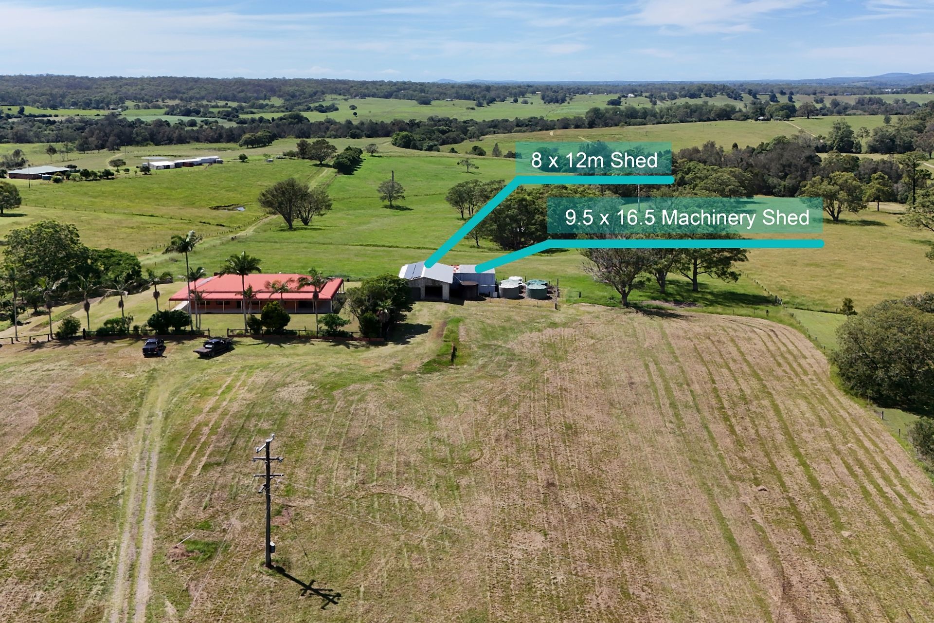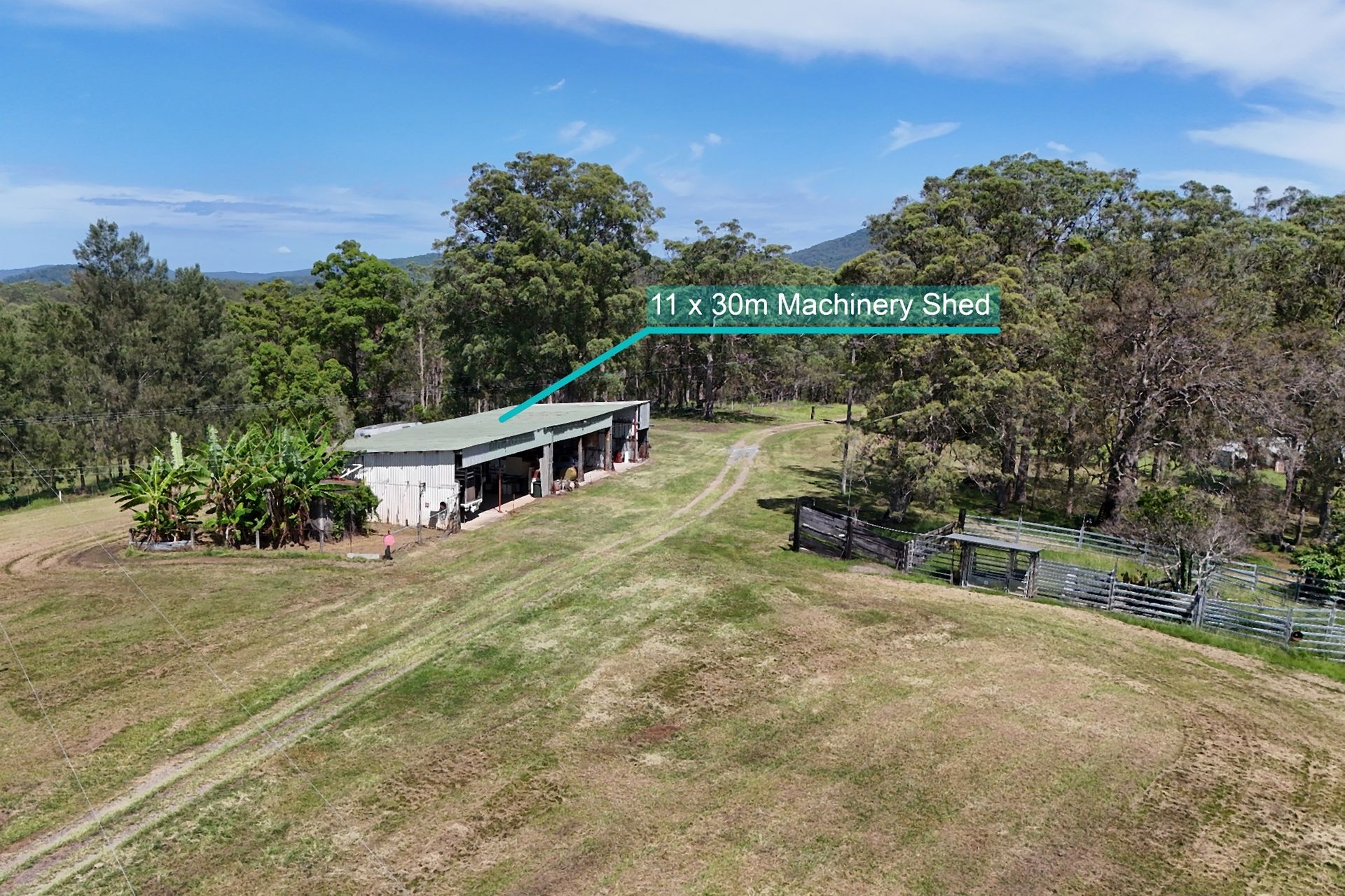 - 30x11m shed, 8x12m shed, 9.5x16.5m machinery shed, plus additional shed at the dam