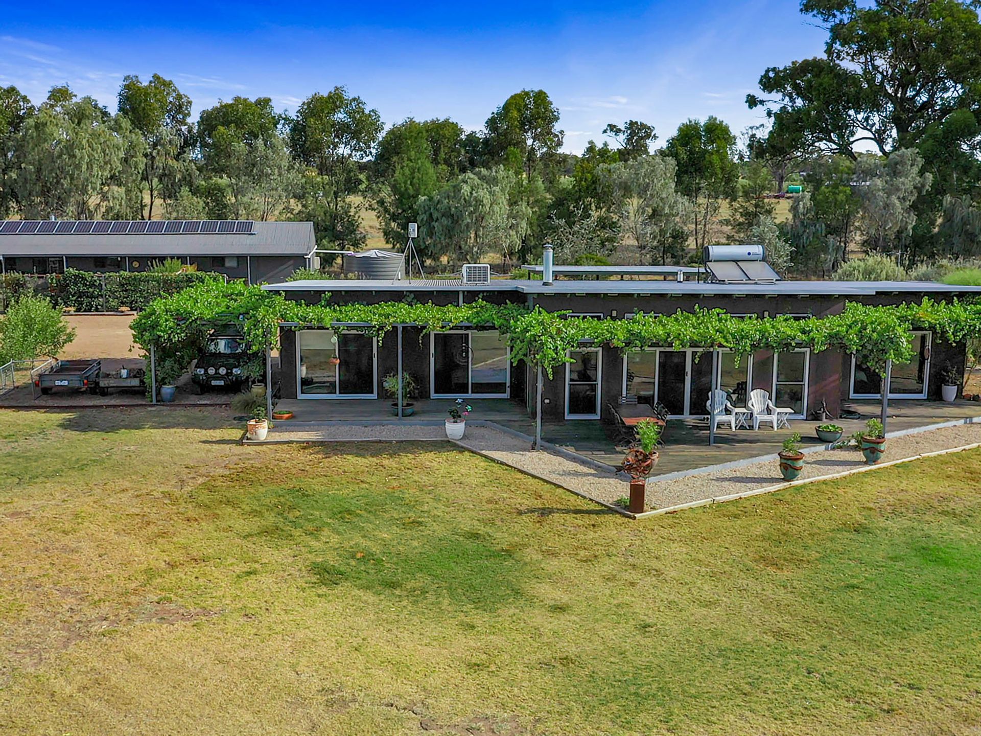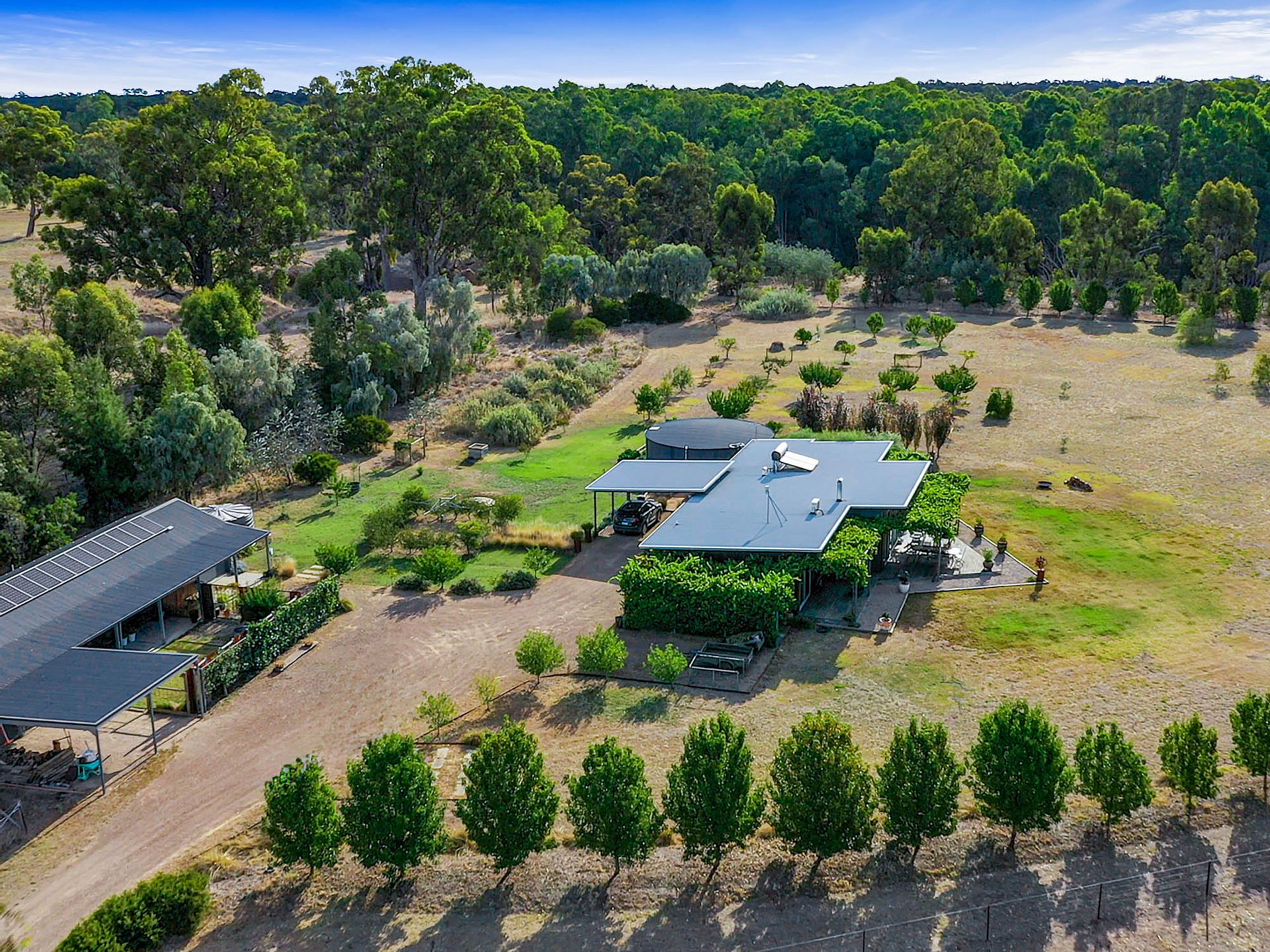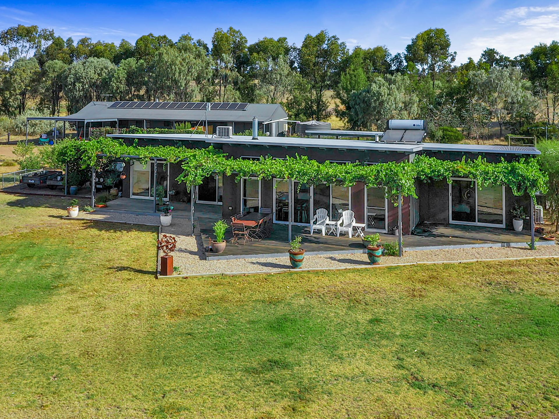Upon arrival, you'll travel along a scenic 1.3-kilometre driveway from the main sealed road to the residence. The home is equipped with a solar hot water system, a complete water recycling infrastructure that services an established fruit orchard, and a substantial 130,000-litre water tank attached to the house. A 5.1 kW solar panel system significantly reduces power bills.