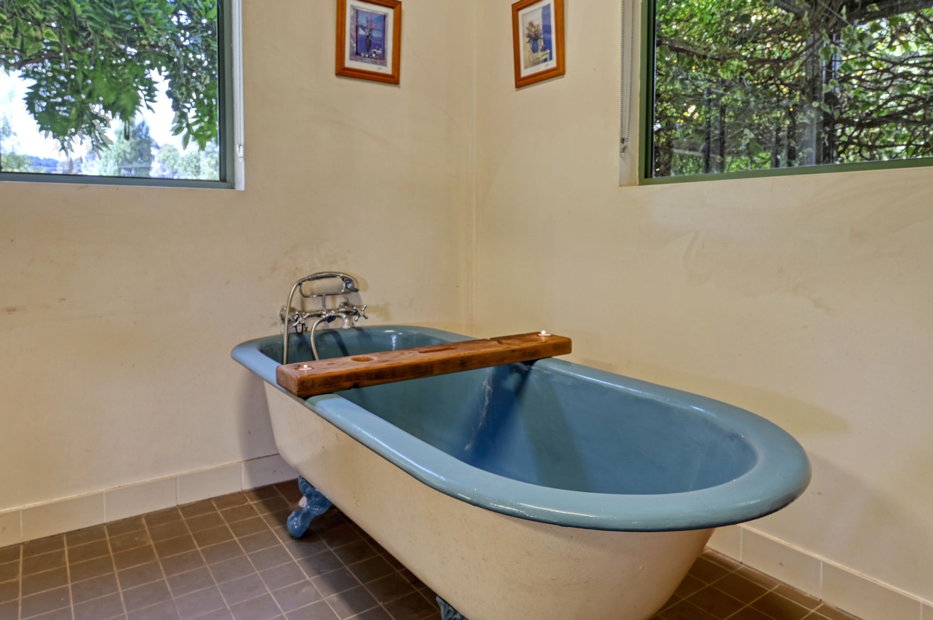 • Large bright bathroom with a charming claw foot bath.