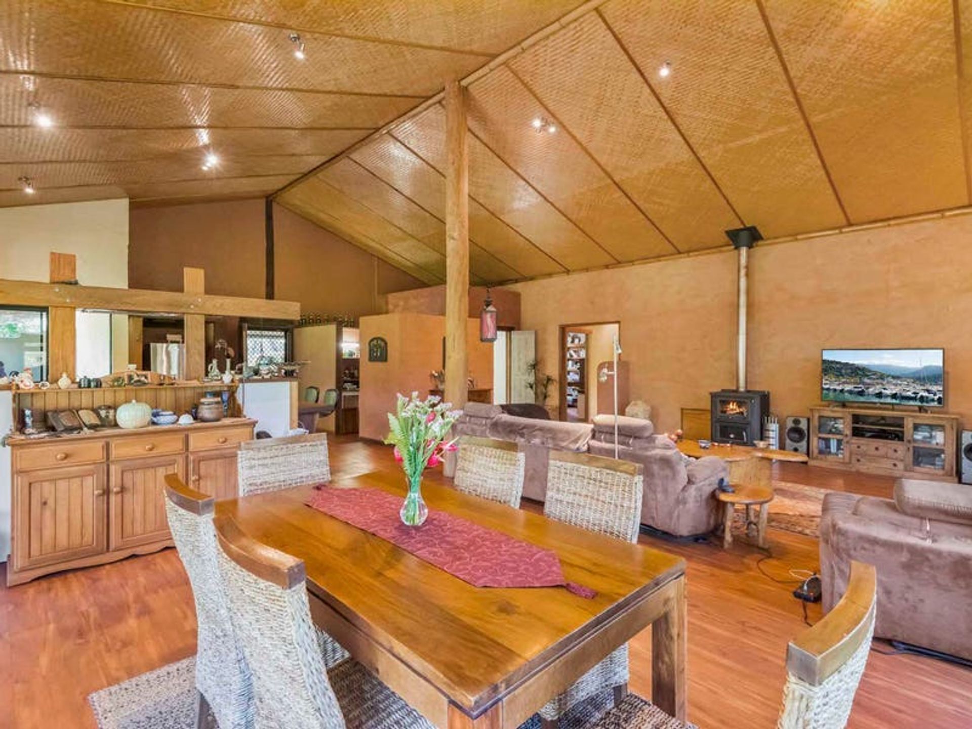 The home is befitting of a horse stud, and 'Hacienda' in flavour. Whilst not a Spanish-style construction, the rendered masonry dwelling has a distinctly 'Latino' element to its design. Currently with accents of bright colour mixed with earthy ochres on flexible- rendered interior walls, this is offset by the natural materials and heavy duty vinyl floors throughout (with tiled service areas) and an internal roof of woven bamboo over plasterboard. The end result is an earthy patina, emphasizing the vast spaces of the open plan, fully insulated home. The solid timber kitchen with walk-in pantry is central and user-friendly, the huge airy living room has a large multi function wood-heater and the bathrooms have been given a contemporary refurbishment. The main bedroom has air conditioning. Outside the verandahs are wide and inviting, looking out over lovely gardens and expansive lawns and paddocks.