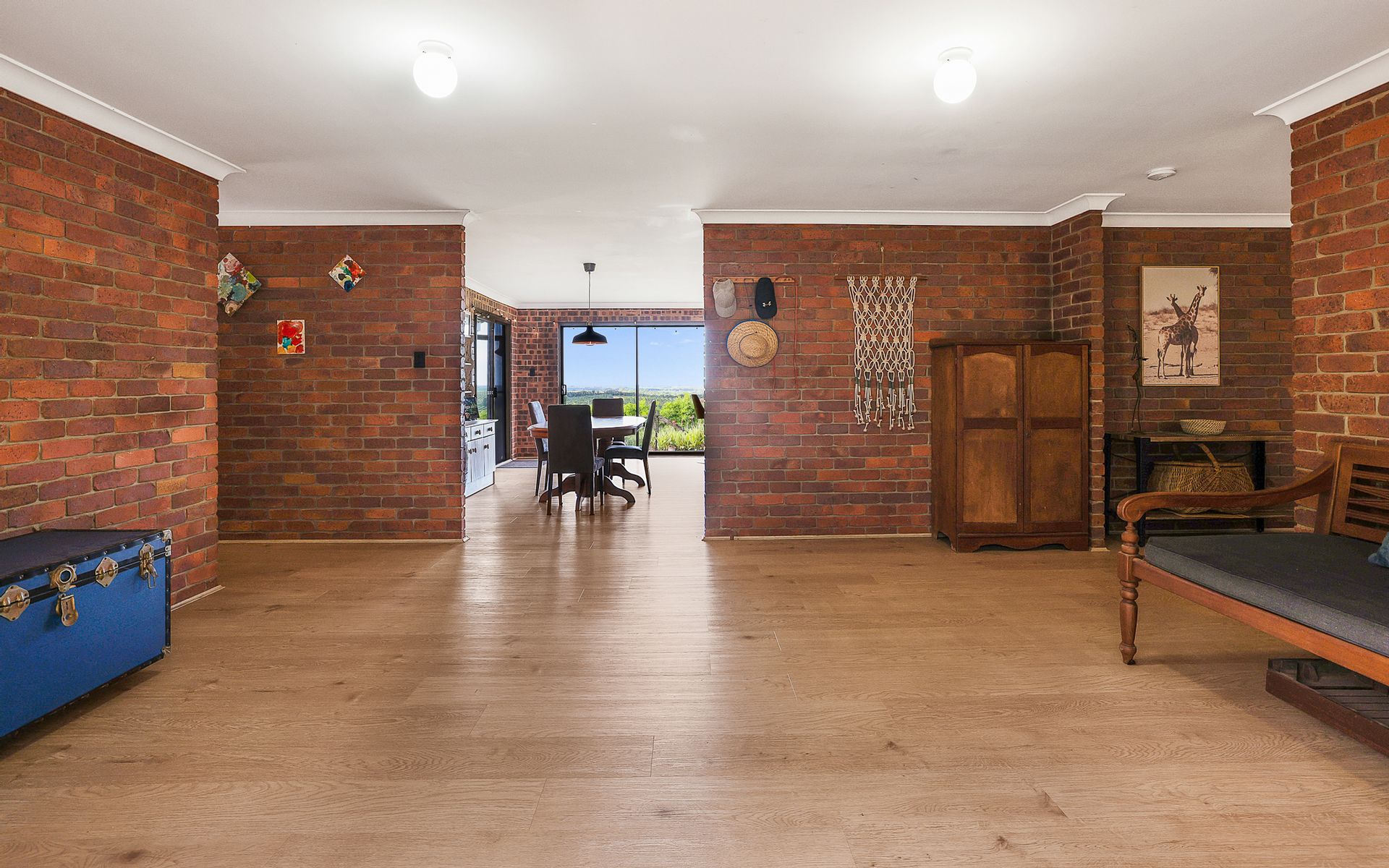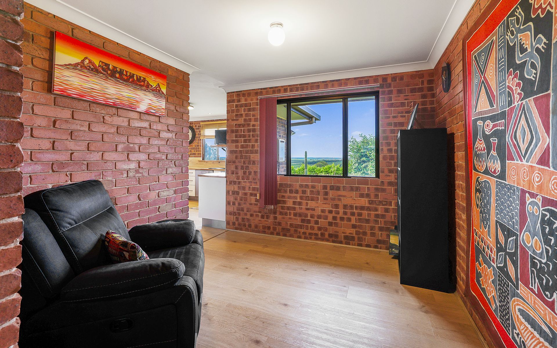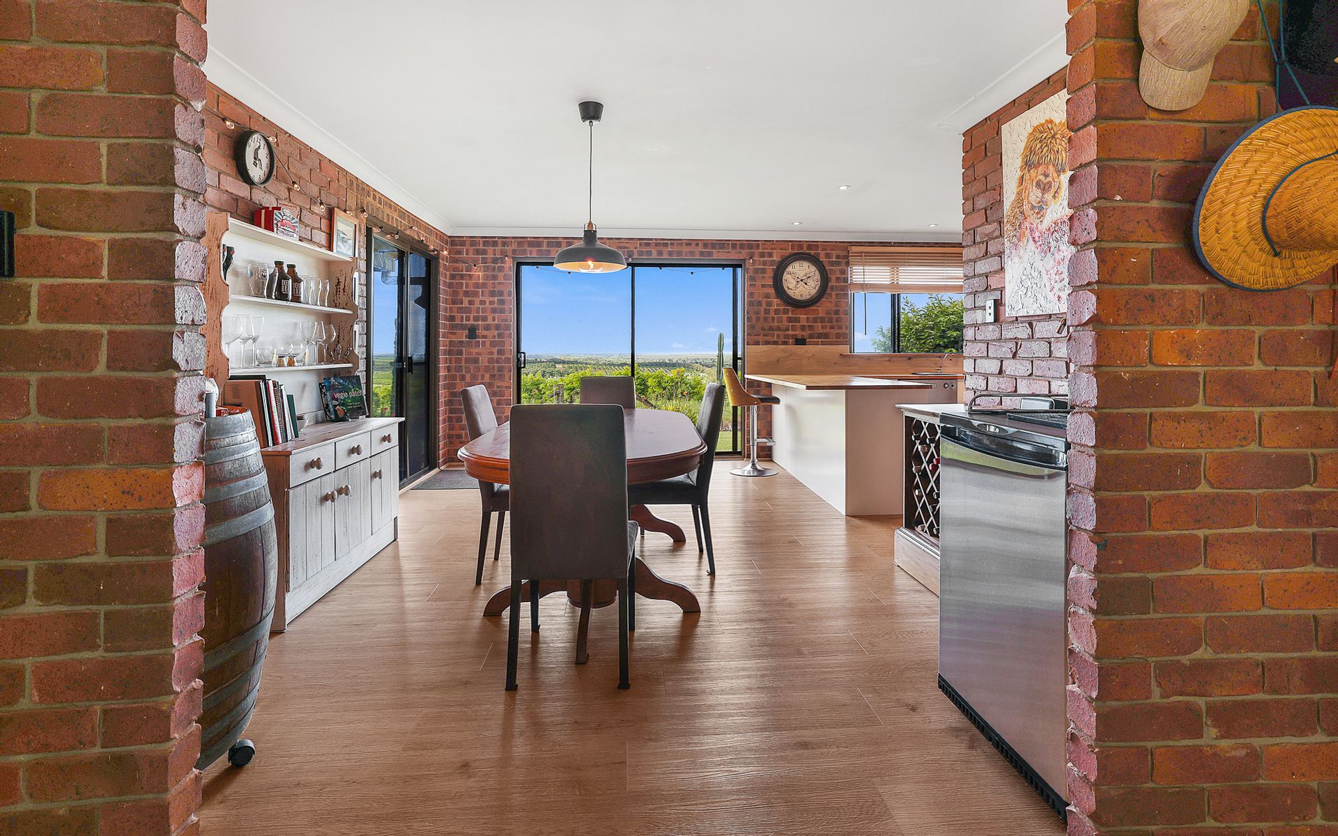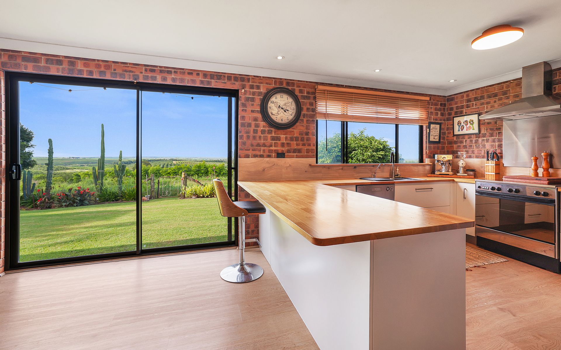 A well-appointed kitchen with sleek timber bench tops for that extra touch of country, the kitchen includes a dishwasher, a large gas cooker with stainless steel range hood, a good size kitchen with plenty of storage including a walk-in pantry and a breakfast bar with the beautiful outlook over the rolling countryside, the outdoor patio provides lovely rural views for all your family BBQ's.