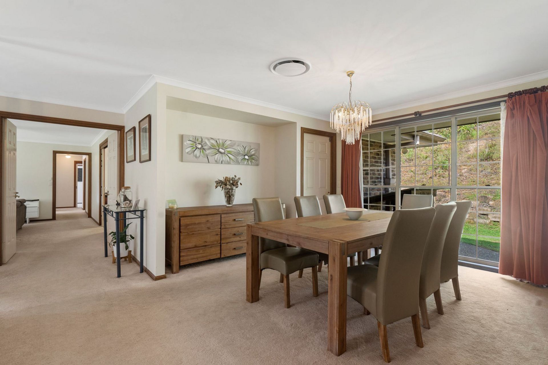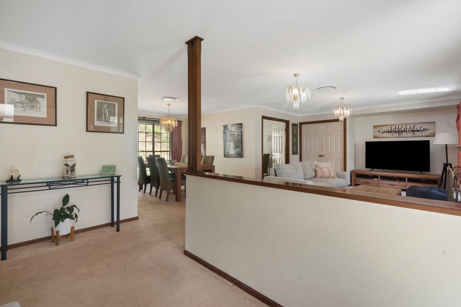 * Formal lounge room with open fireplace connects to the formal dining area.