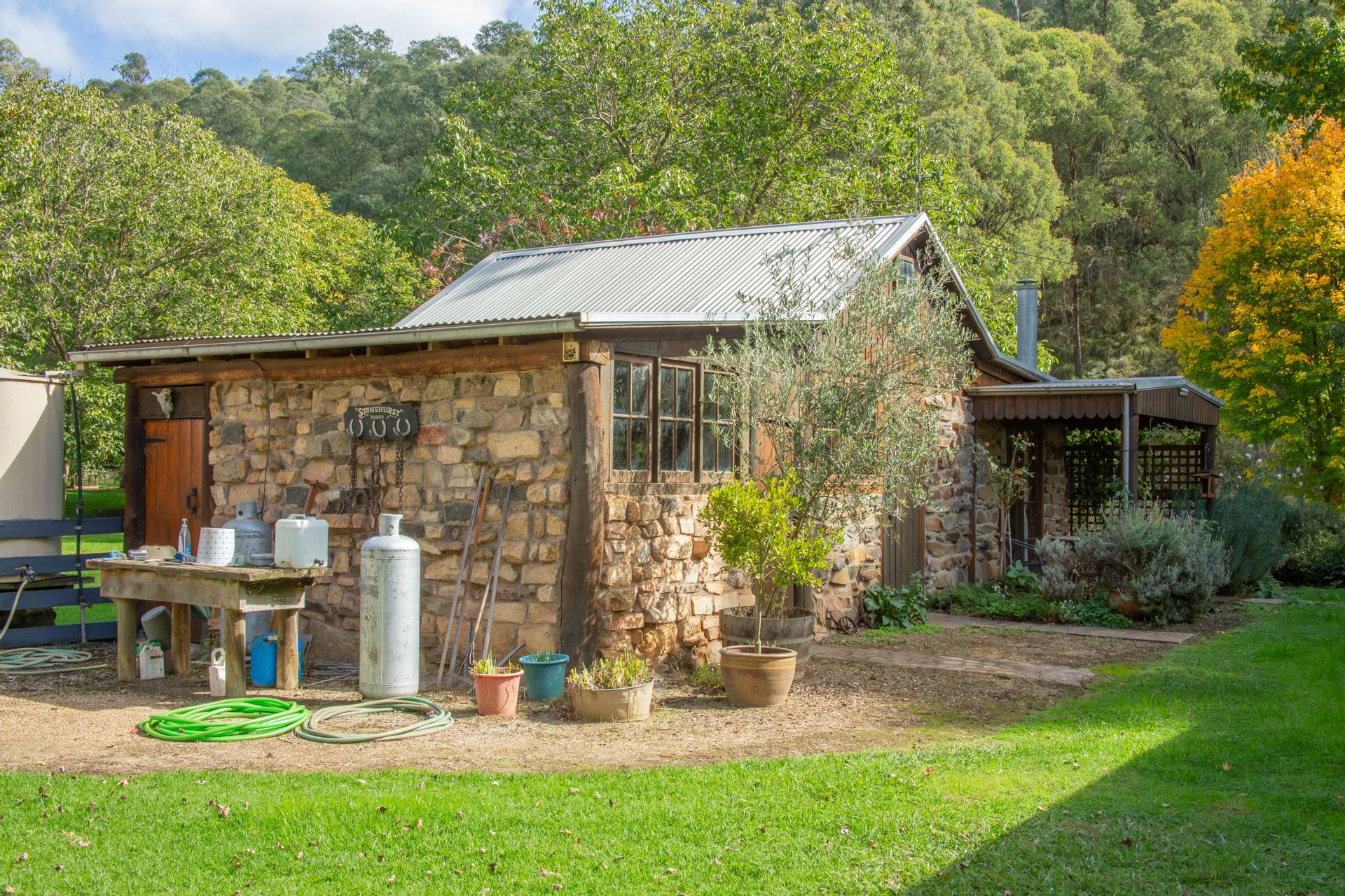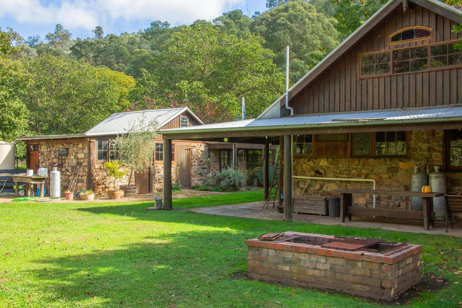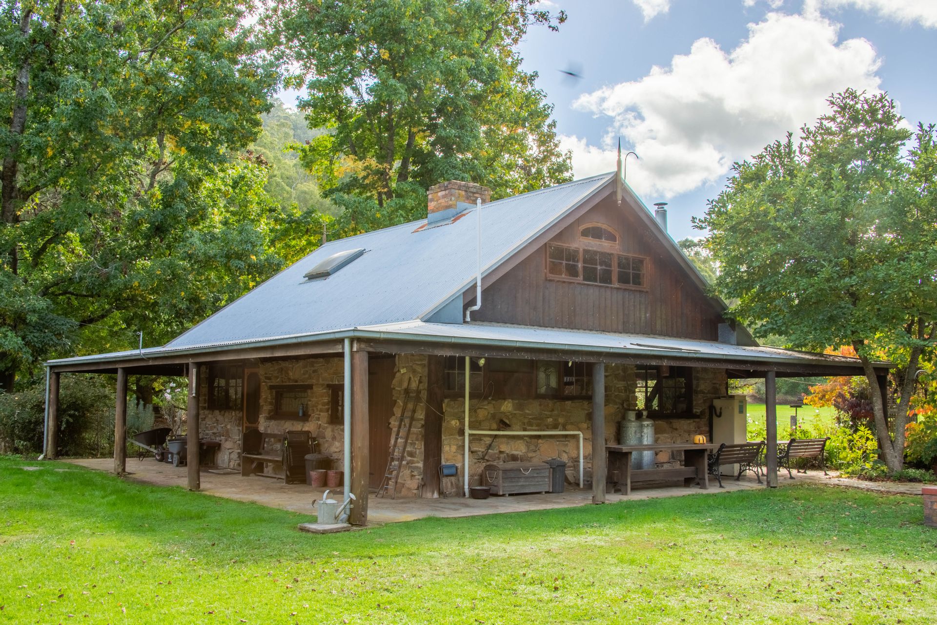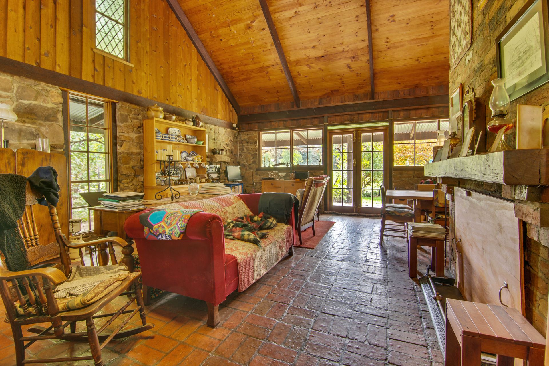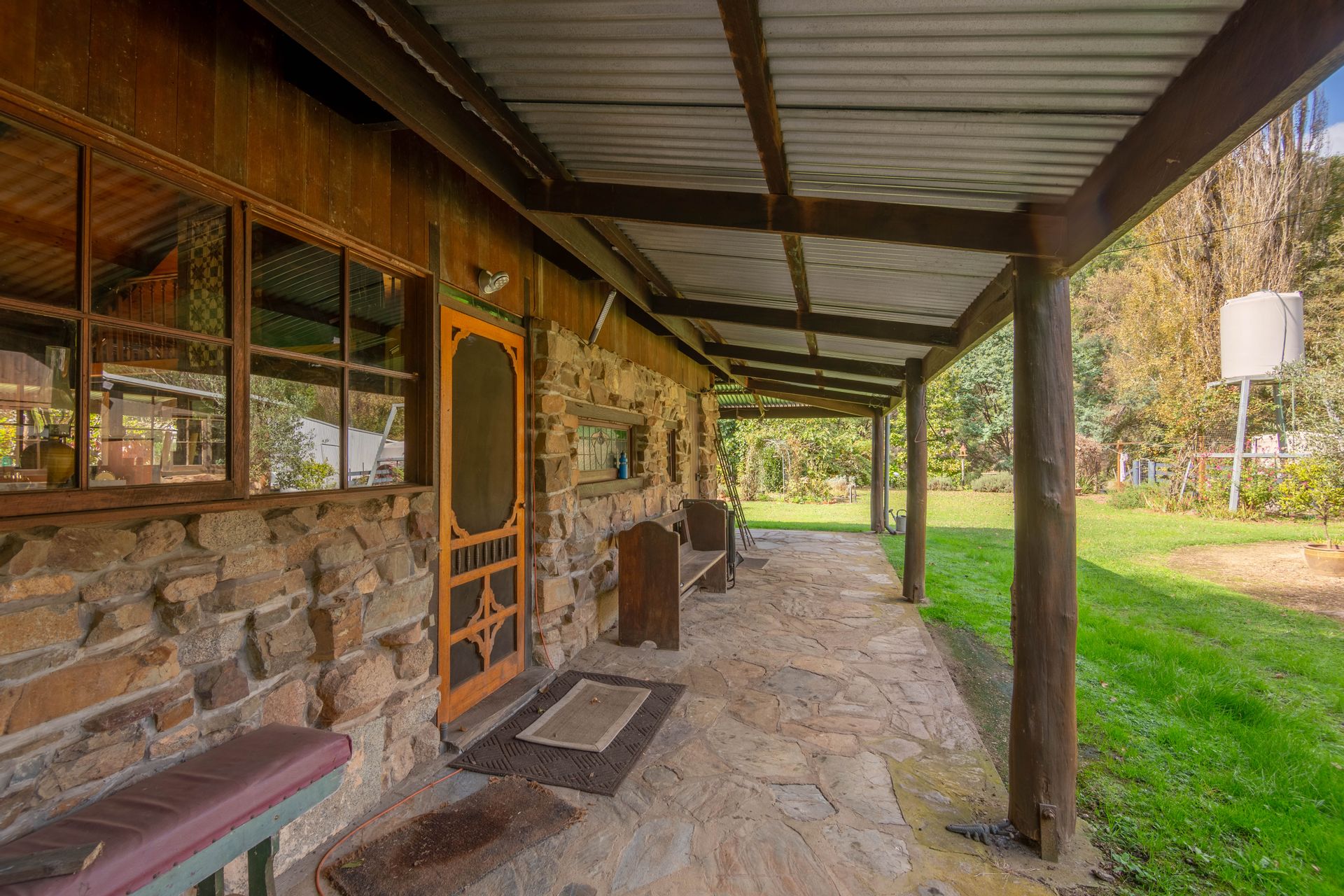 The off-grid homestead with internal loft, and extensive outhouse buildings including workshops, garage and studio have been tastefully built from many reclaimed materials with the build commencing in 1989 and taking a period over four years to complete while occupying the old log cabin on weekends and holidays from full time employment. Stones were gathered from the roadsides and from old ruins in the Dargo area, over 3000 handmade bricks reclaimed from the historic and demolished Pram Factory Theater in Carlton, and 500 from the historic Delmore site in Dargo. Stained glass windows purchased from demolition companies and the gothic church window from the abandoned Mallee church just to name a few.