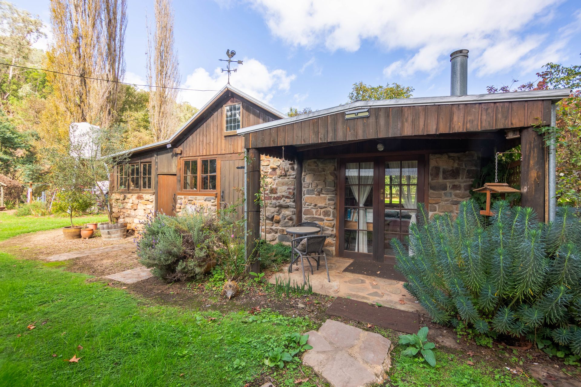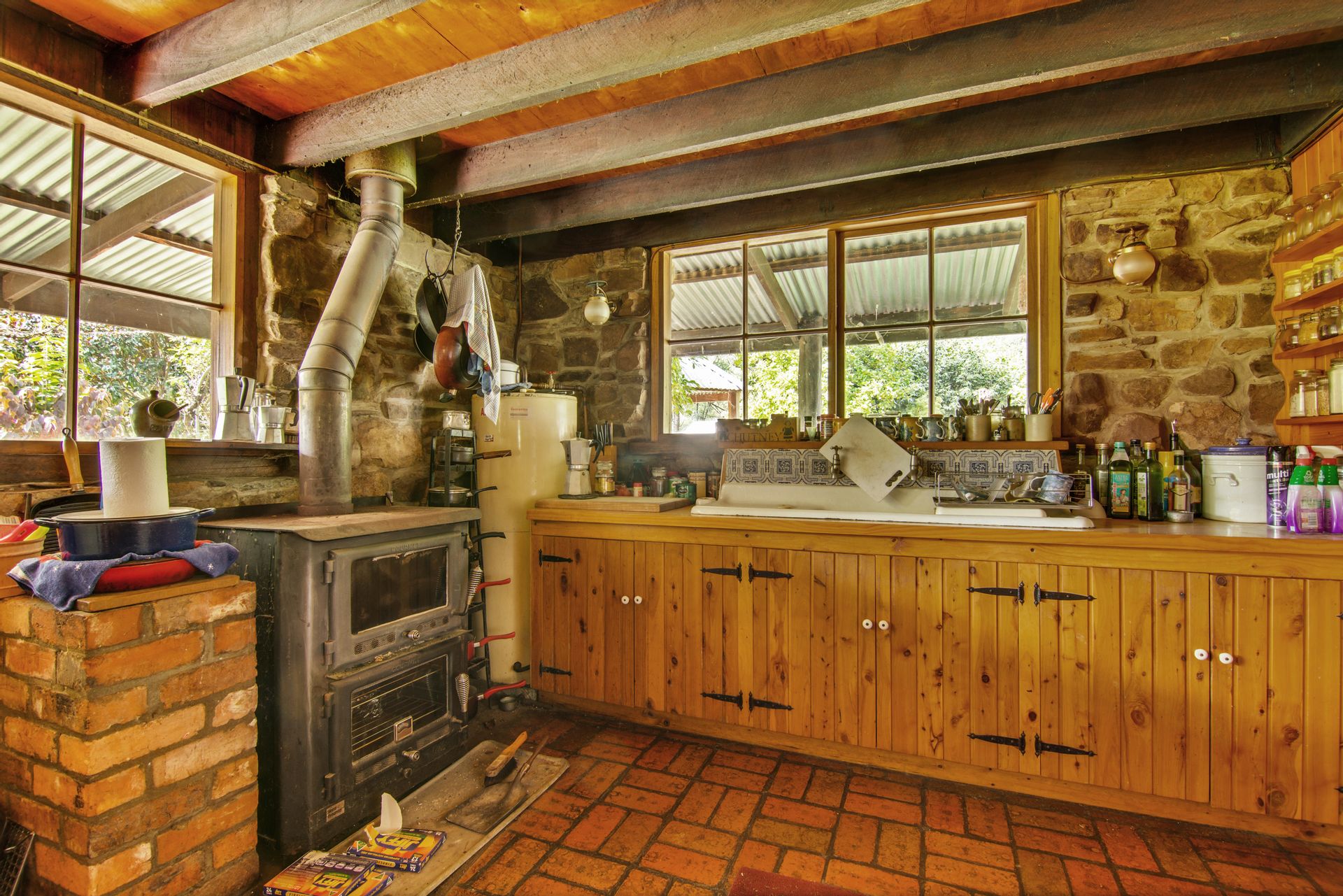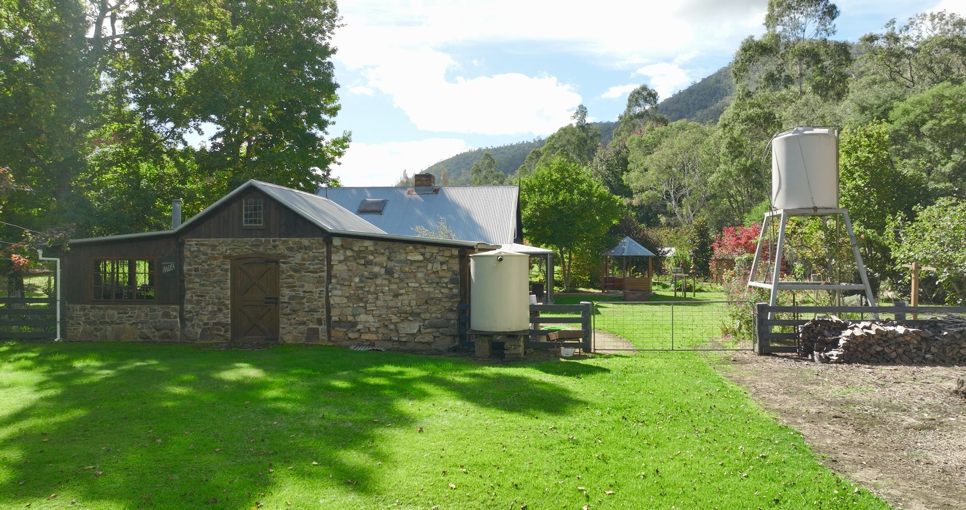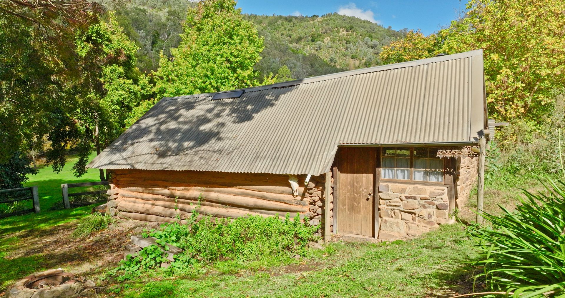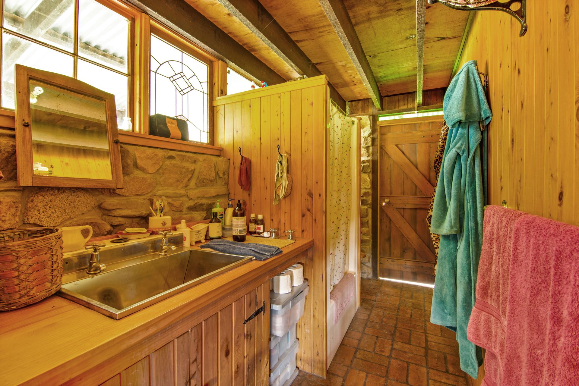 The off-grid homestead with internal loft, and extensive outhouse buildings including workshops, garage and studio have been tastefully built from many reclaimed materials with the build commencing in 1989 and taking a period over four years to complete while occupying the old log cabin on weekends and holidays from full time employment. Stones were gathered from the roadsides and from old ruins in the Dargo area, over 3000 handmade bricks reclaimed from the historic and demolished Pram Factory Theater in Carlton, and 500 from the historic Delmore site in Dargo. Stained glass windows purchased from demolition companies and the gothic church window from the abandoned Mallee church just to name a few.