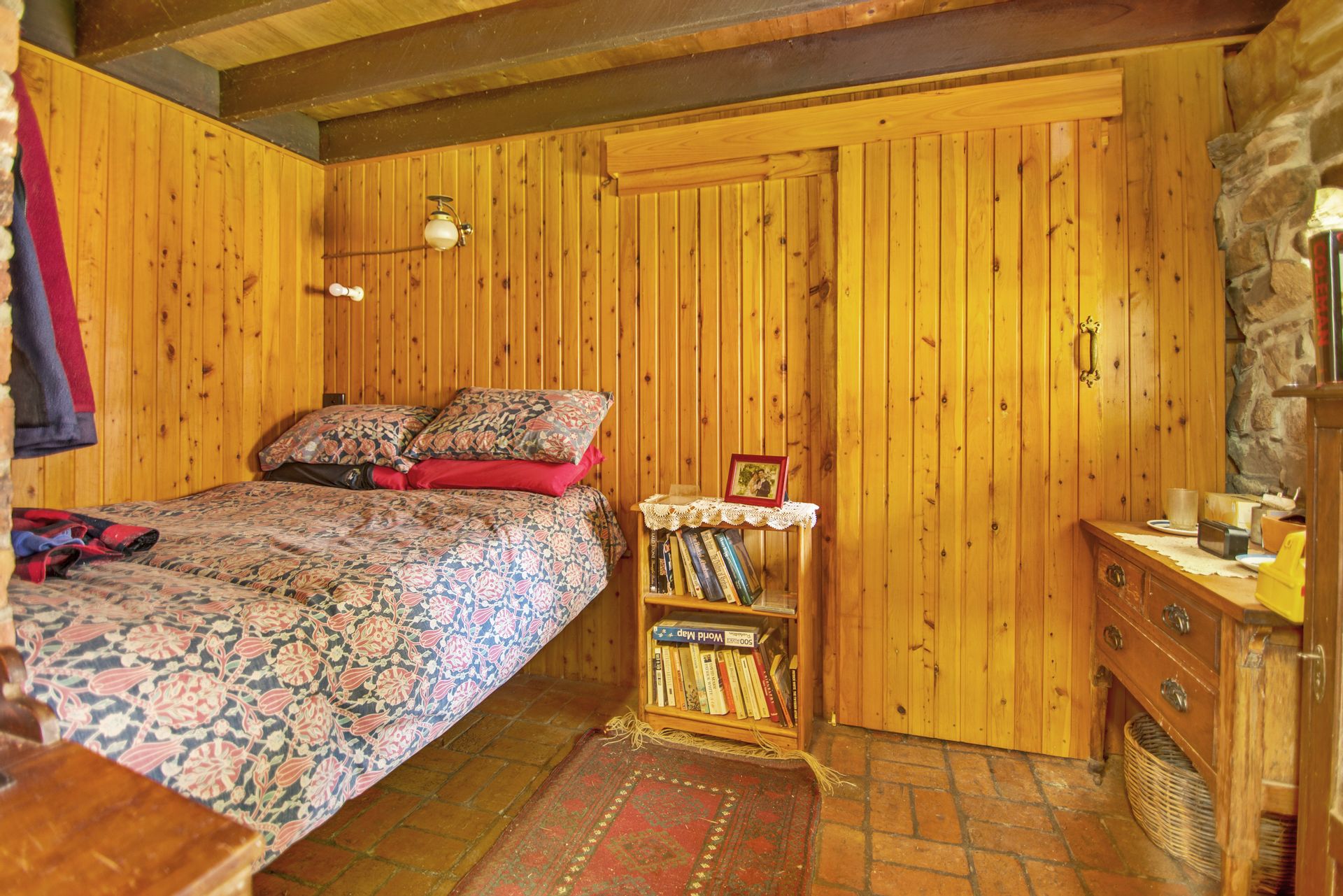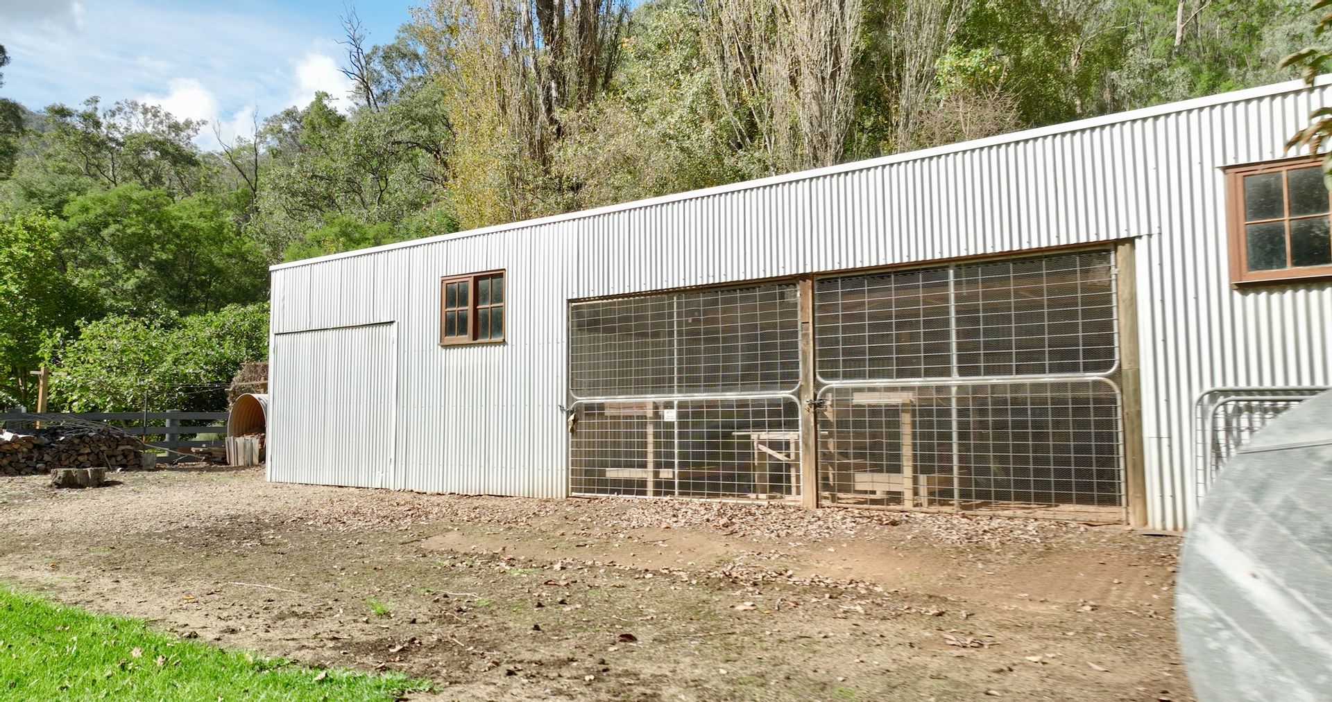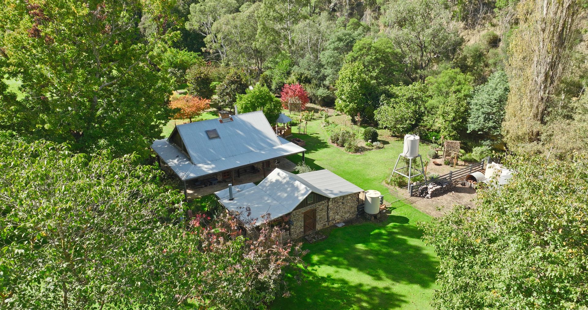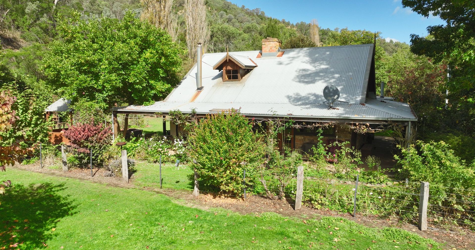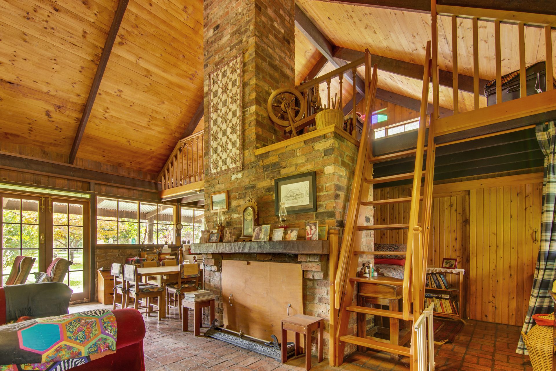 The off-grid homestead with internal loft, and extensive outhouse buildings including workshops, garage and studio have been tastefully built from many reclaimed materials with the build commencing in 1989 and taking a period over four years to complete while occupying the old log cabin on weekends and holidays from full time employment. Stones were gathered from the roadsides and from old ruins in the Dargo area, over 3000 handmade bricks reclaimed from the historic and demolished Pram Factory Theater in Carlton, and 500 from the historic Delmore site in Dargo. Stained glass windows purchased from demolition companies and the gothic church window from the abandoned Mallee church just to name a few.
