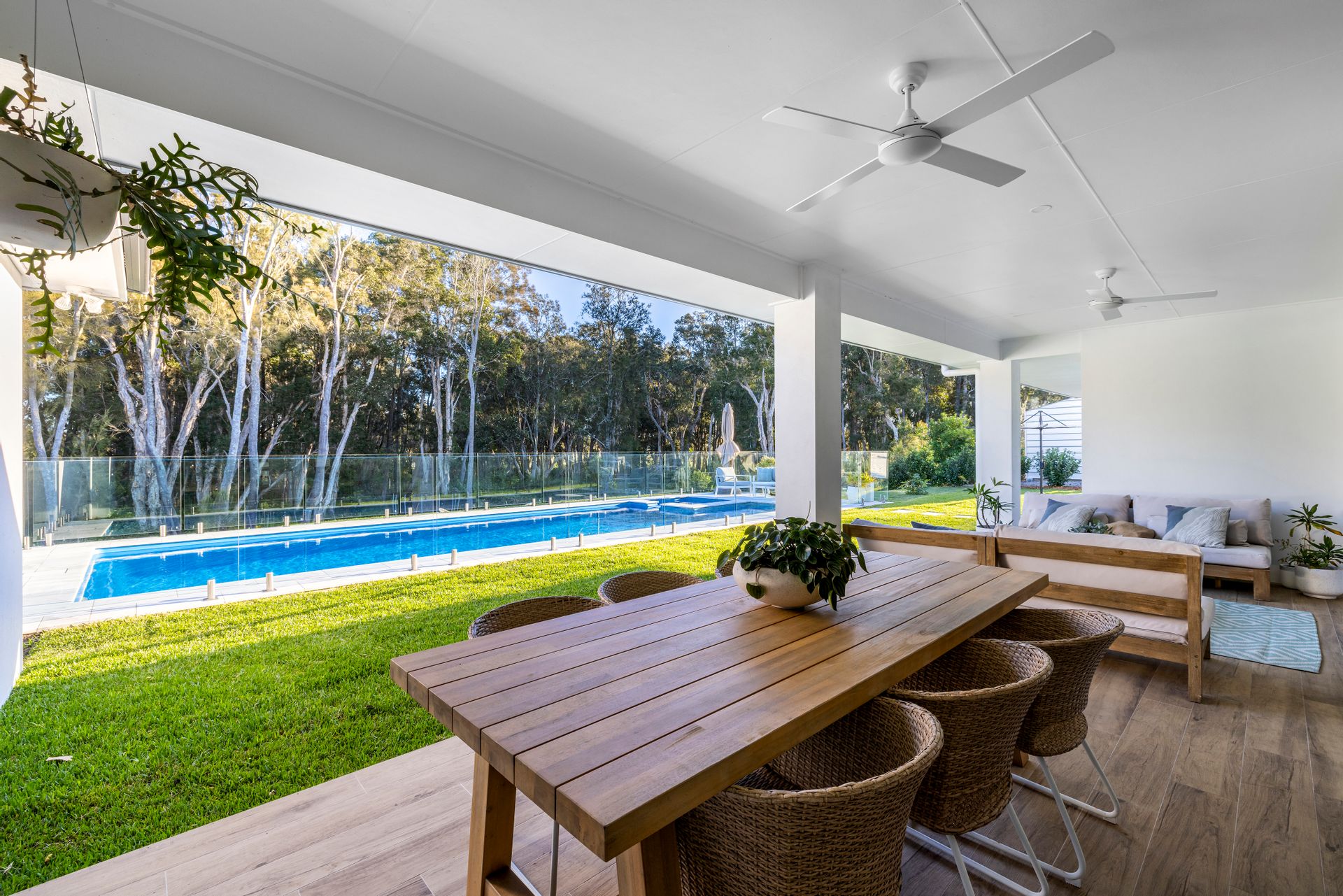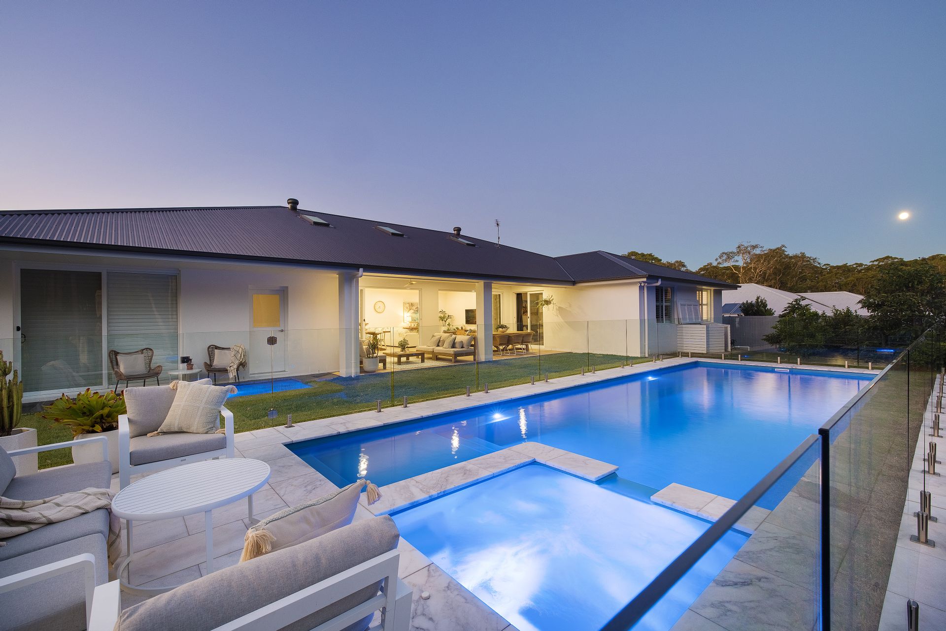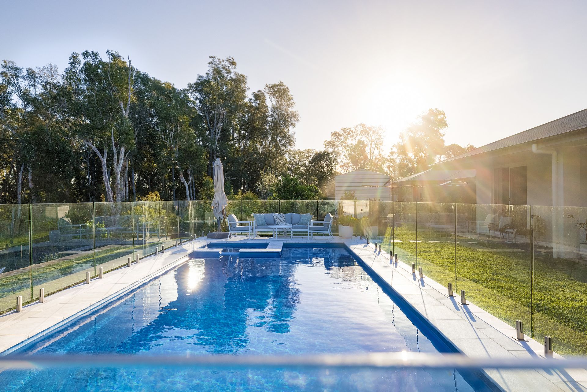 Lush grass splits the home from the pool area where this stunning feature is dressed in frameless glass and marble tiling. The pool is basking in sunlight year-round and has a beach area and built-in spa. Cool off on a hot day and float around while enjoying the green vista beyond. The grassy area cascades down to a large gravel fire pit area and continues down to the lower grassy area. Lots of space for the kids to jump on a trampoline, kick a ball, and explore.