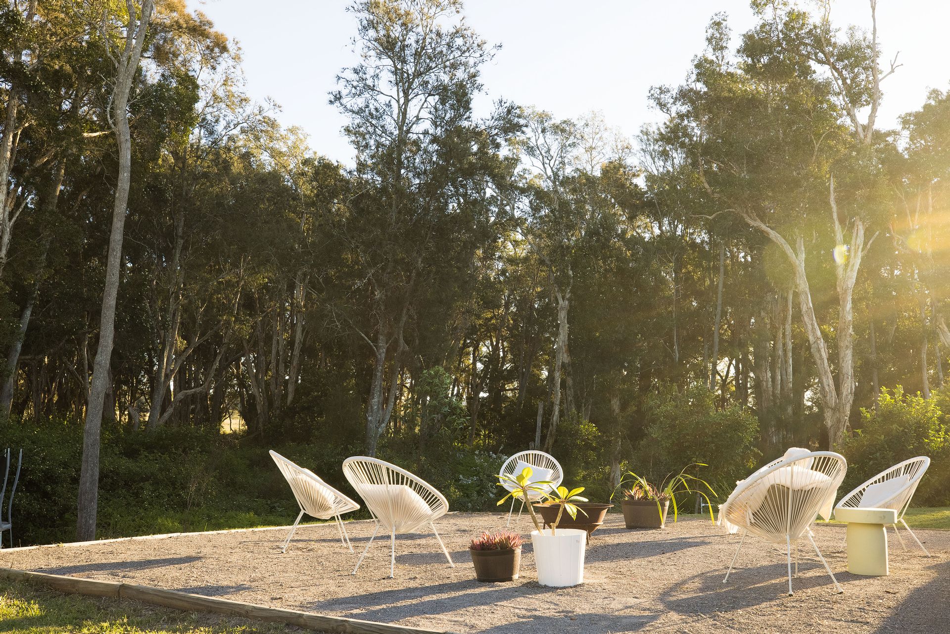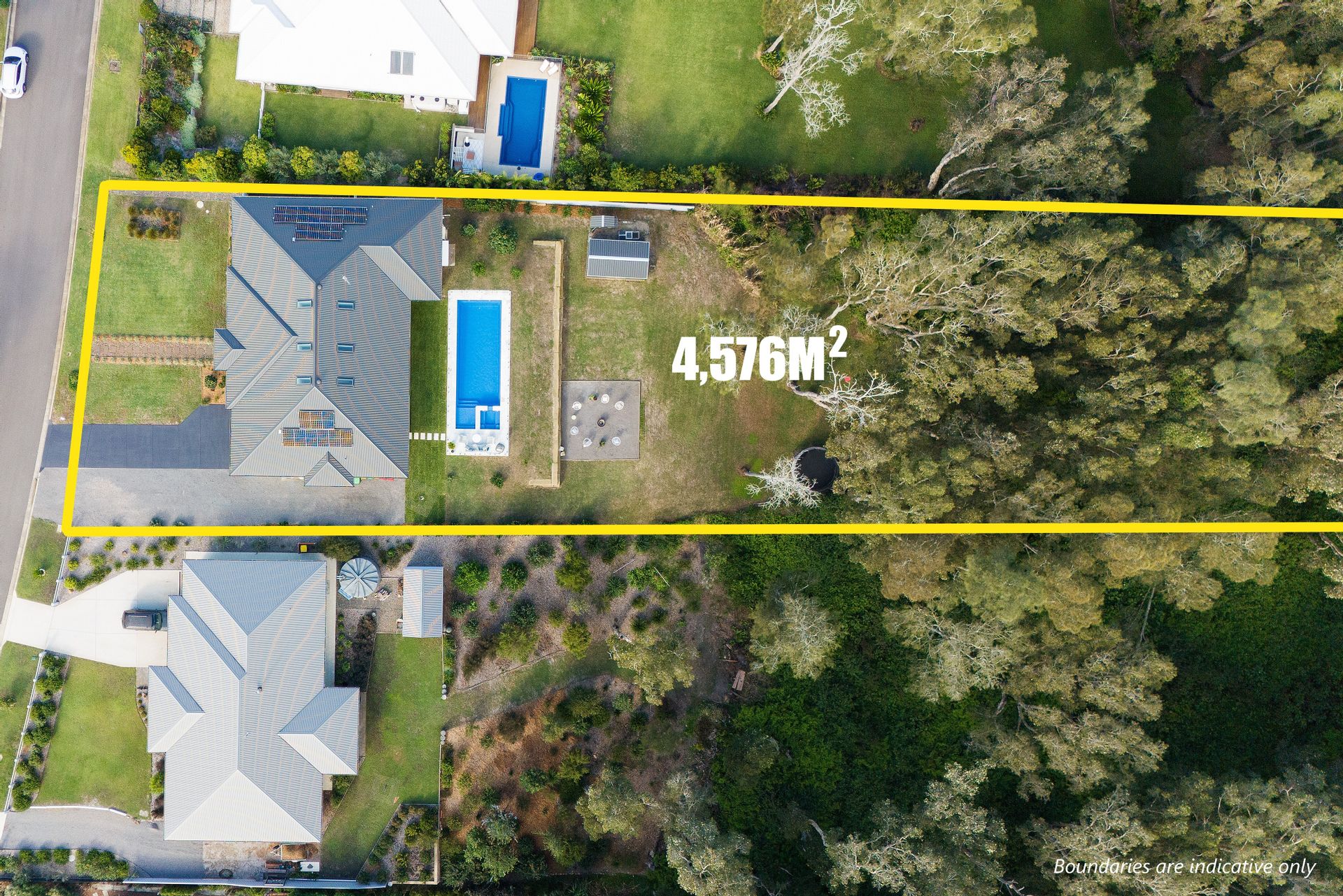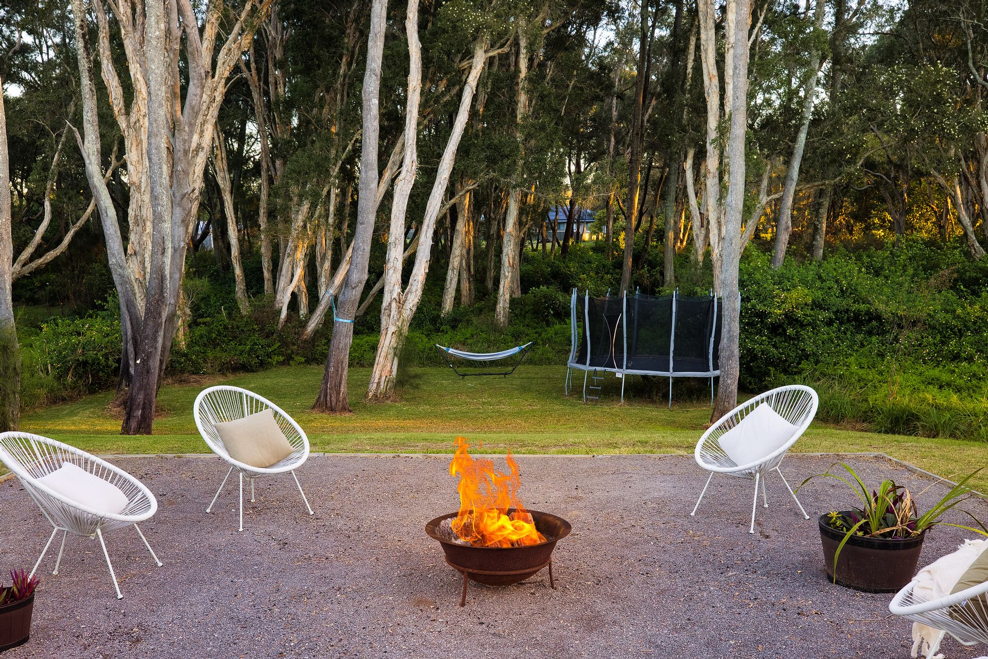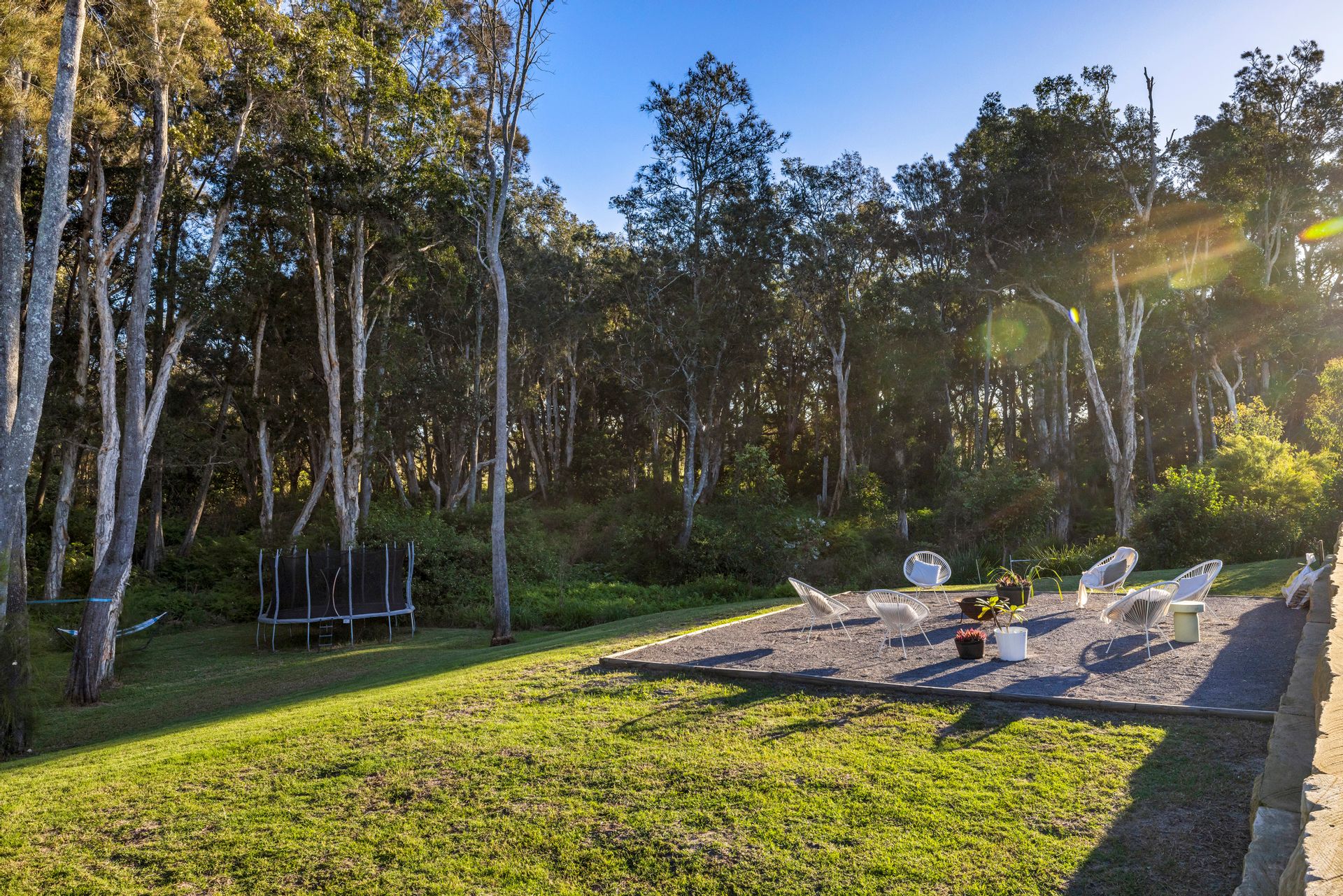 Lush grass splits the home from the pool area where this stunning feature is dressed in frameless glass and marble tiling. The pool is basking in sunlight year-round and has a beach area and built-in spa. Cool off on a hot day and float around while enjoying the green vista beyond. The grassy area cascades down to a large gravel fire pit area and continues down to the lower grassy area. Lots of space for the kids to jump on a trampoline, kick a ball, and explore.