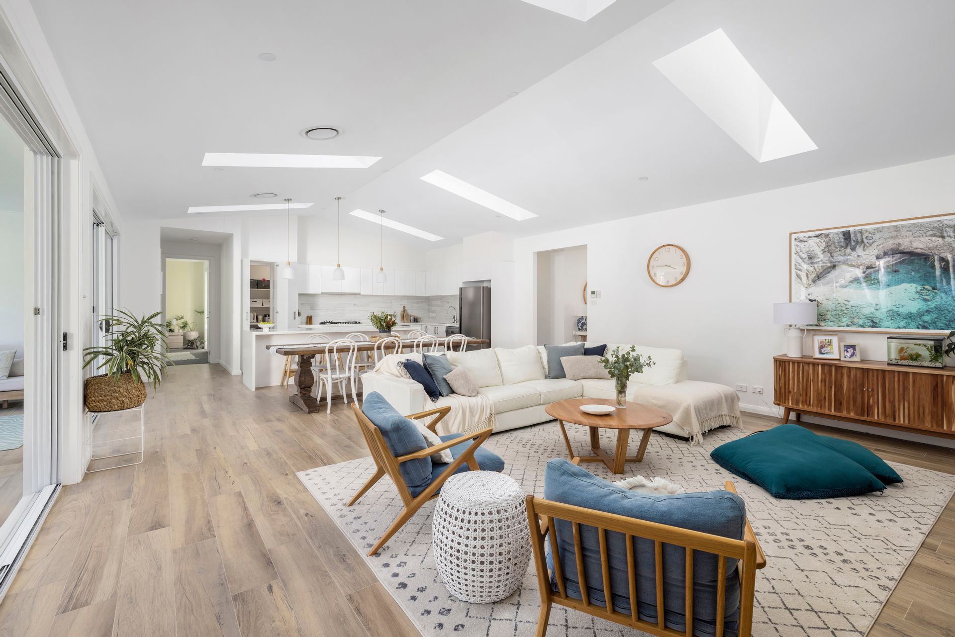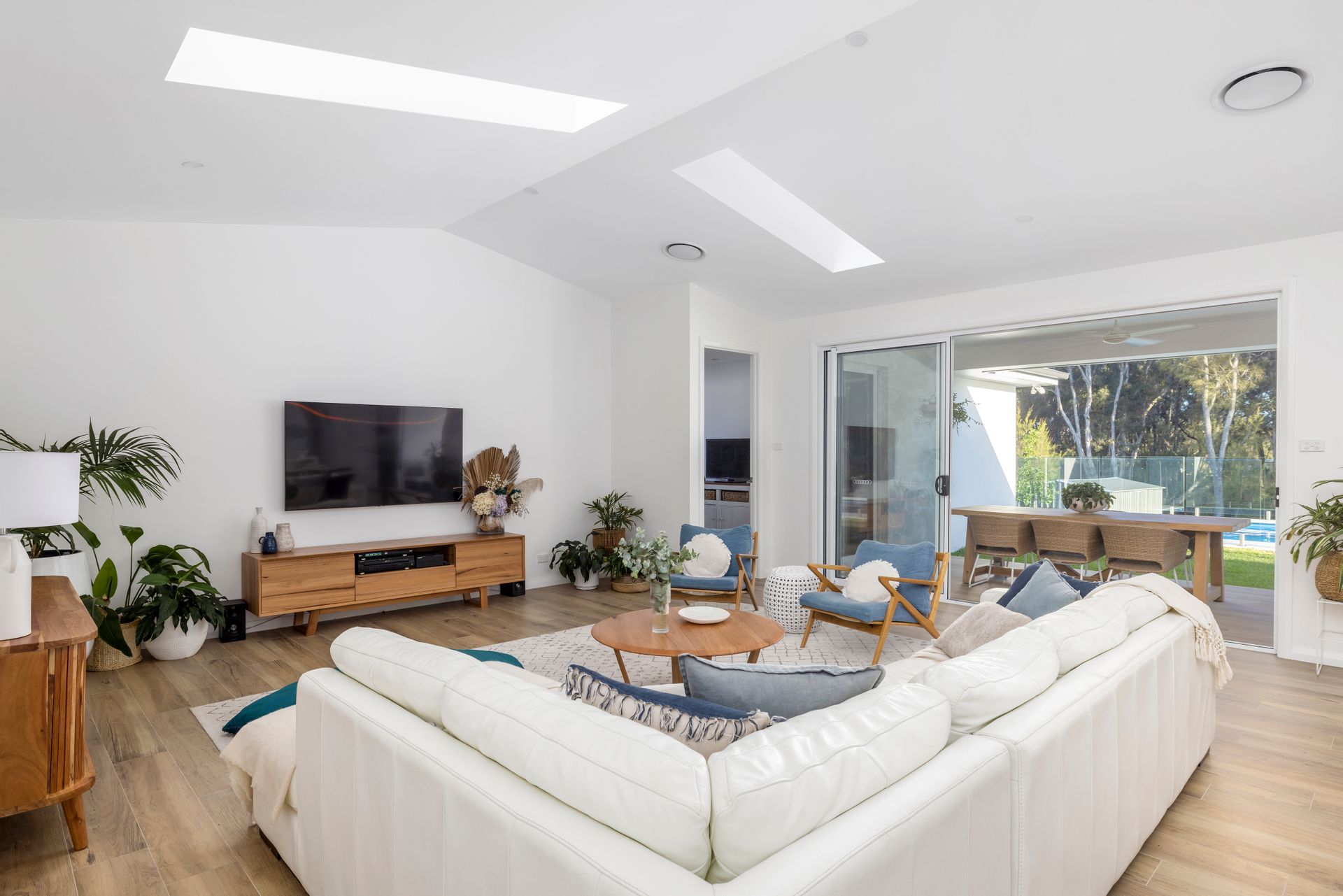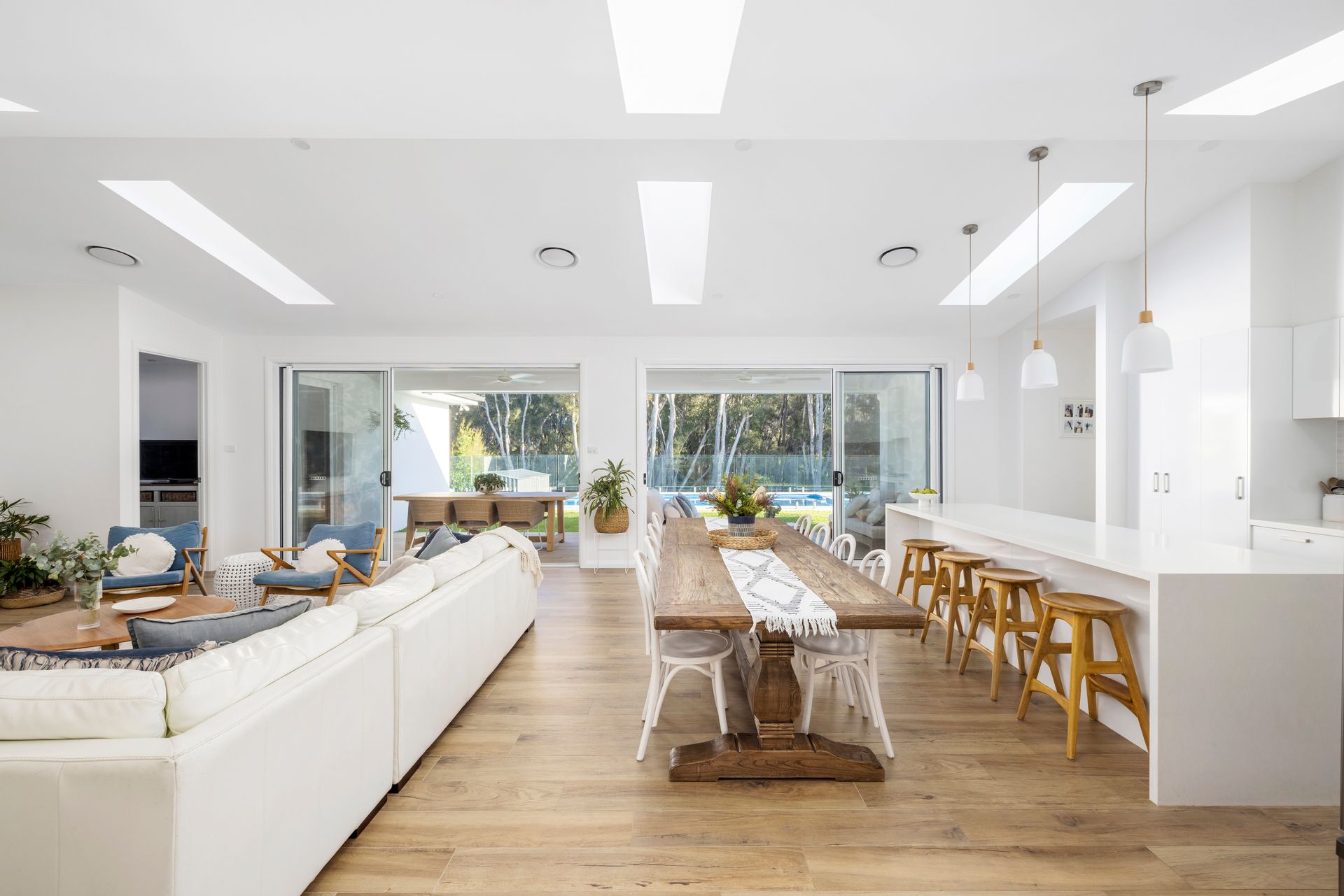 Moving past the attractive facade, gardens and into the home, let the warmth and character of this stunning home wash over you. Leading forth from the generous and inviting formal entry, you'll find the home open right up to present to you a stunning open-plan living, dining, and kitchen area with vaulted ceilings and a beautiful view over the pool and out to the lovely treescape beyond. Six large skylights flood the home with natural light and give a glimpse of clouds and sky. The luxe kitchen hosts a 6-burner gas cooktop, large oven, stone-top and waterfall island bench, and discrete walk-in pantry. Outdoor flow is seamlessly achieved thanks to the double bank of triple stacking sliding doors, connecting to the large alfresco area where there is ample area to host grand dinners, sit back and lounge around with friends, or simply bask in the serenity this lifestyle property delivers.
