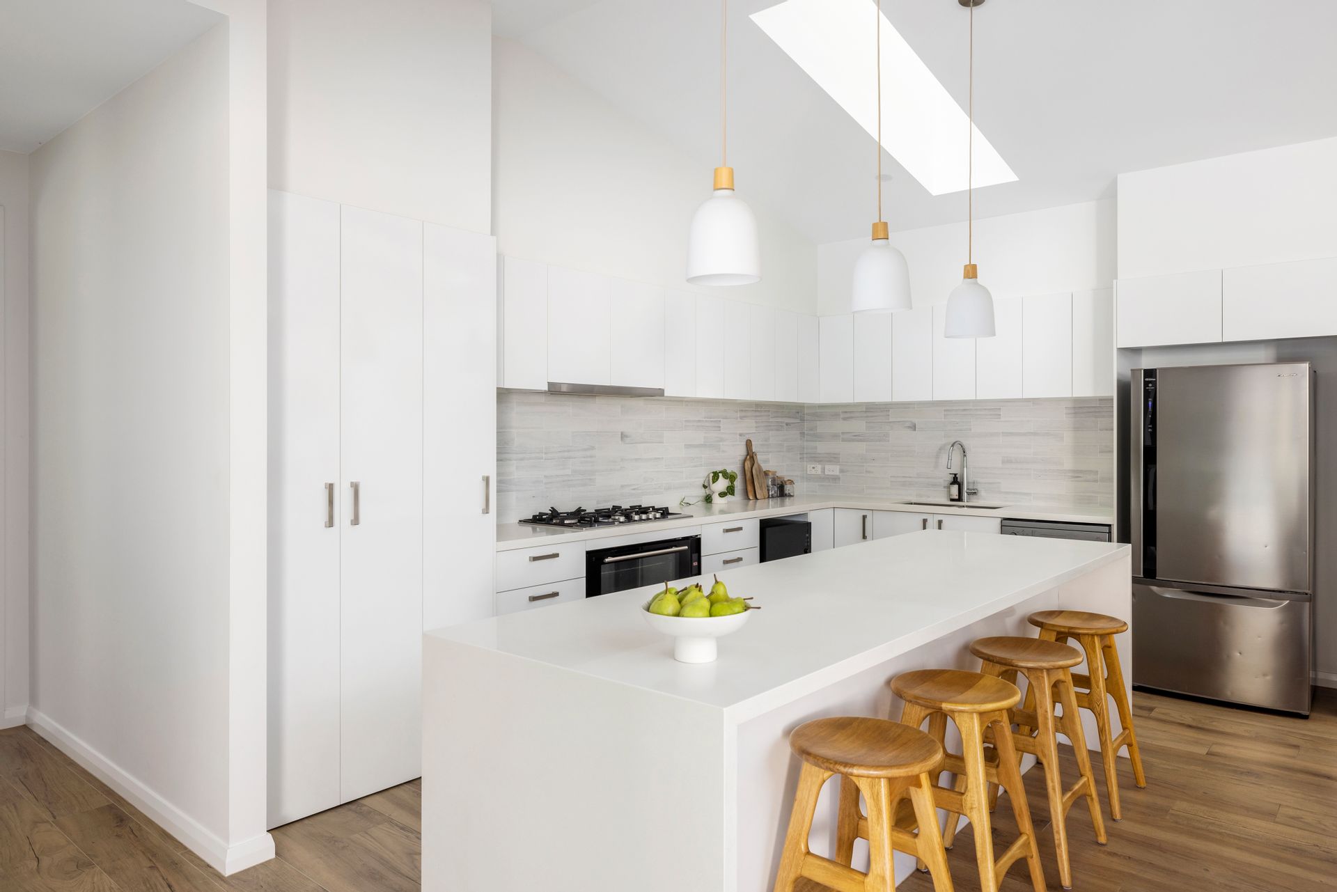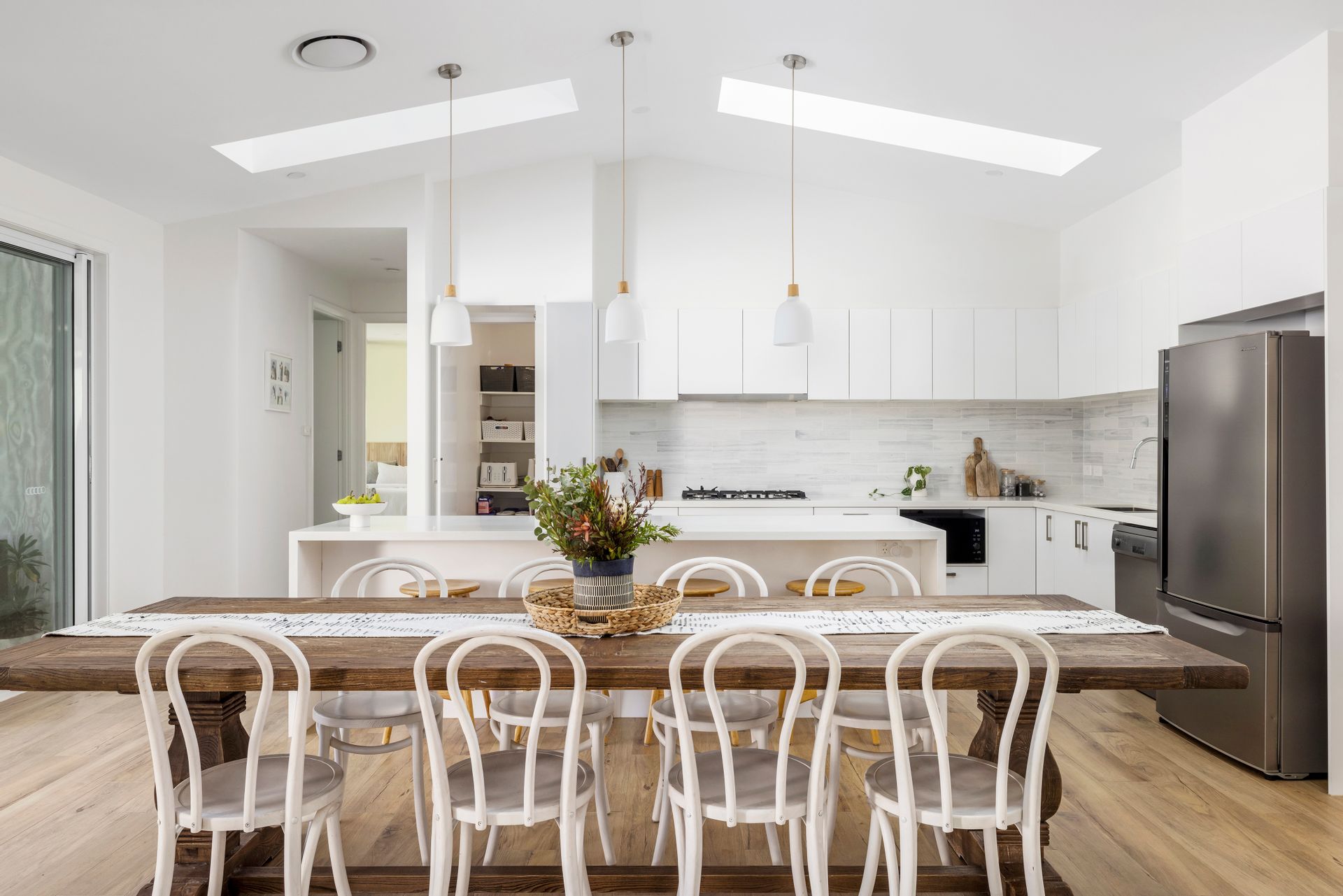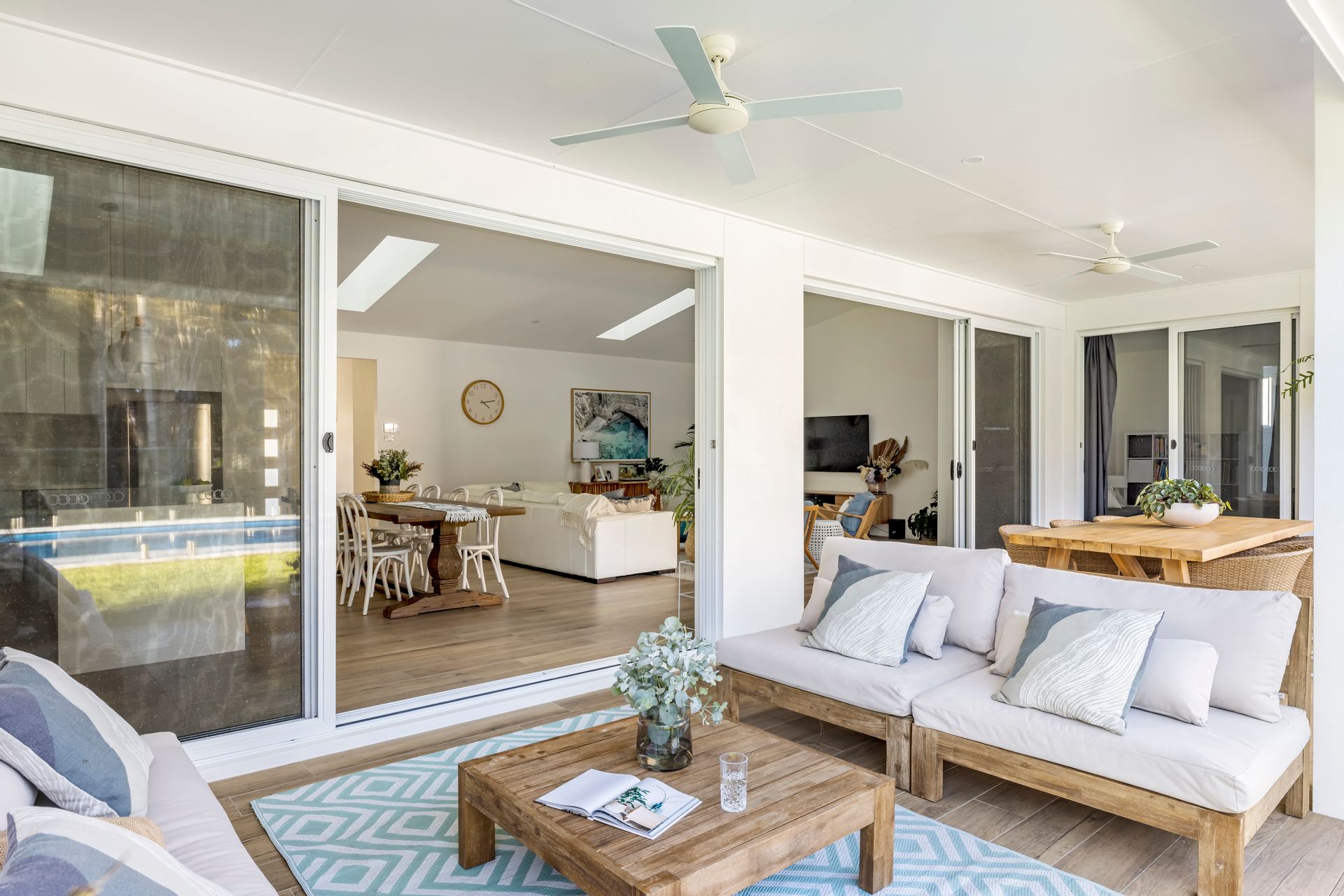 Moving past the attractive facade, gardens and into the home, let the warmth and character of this stunning home wash over you. Leading forth from the generous and inviting formal entry, you'll find the home open right up to present to you a stunning open-plan living, dining, and kitchen area with vaulted ceilings and a beautiful view over the pool and out to the lovely treescape beyond. Six large skylights flood the home with natural light and give a glimpse of clouds and sky. The luxe kitchen hosts a 6-burner gas cooktop, large oven, stone-top and waterfall island bench, and discrete walk-in pantry. Outdoor flow is seamlessly achieved thanks to the double bank of triple stacking sliding doors, connecting to the large alfresco area where there is ample area to host grand dinners, sit back and lounge around with friends, or simply bask in the serenity this lifestyle property delivers.