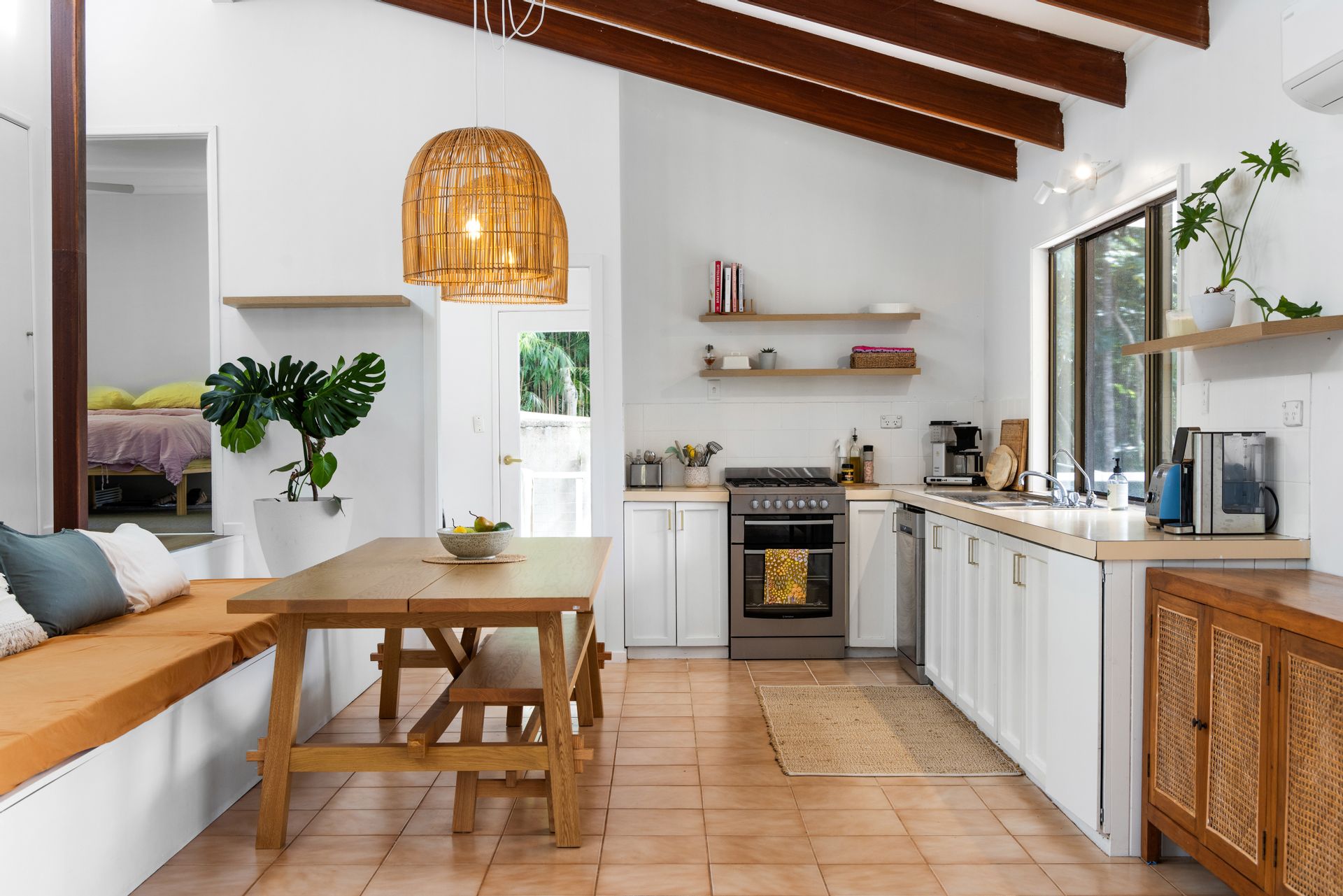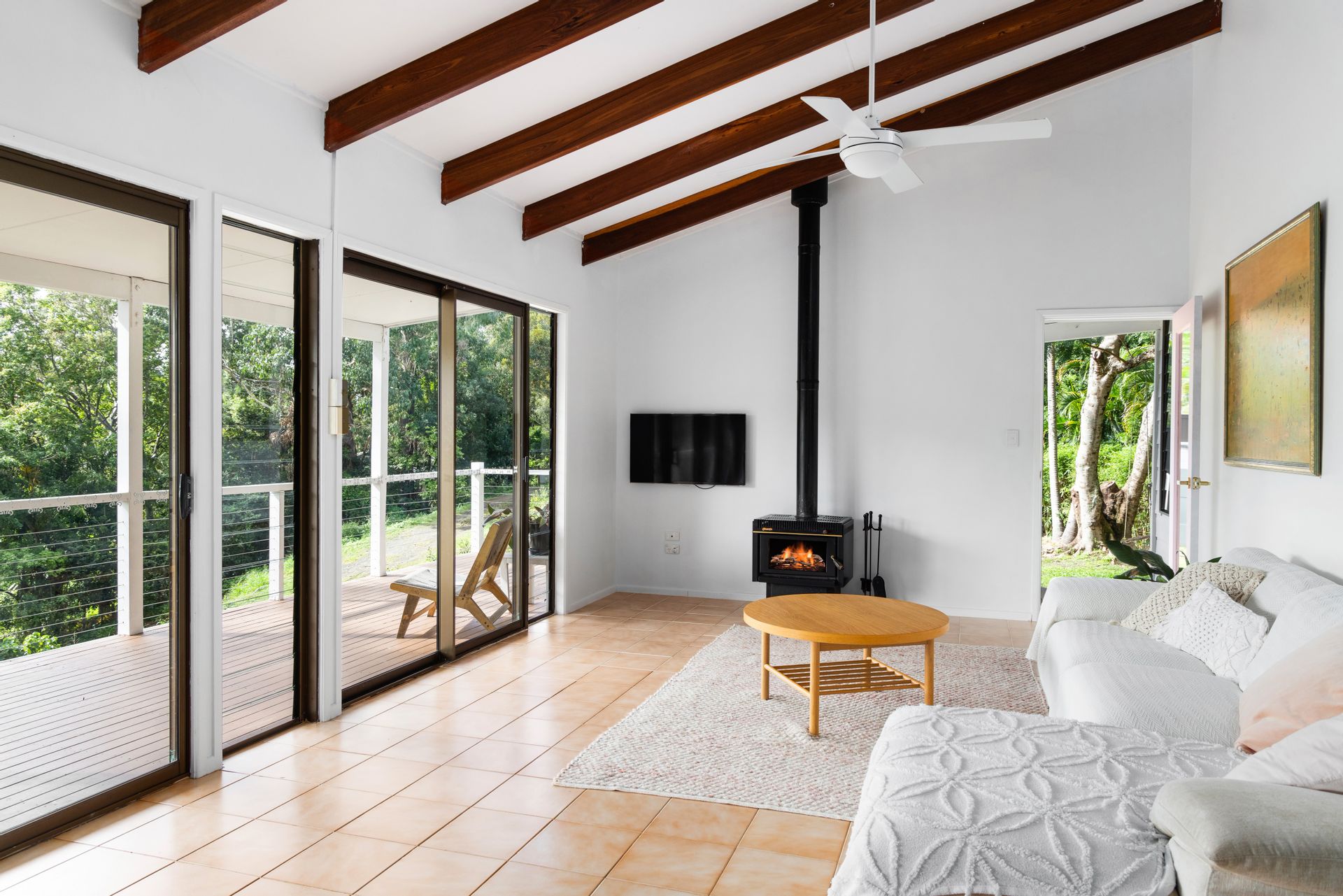 The spilt level home exudes warmth and character, with its vaulted ceilings and exposed timber beams creating a cozy and inviting atmosphere. Natural light floods the interior, while gentle breezes flow through, keeping the home cool and comfortable year-round.