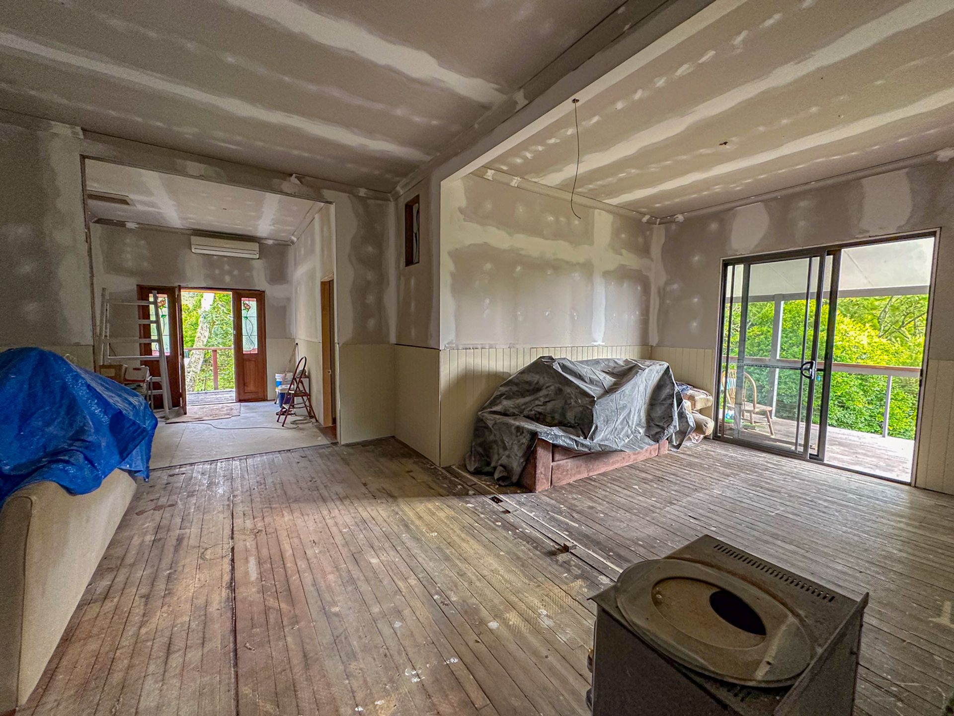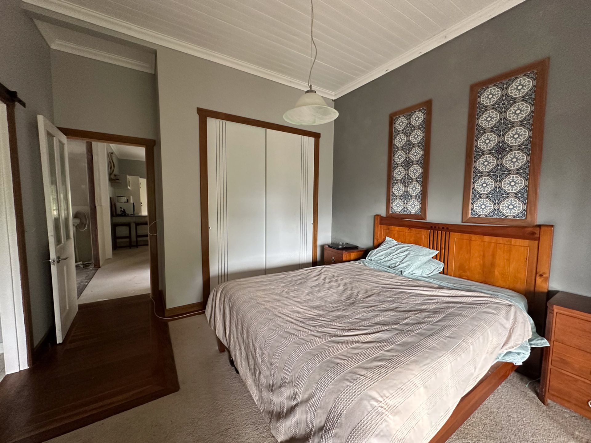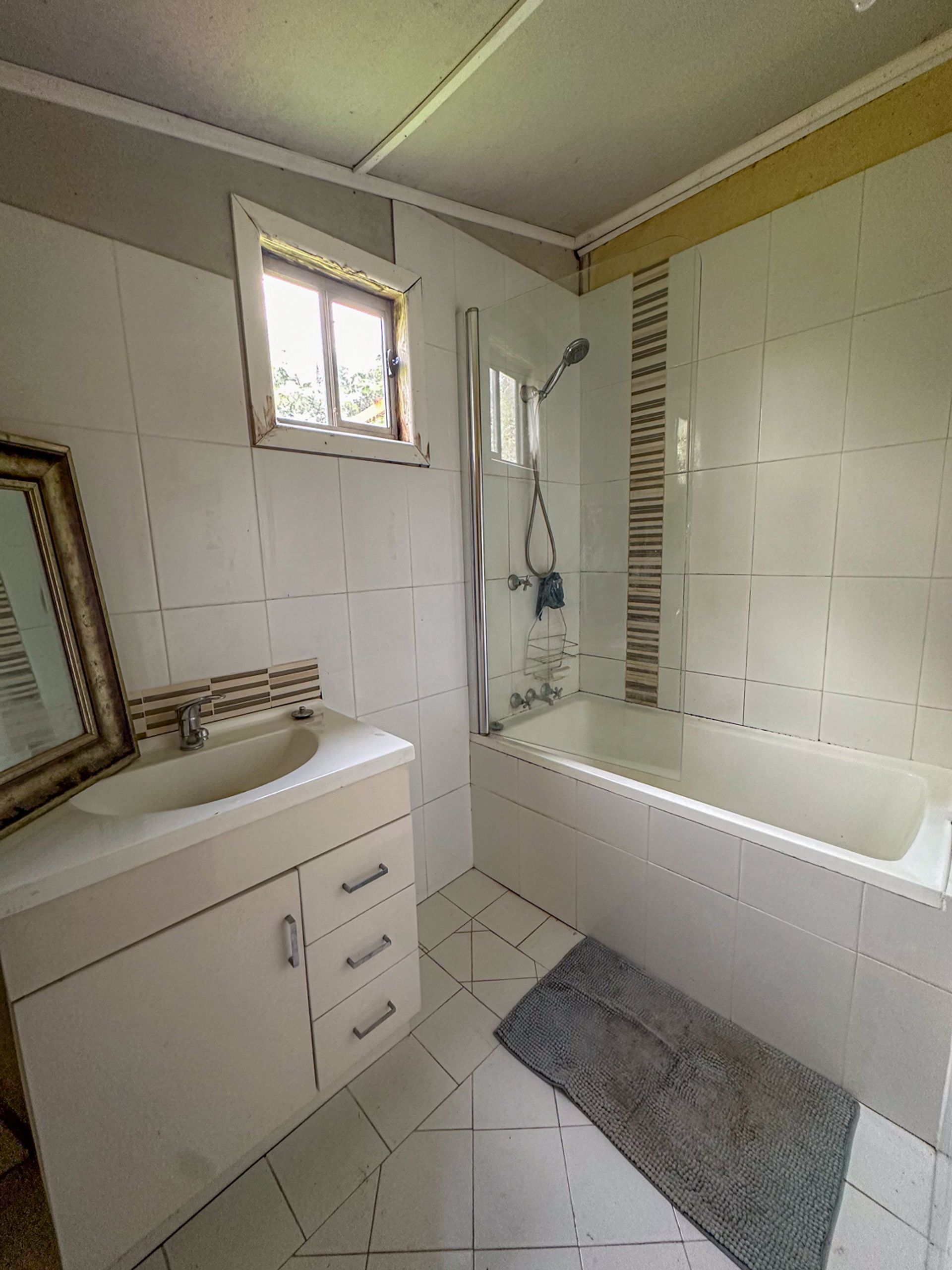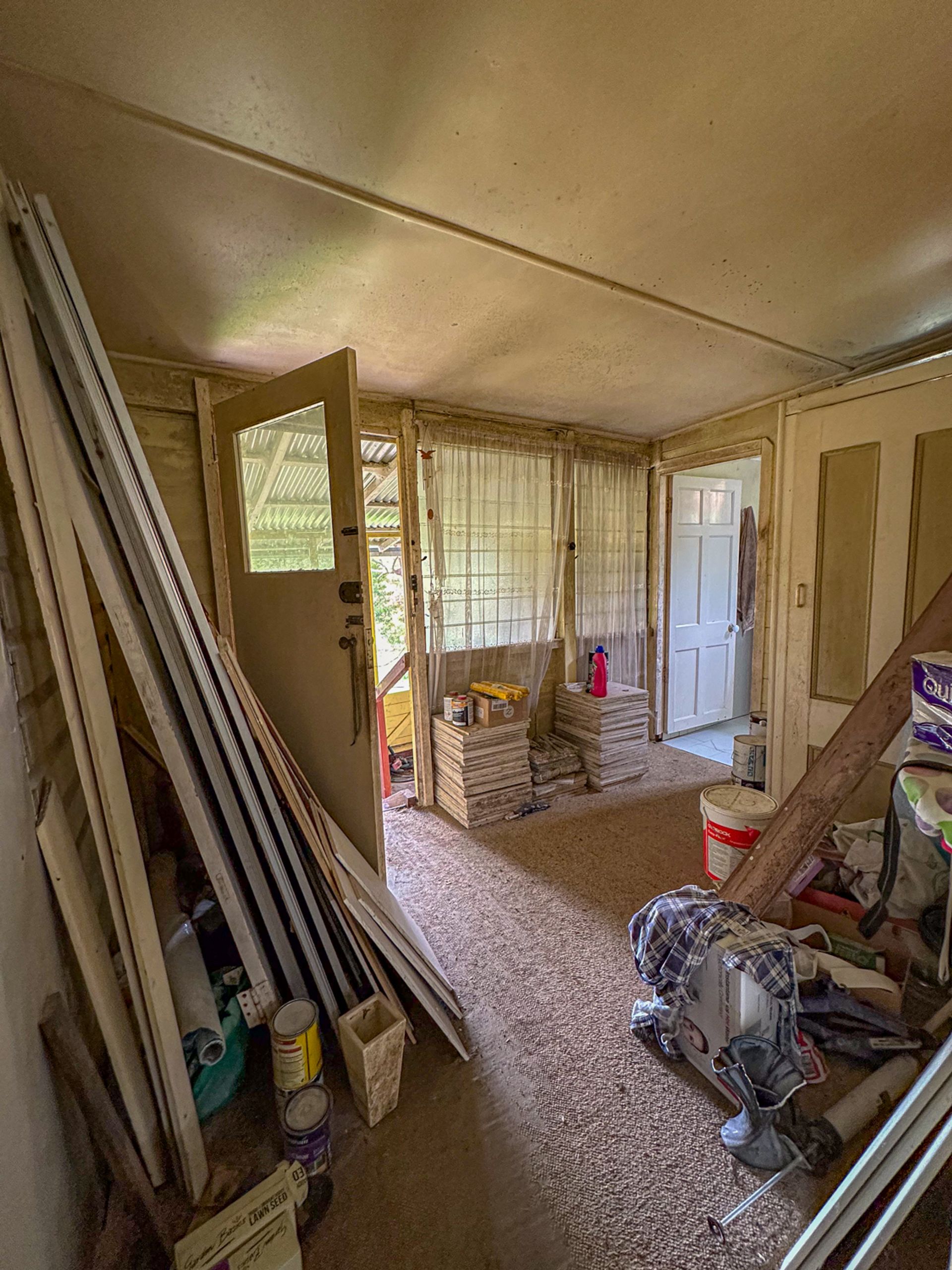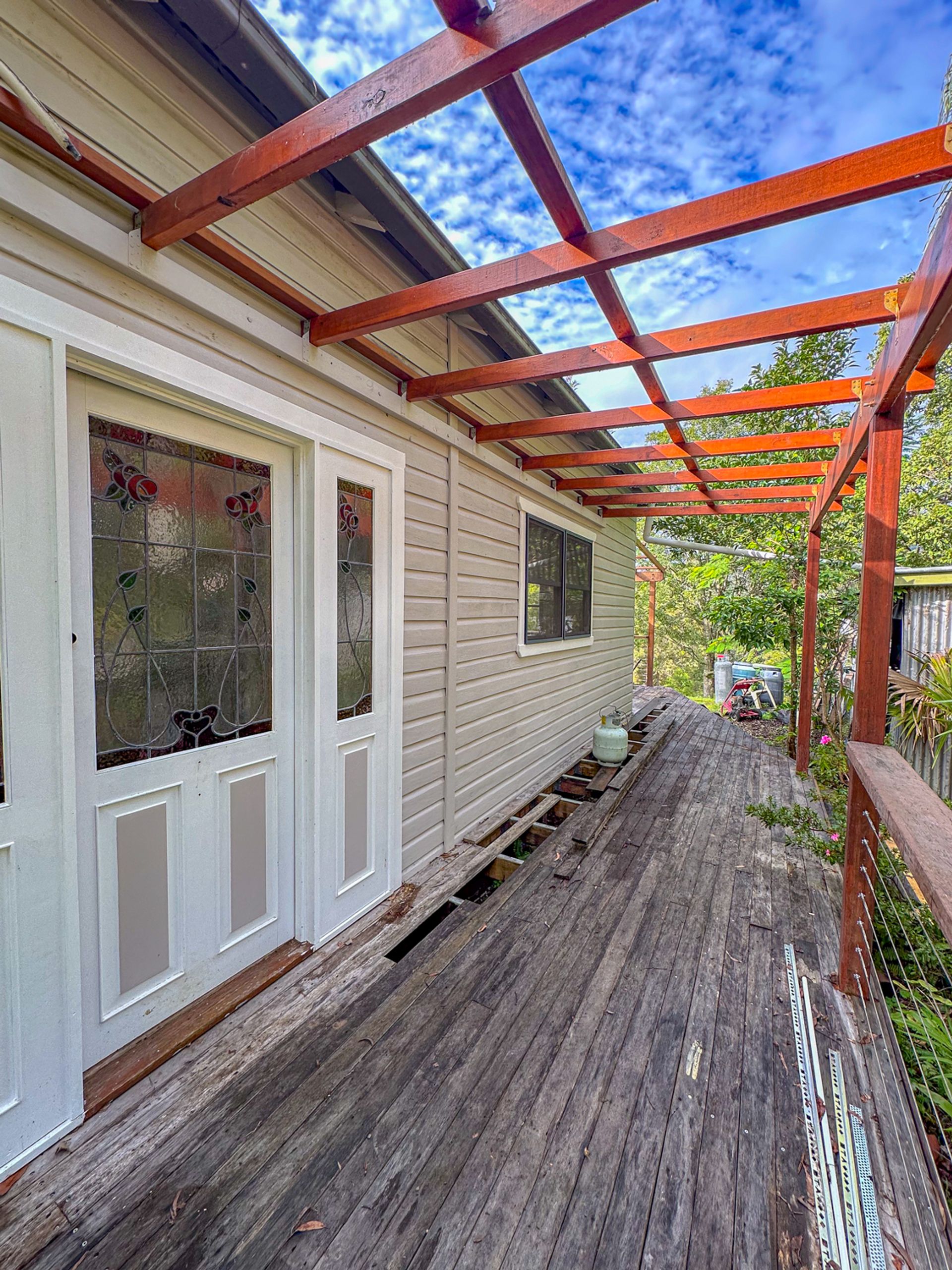 The main bedroom flows out onto the northern deck. Fortunately it has been renovated along with the ensuite with more travertine stone tiling. The original bathroom has had a renovation a few years back and is is fair condition. There are another two bedrooms which are of an older condition. There is a wood heater that has been dissembled for renovation purposes.