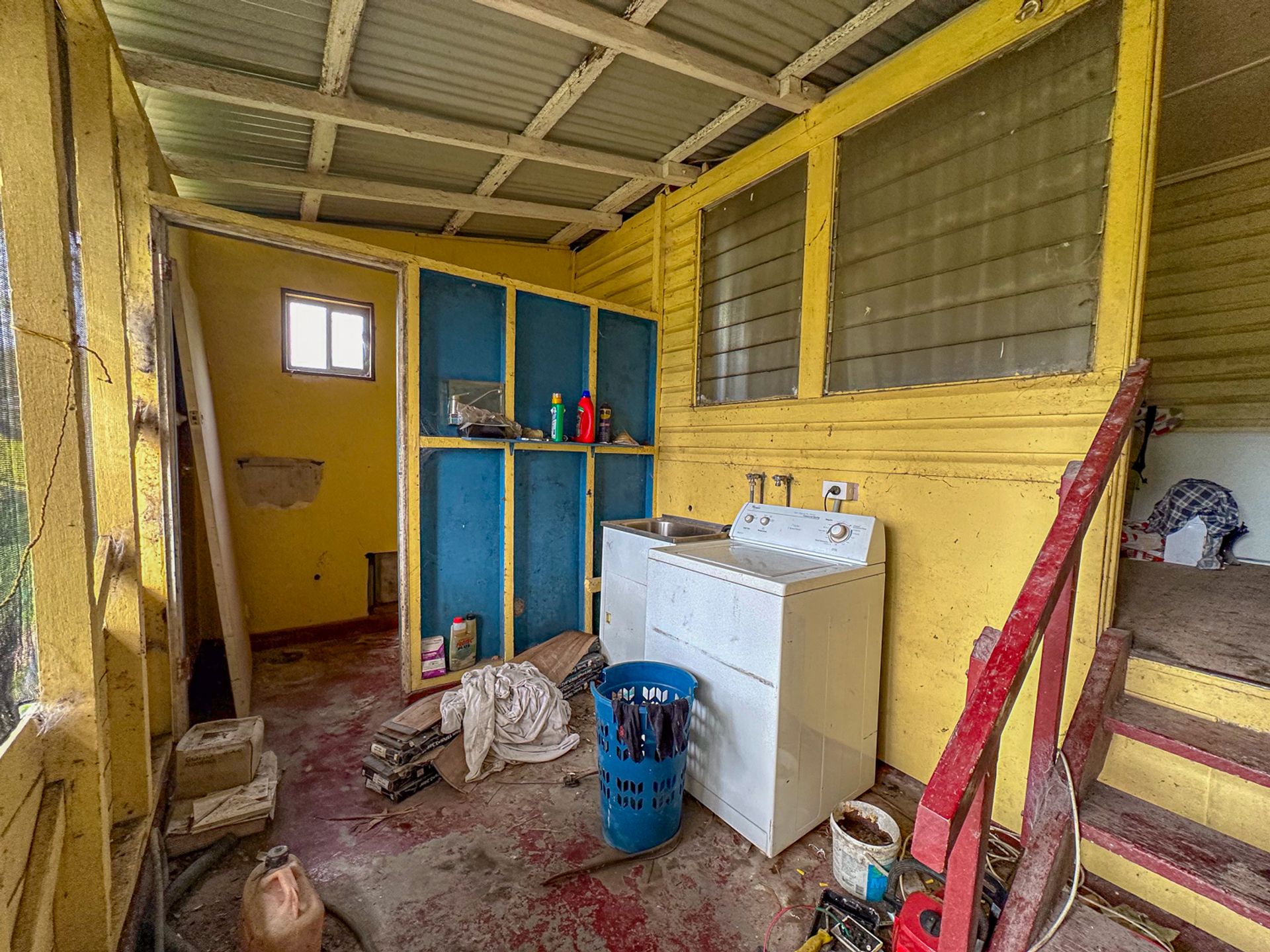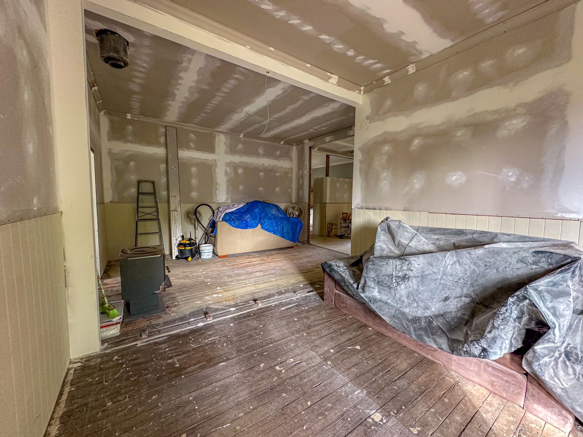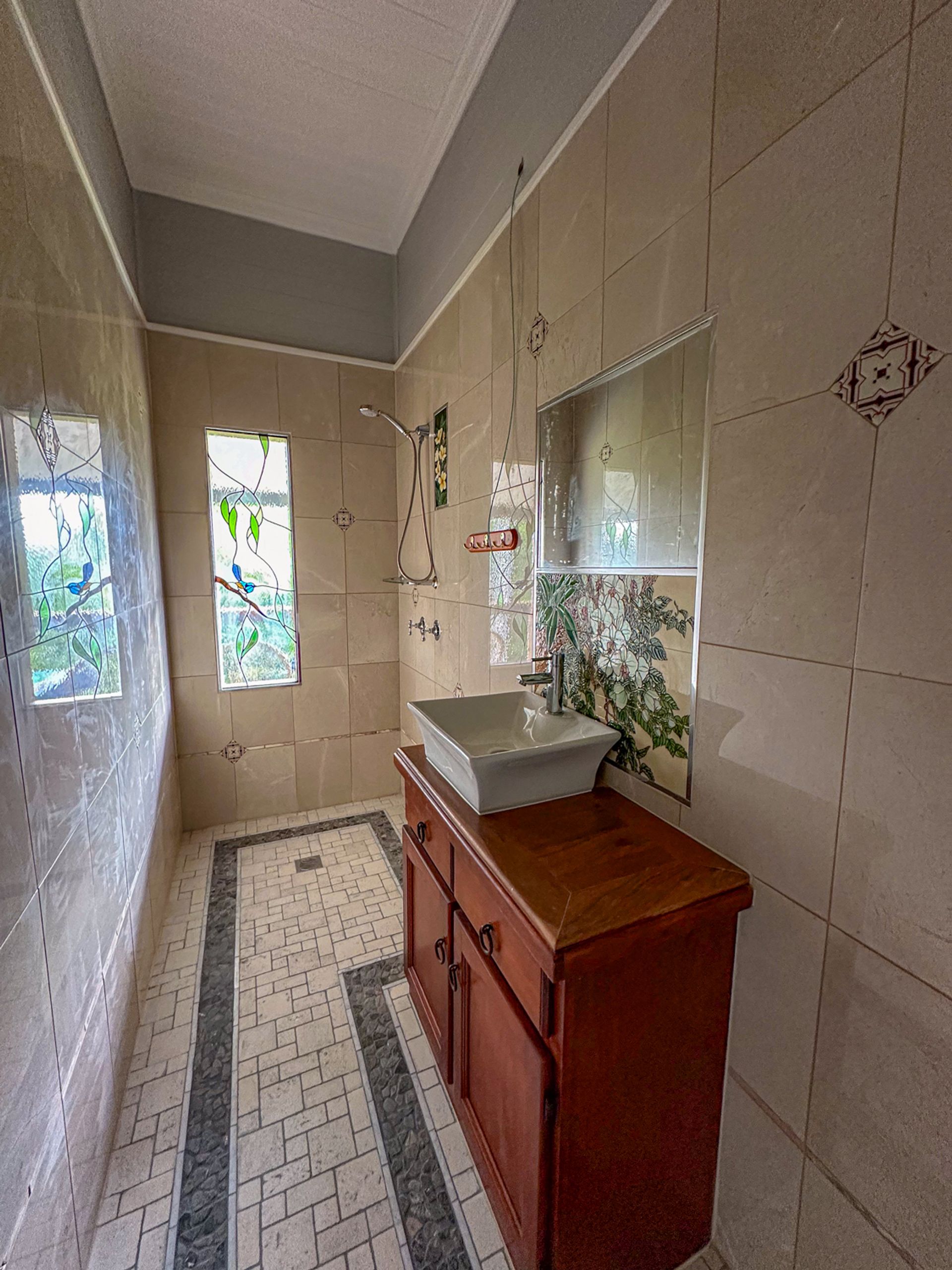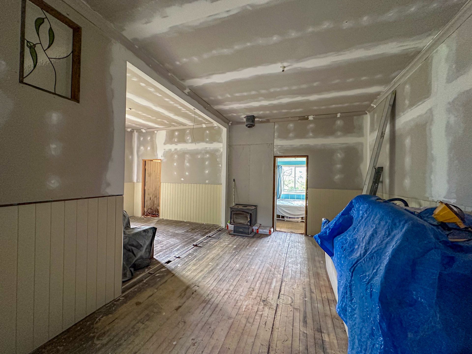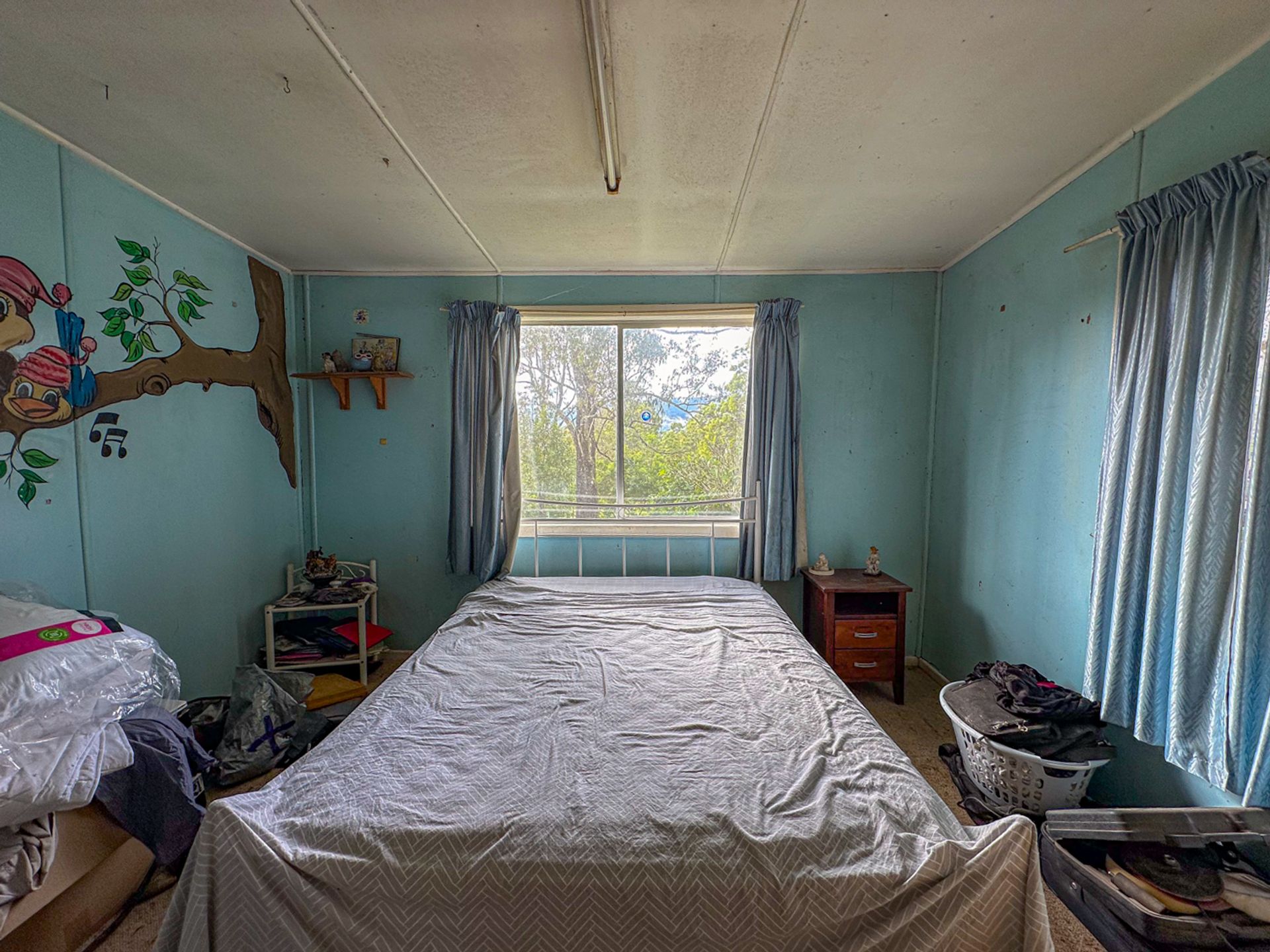 The main bedroom flows out onto the northern deck. Fortunately it has been renovated along with the ensuite with more travertine stone tiling. The original bathroom has had a renovation a few years back and is is fair condition. There are another two bedrooms which are of an older condition. There is a wood heater that has been dissembled for renovation purposes.
