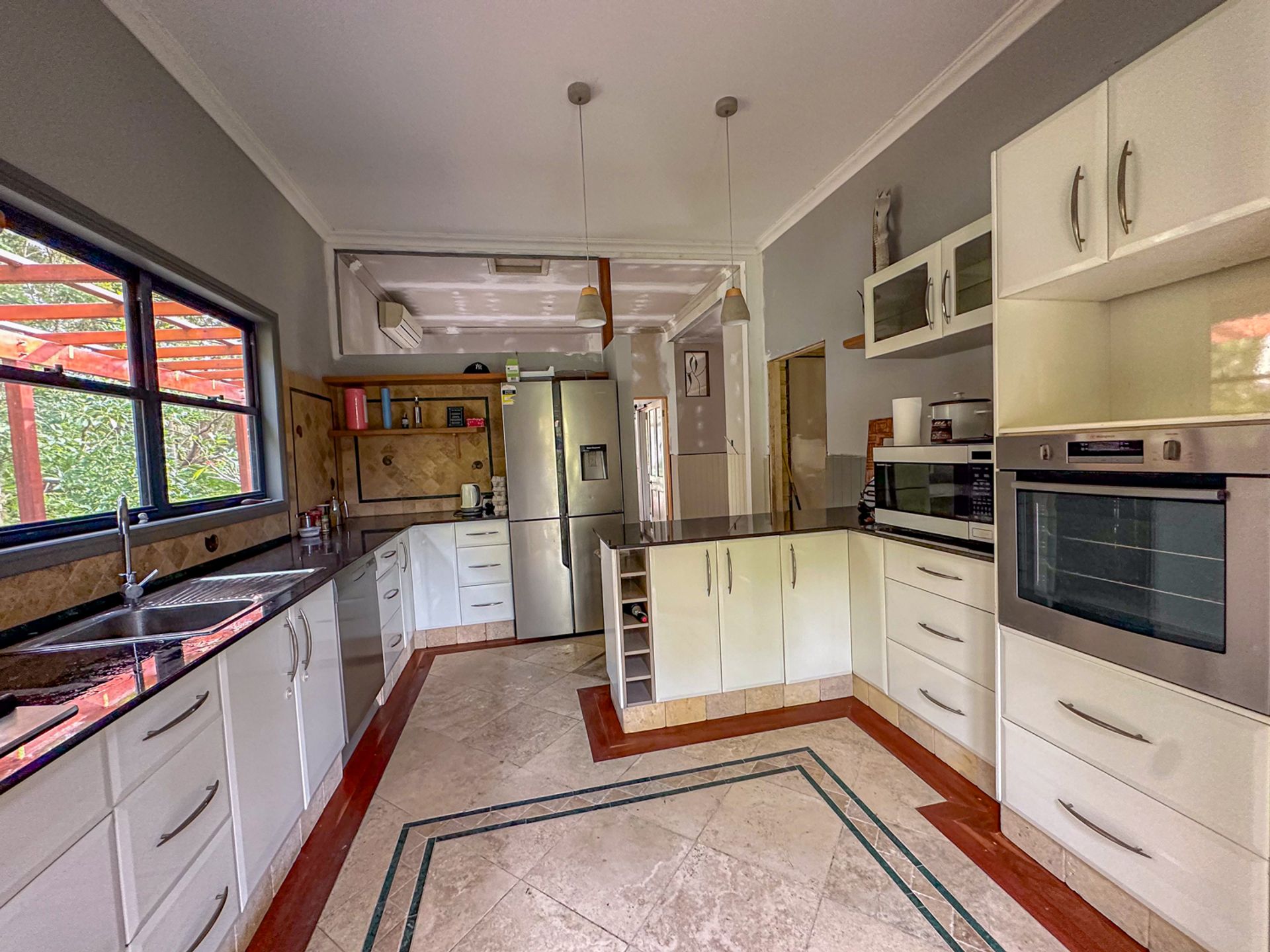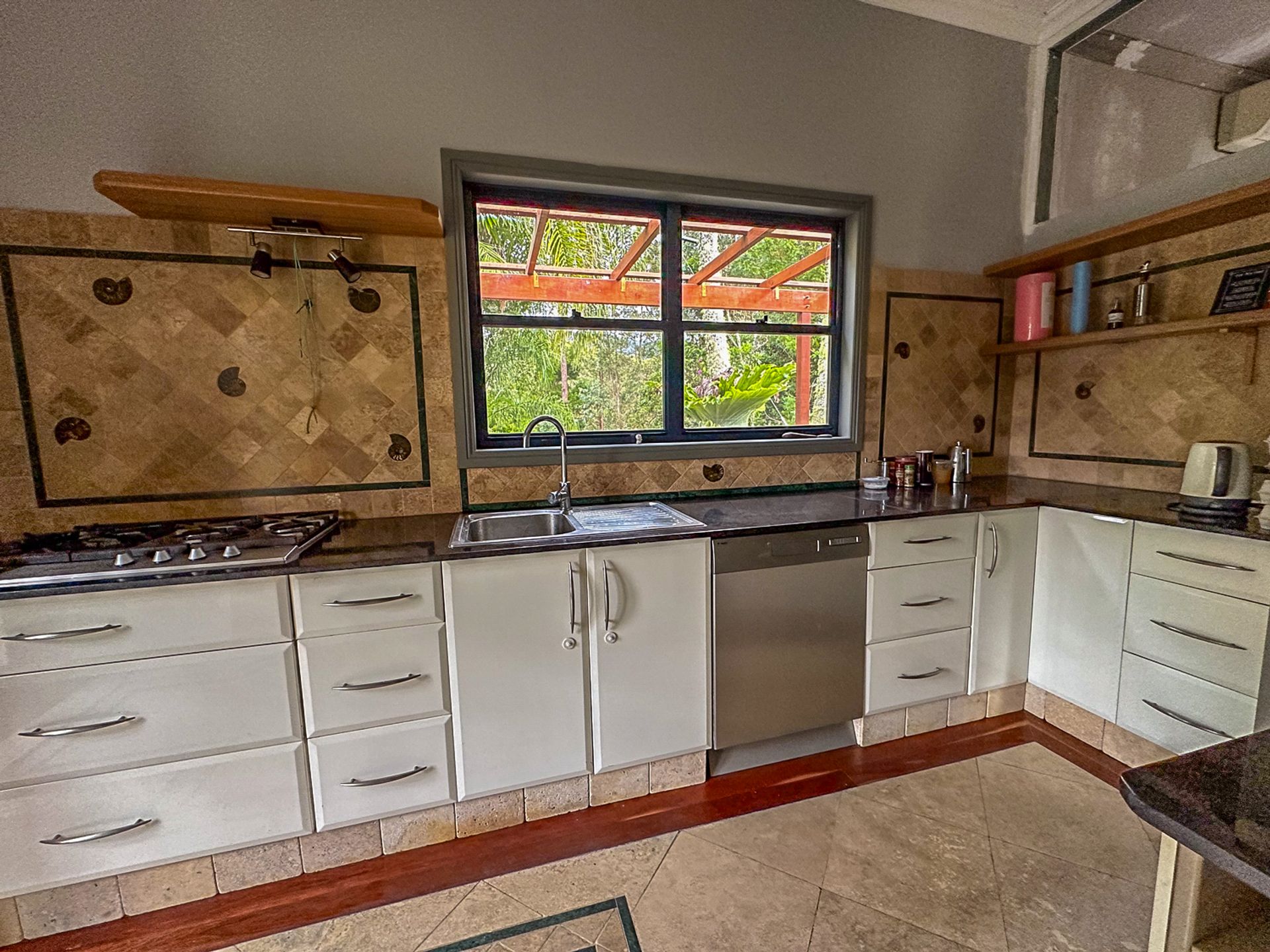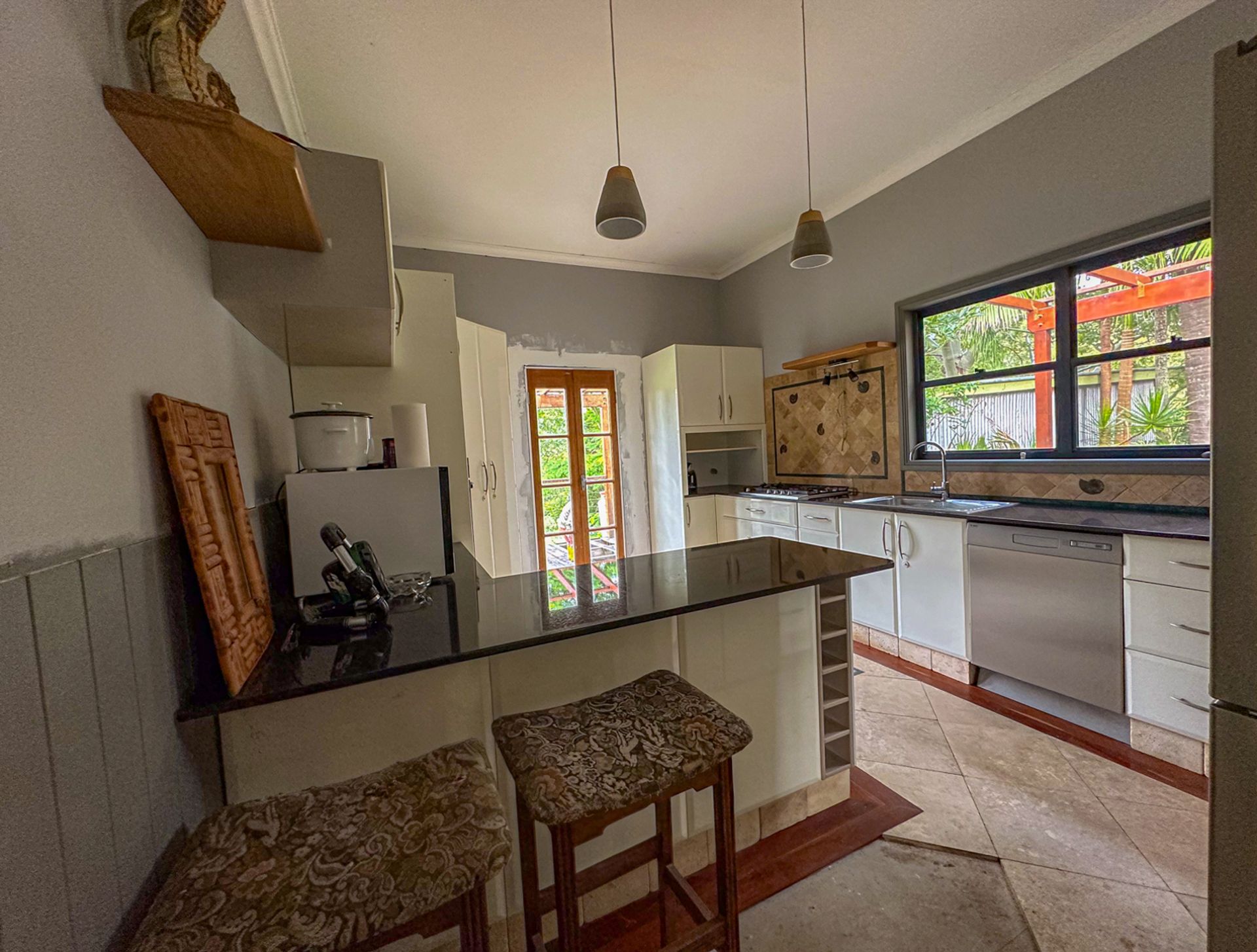 The owner has been the resident for nearly 20 years and has decided that it is time to sell. The kitchen has been renovated with granite bench tops, soft close draws and a dishwasher, it flows out onto the southern deck. Lots of craftsmanship has been applied to the travertine stone kitchen floor which is nearly finished. VJ panels are on feature through parts of the house. Other walls have been replaced with villa board to feature wainscotting panelling and so far just gyprock on the walls of the lounge/dining area.