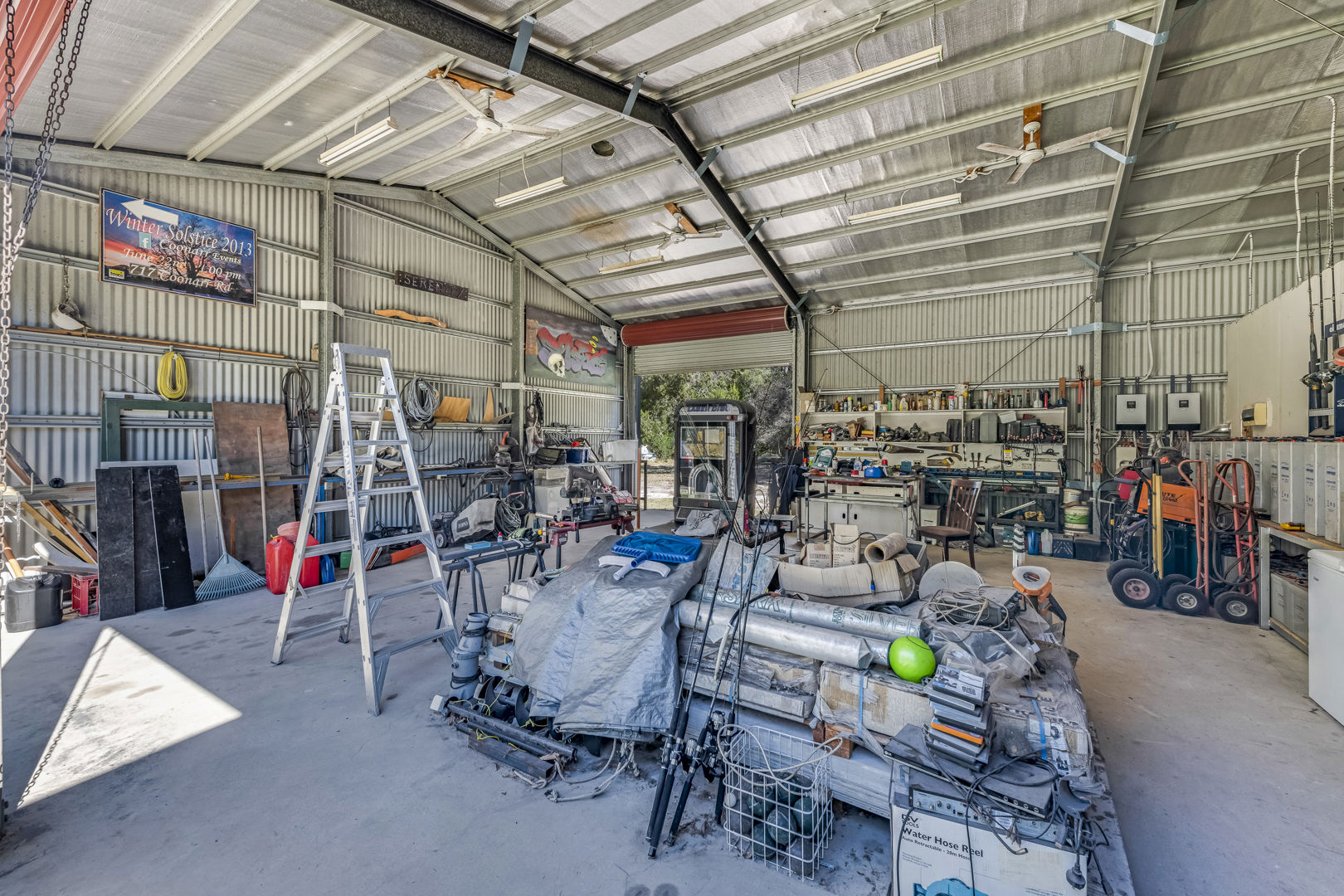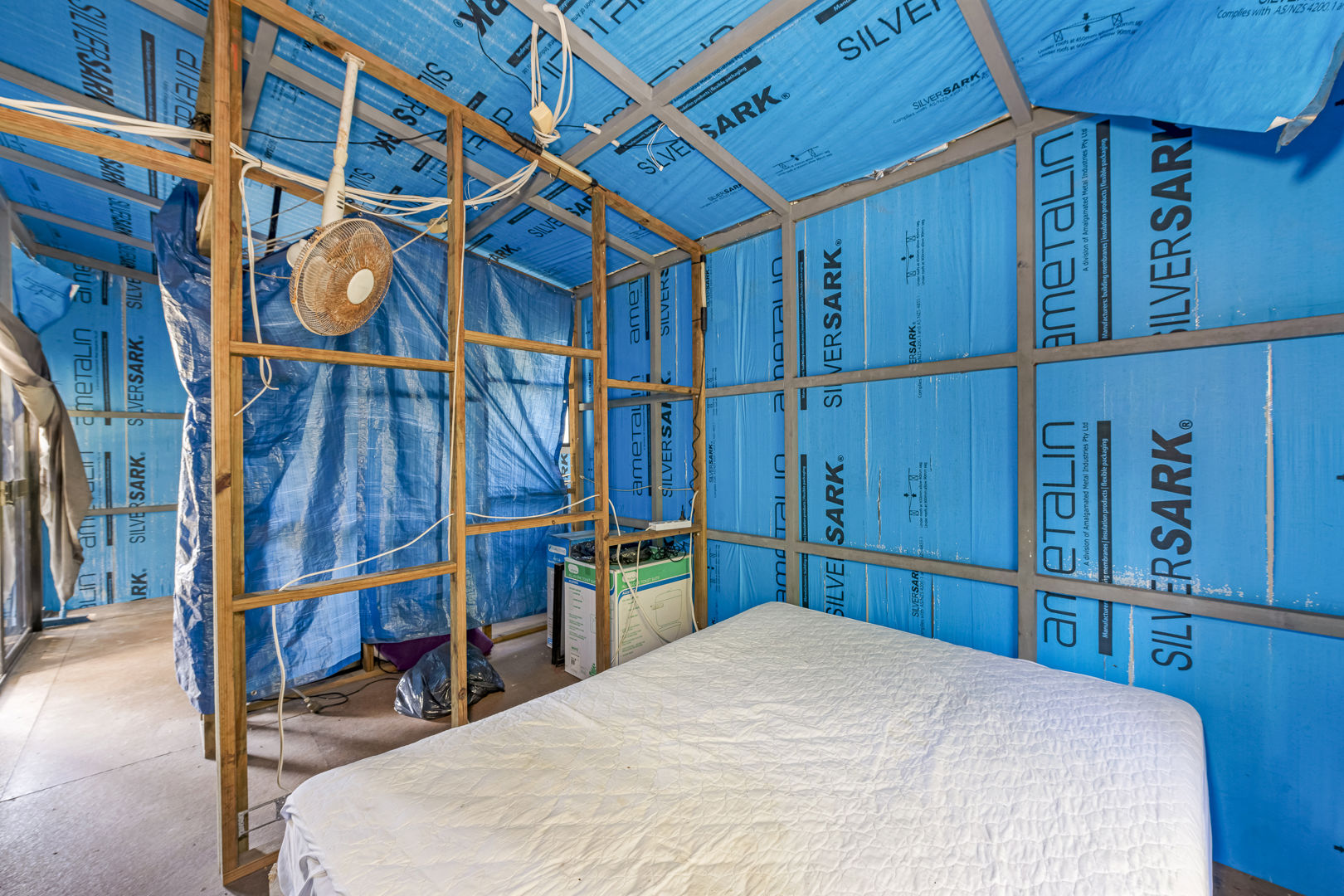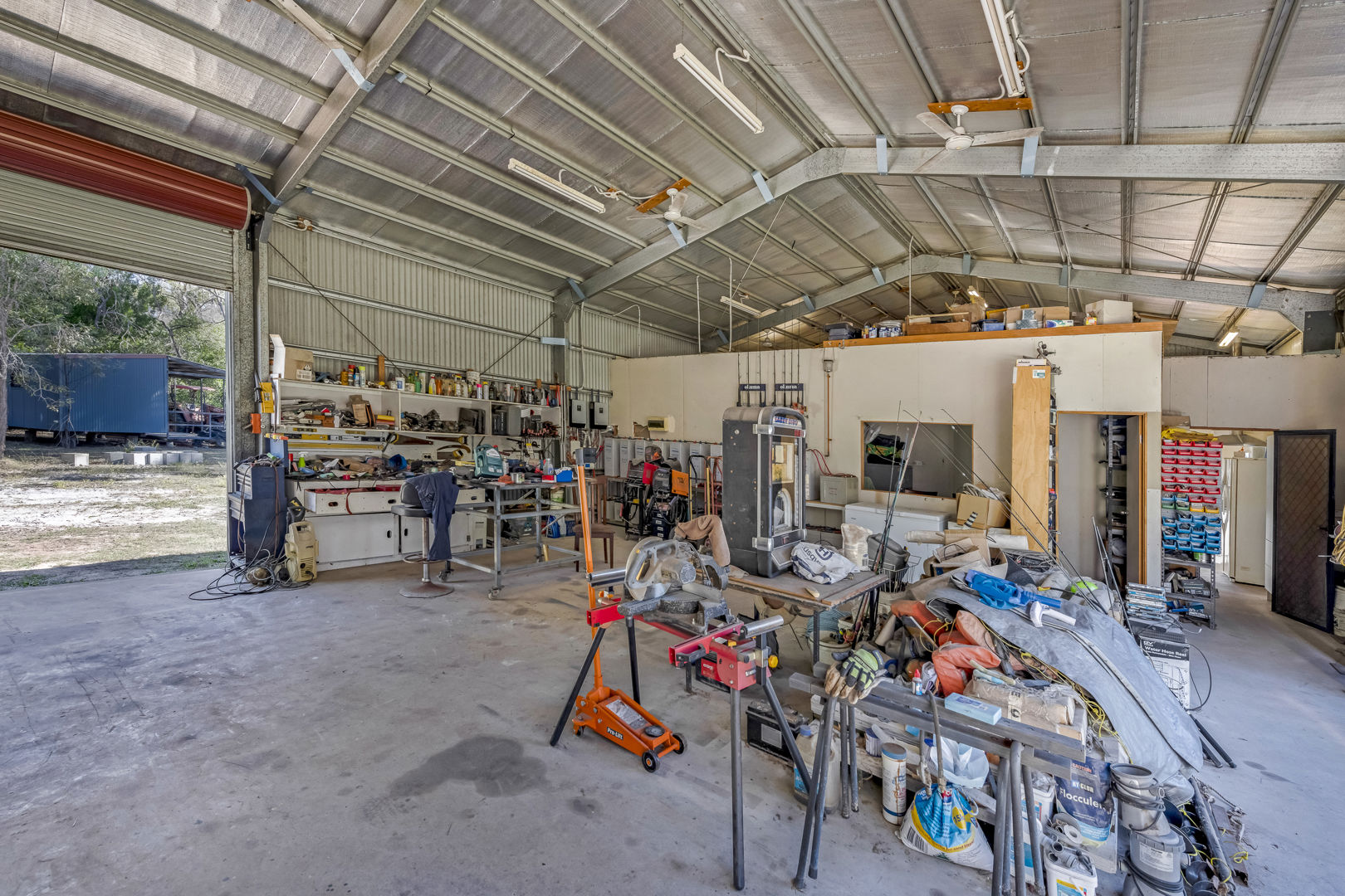 - Off Grid 16m x 9m x 3.8m (wall height) High Clearance Shed with Insulated Roof, Office, Living Space, Concrete Floor, Power, Lights & Ceiling Fans