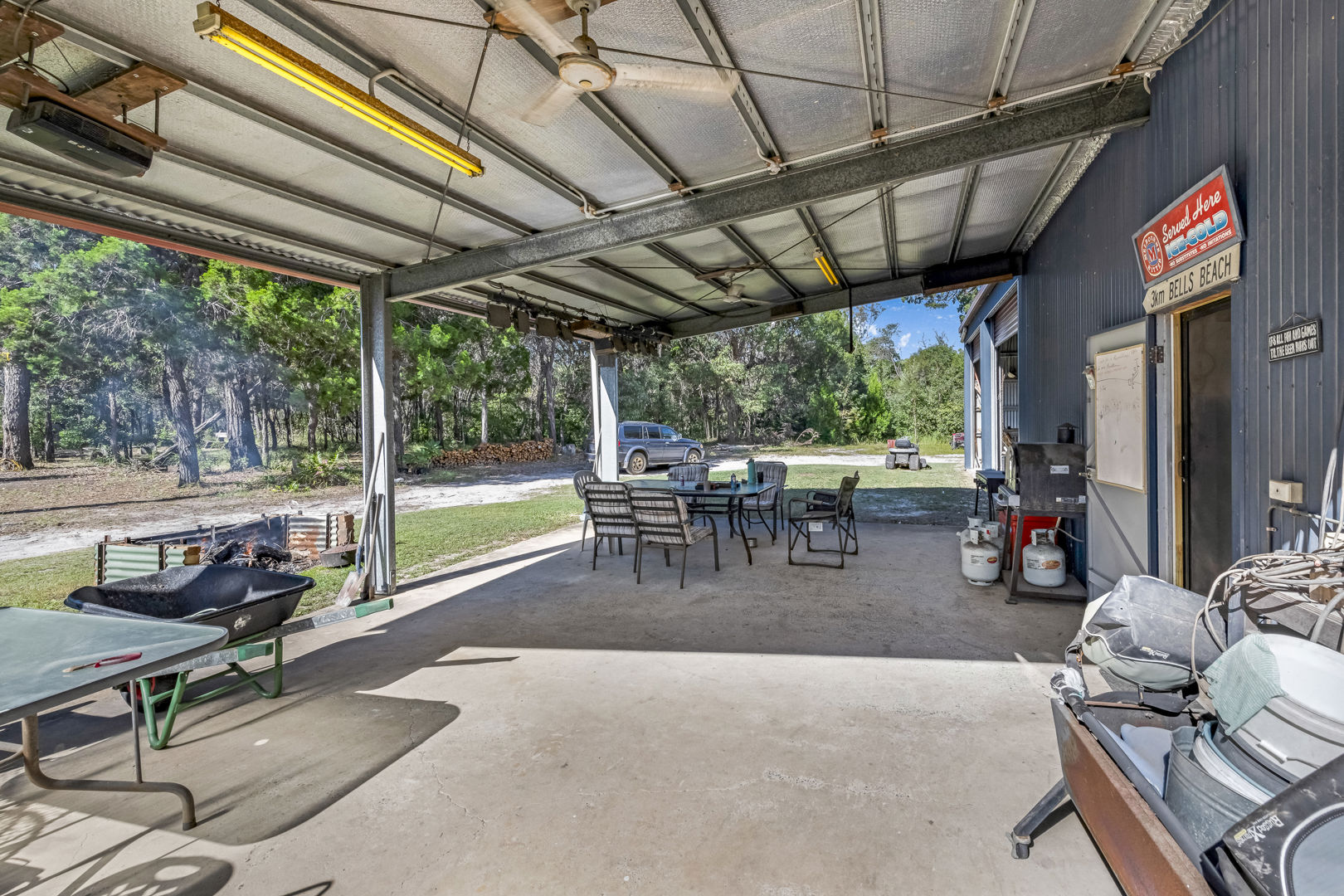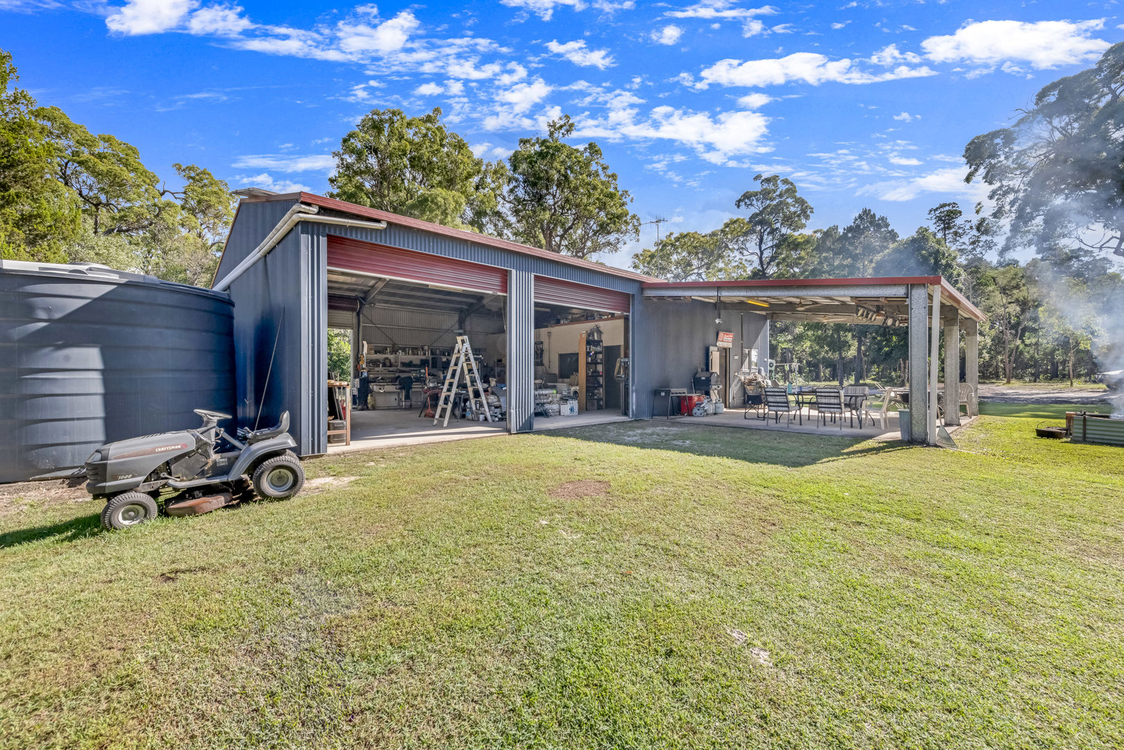 For those seeking off-grid living, the property features a high-clearance shed with an insulated roof, complete with an office, living space, concrete floor, power, lights, and ceiling fans. A robust 10kw solar system, consisting of 38 panels and 24 batteries, ensures energy independence. Additionally, two 10kw diesel generators serve as backup power sources, while two 22,500L rainwater tanks secure your water needs.